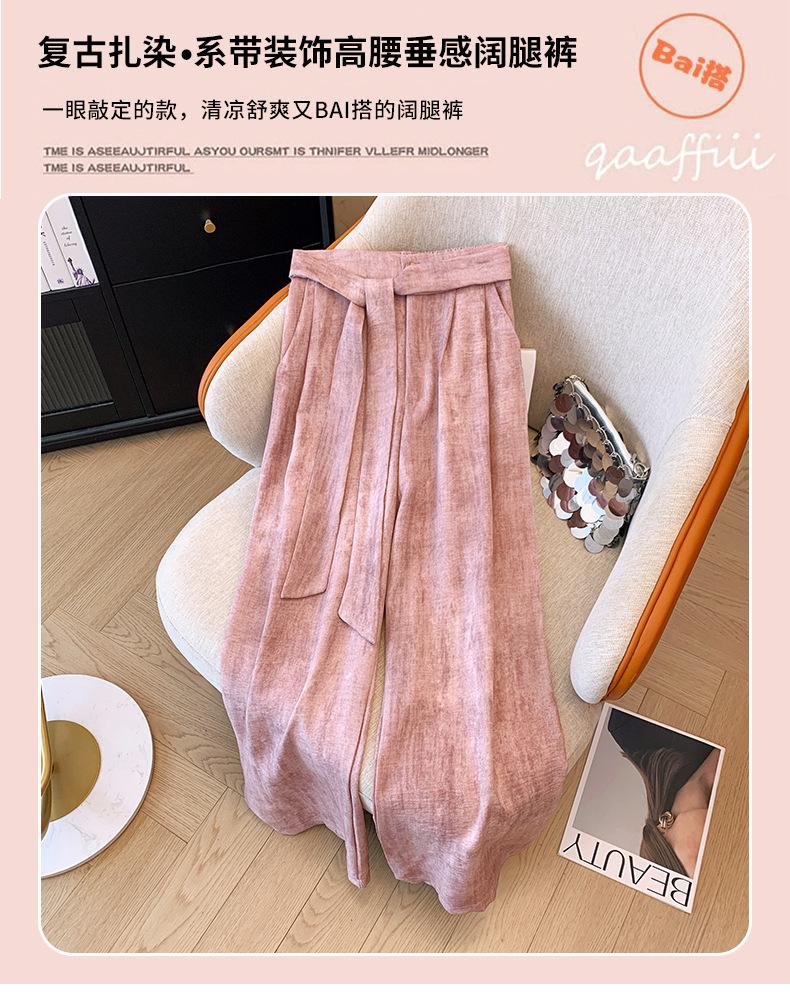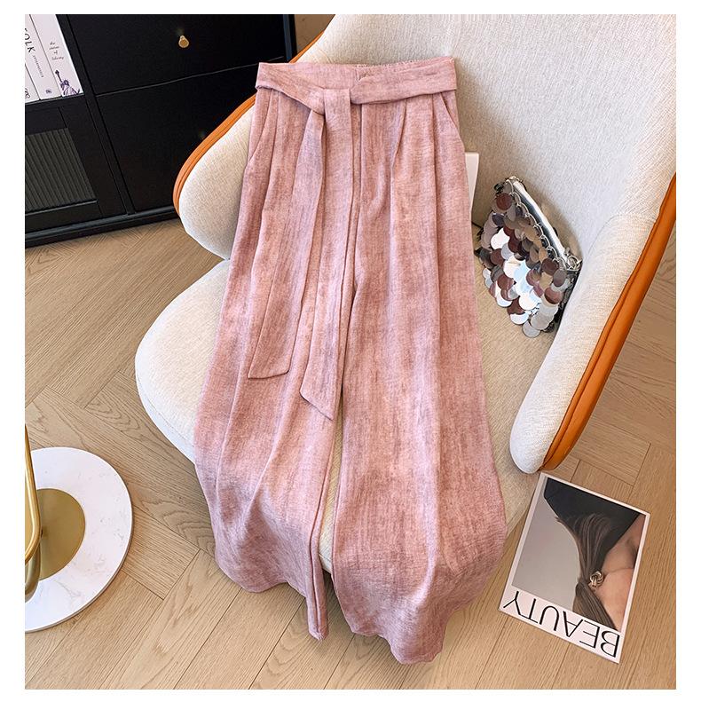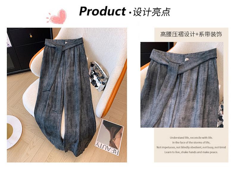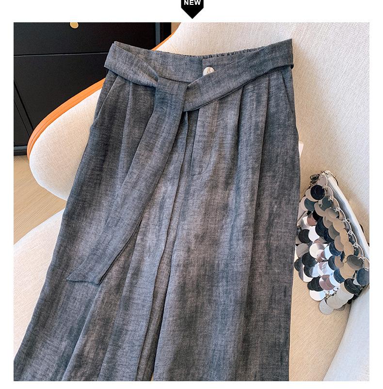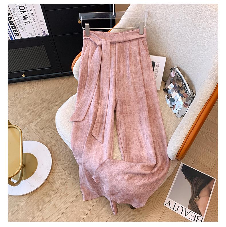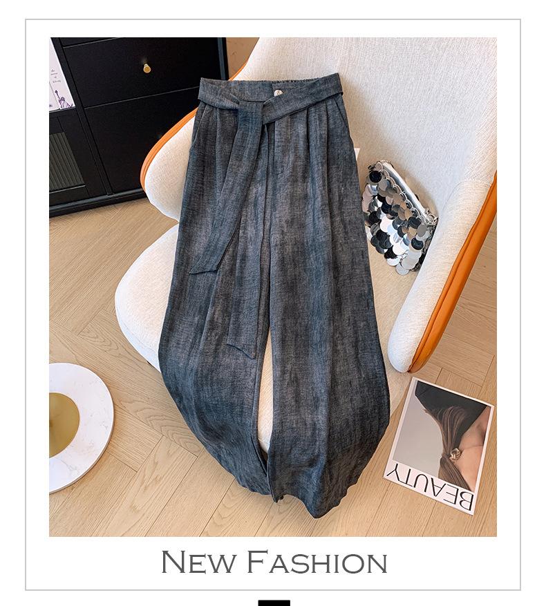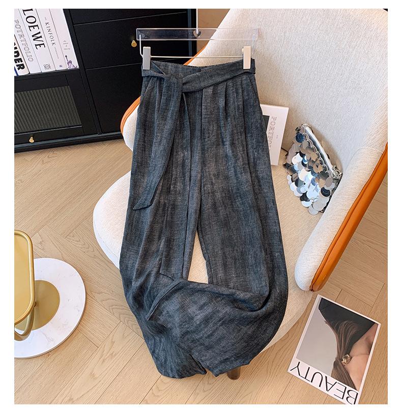 Pantalones anchos de cintura alta de lino teñido anudado de seda helada para mujer, pantalones casuales rectos de cintura alta, primavera 2025
