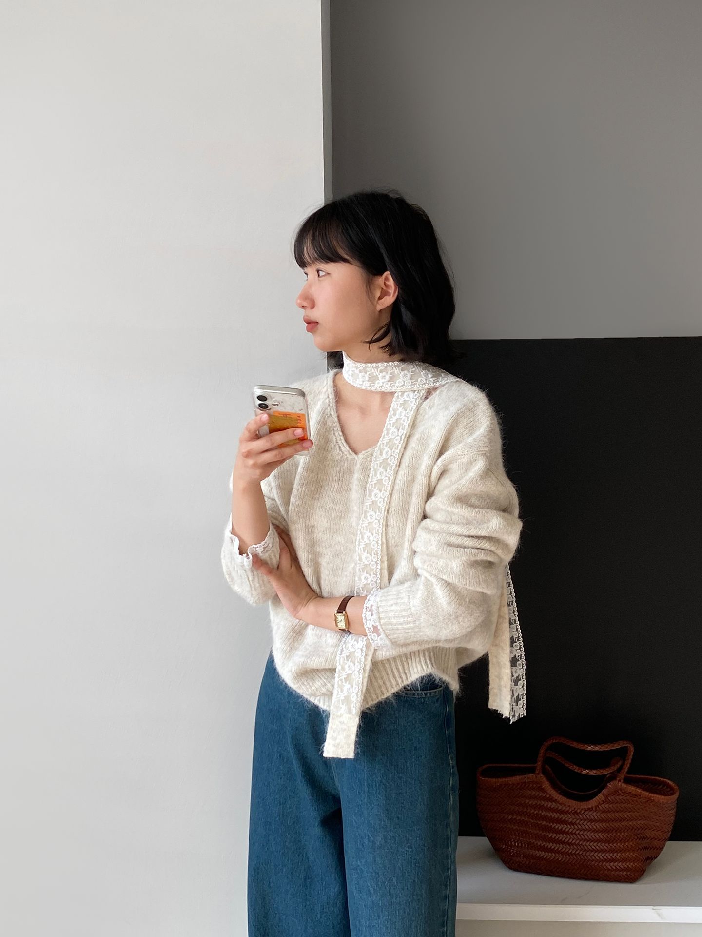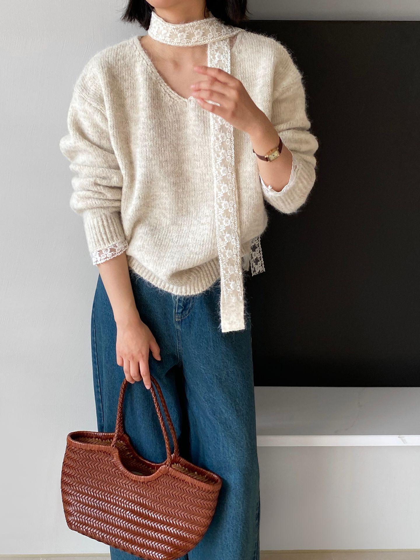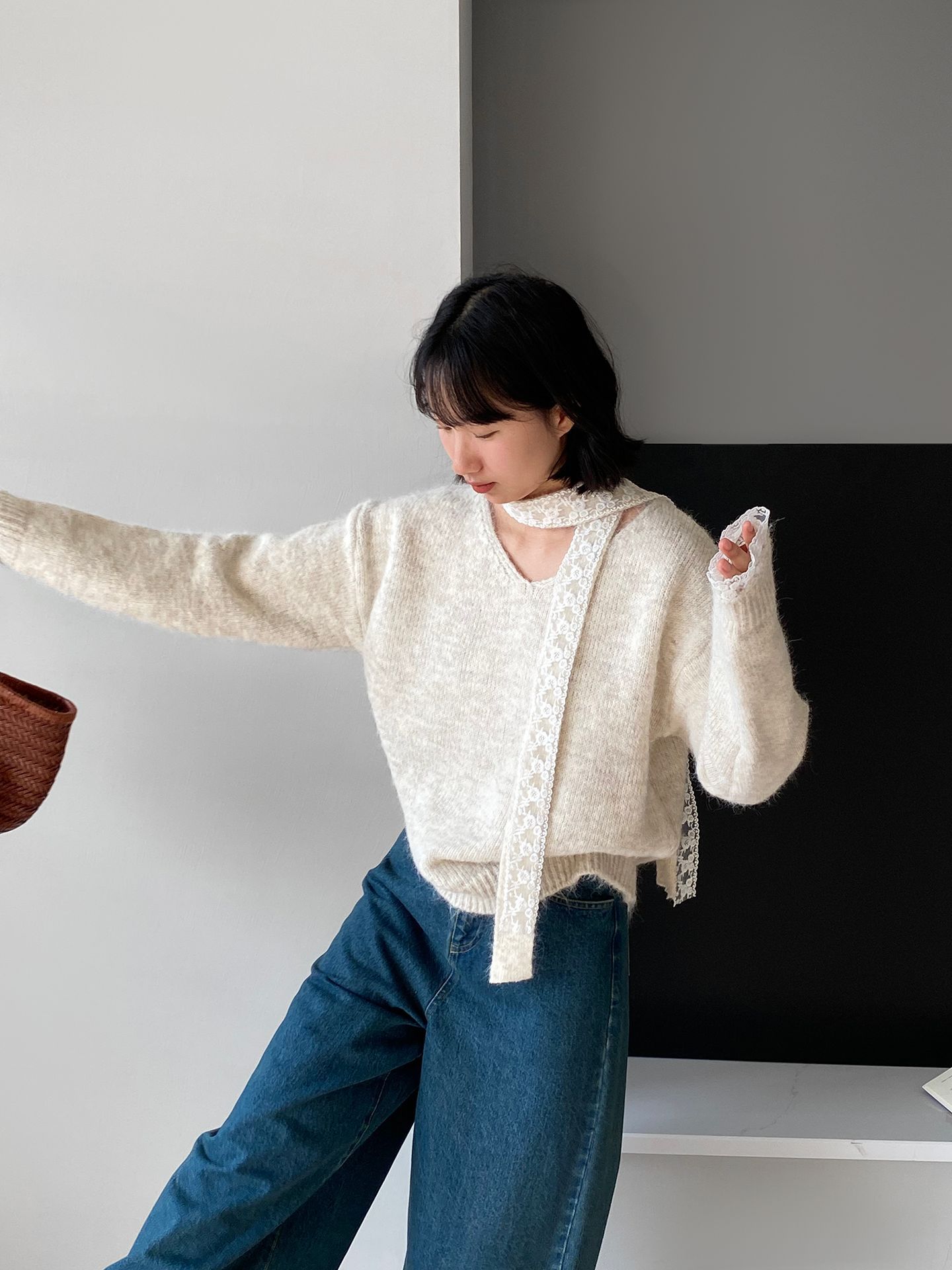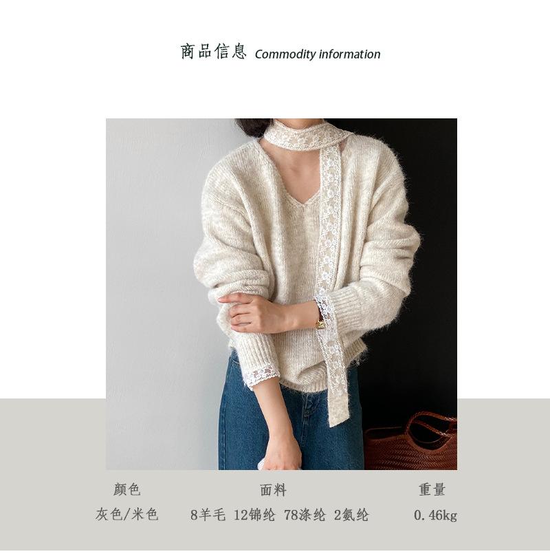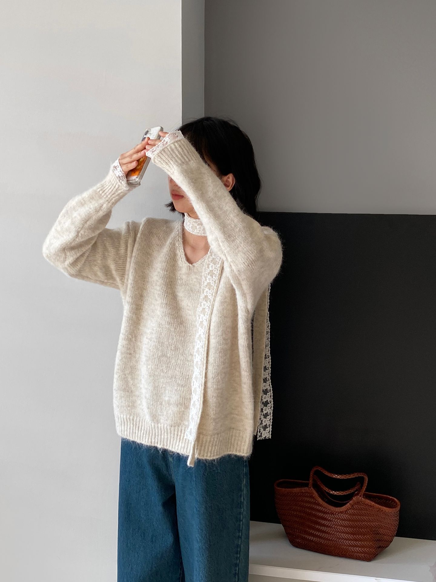 Suéter de punto suelto coreano de manga larga con cuello en V y cinta de encaje suave y ceroso de Jiangzuo para mujer, primavera y otoño, 8593