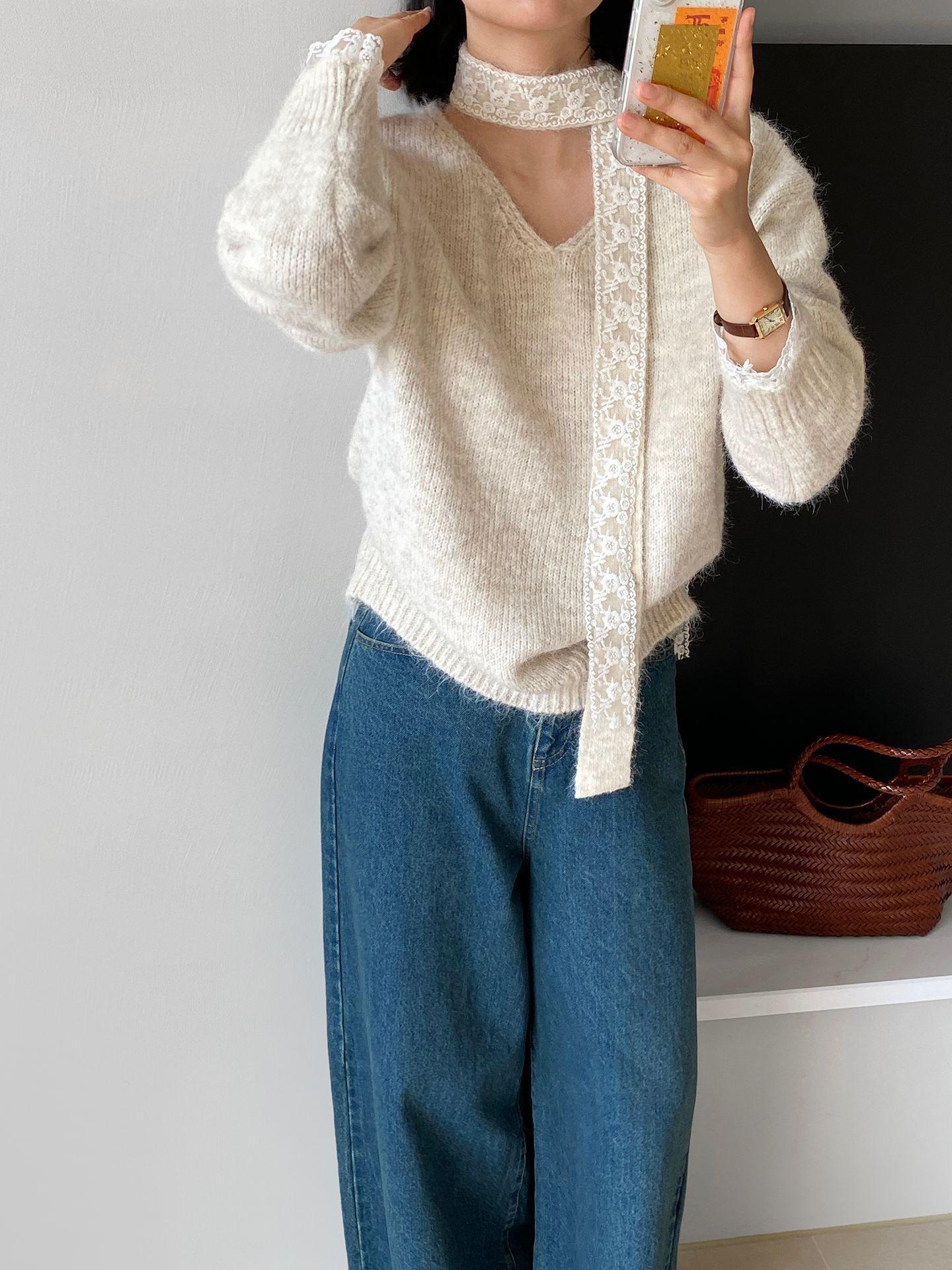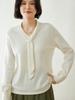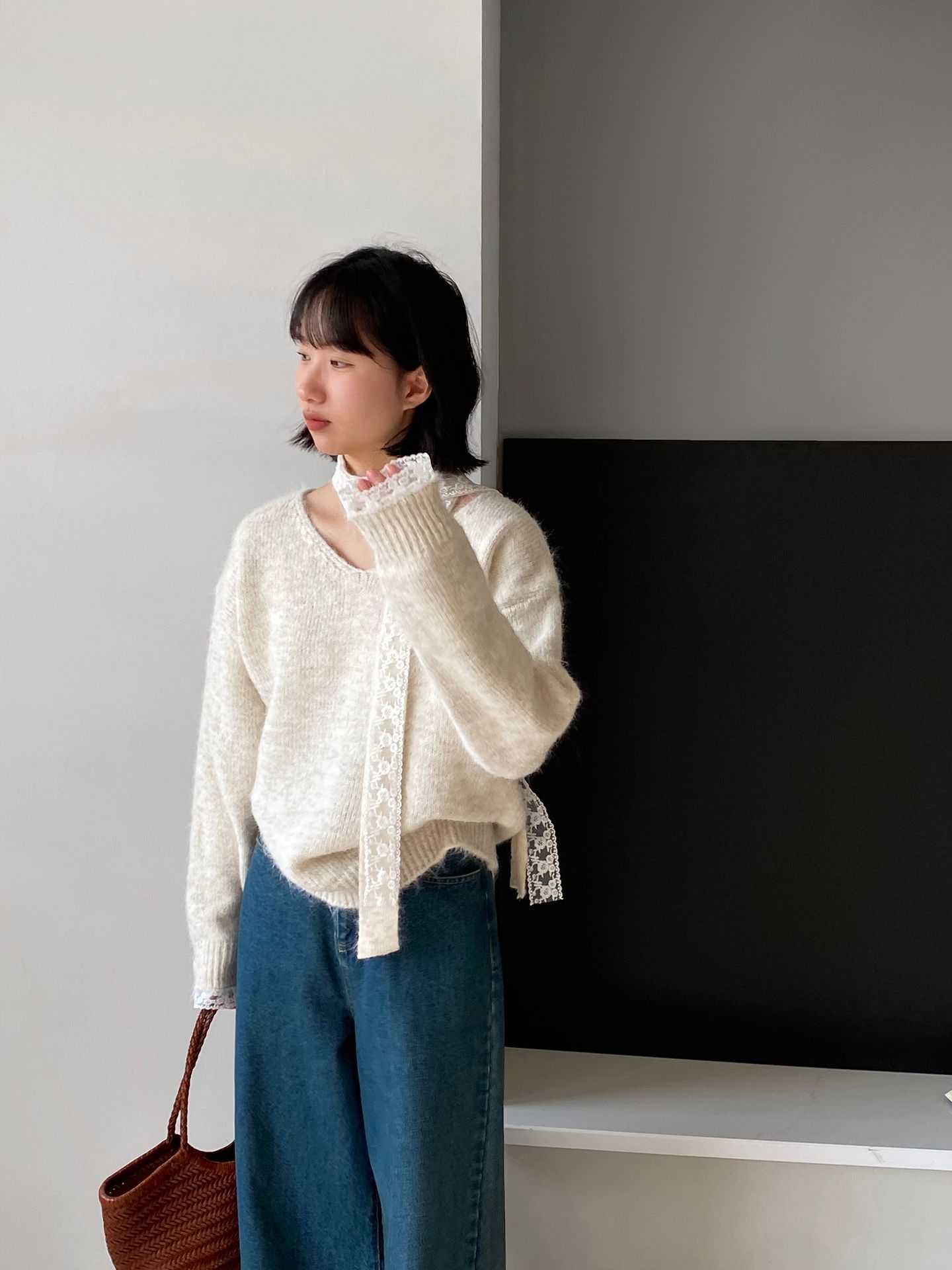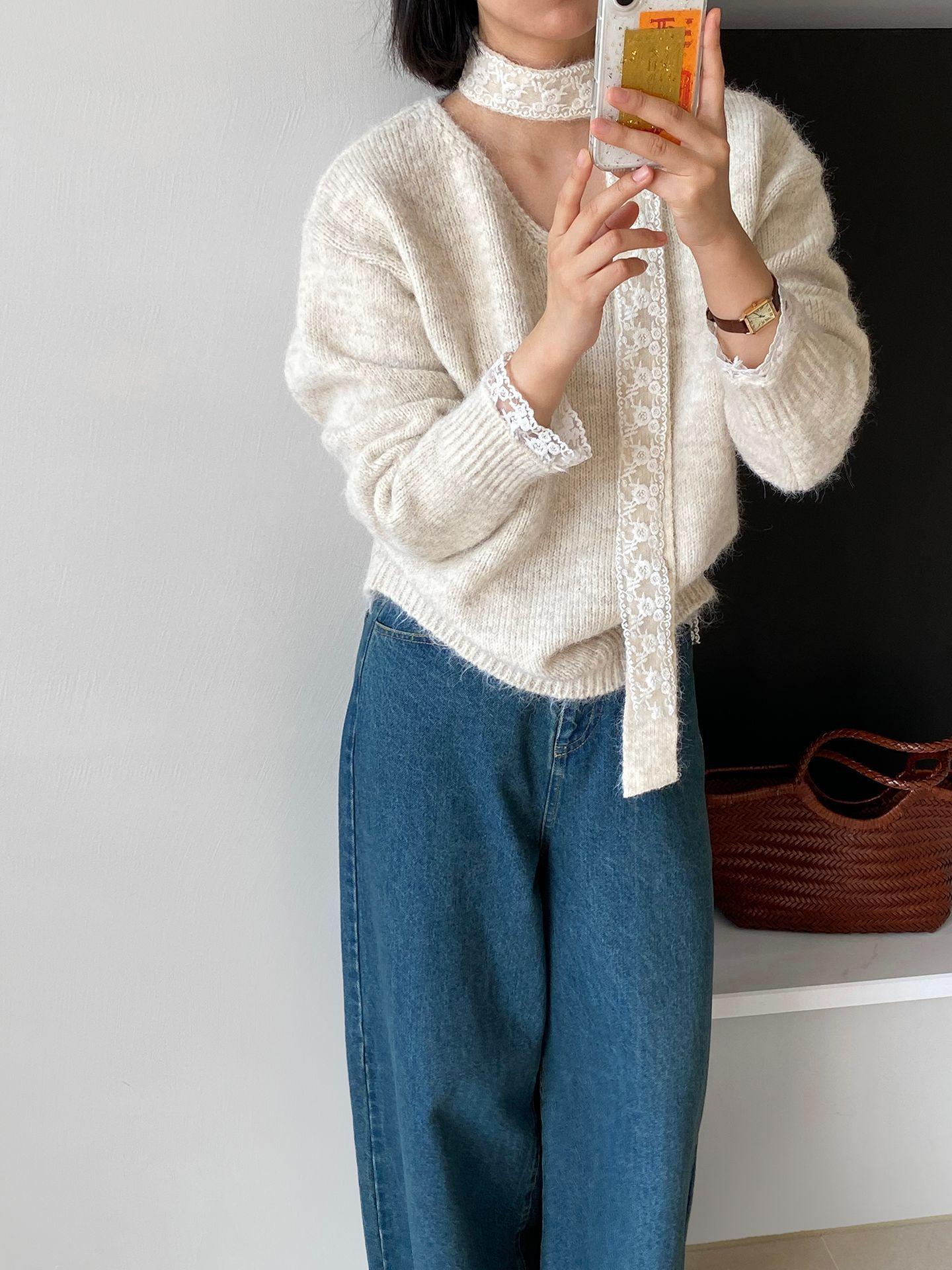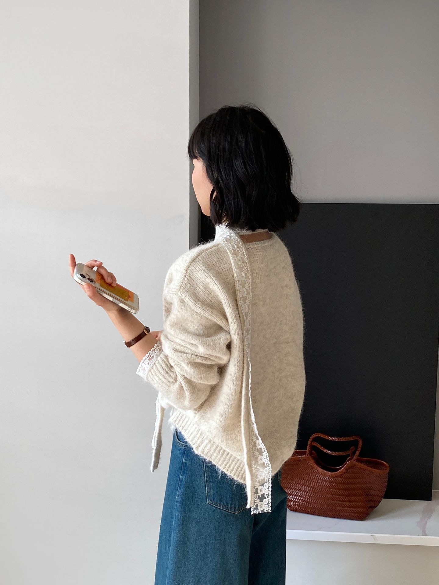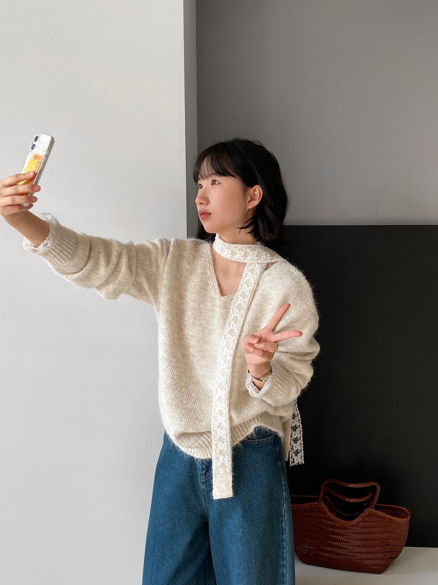 Suéter de punto suelto coreano de manga larga con cuello en V y cinta de encaje suave y ceroso de Jiangzuo para mujer, primavera y otoño, 8593