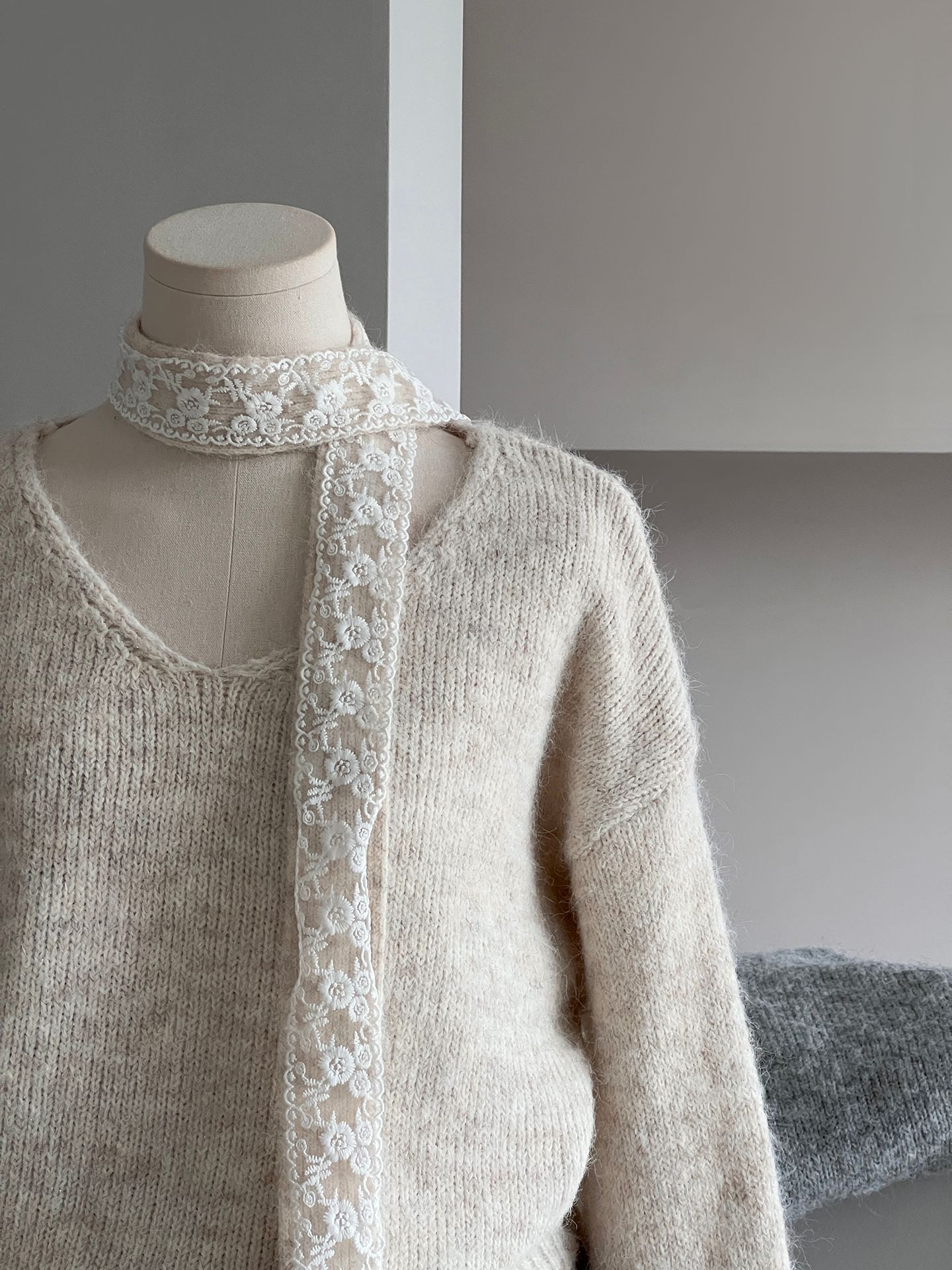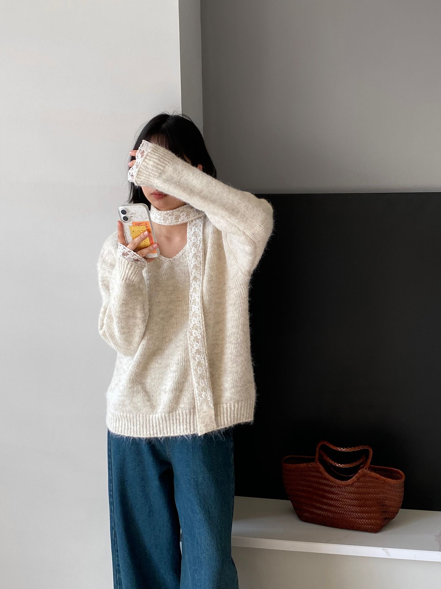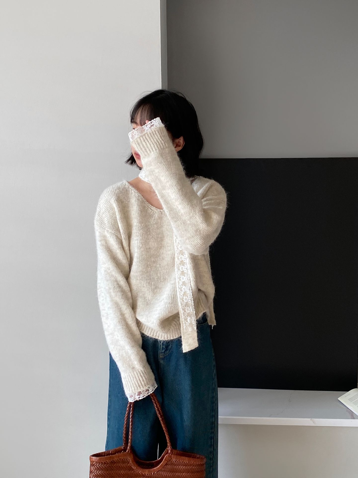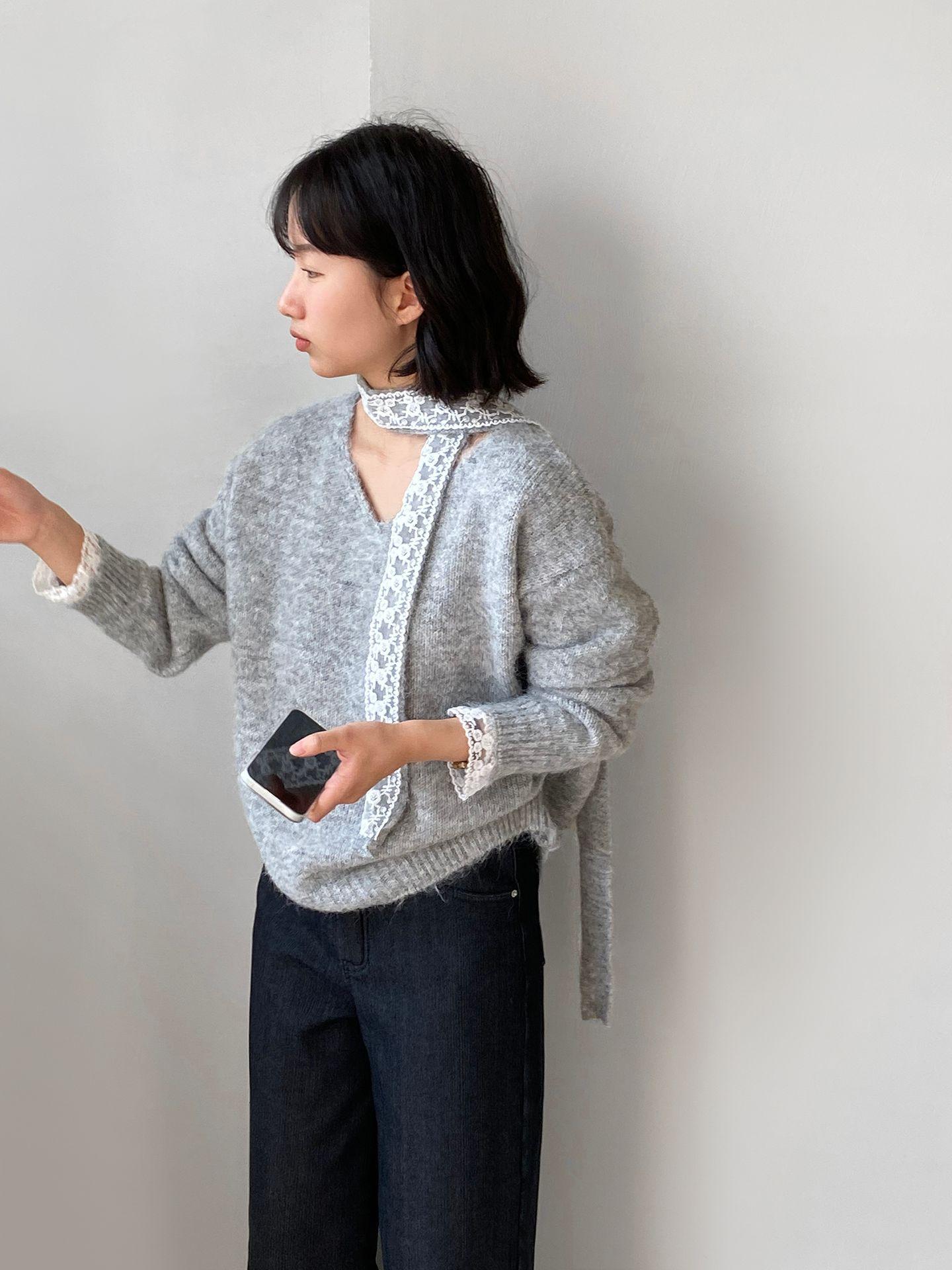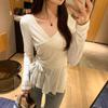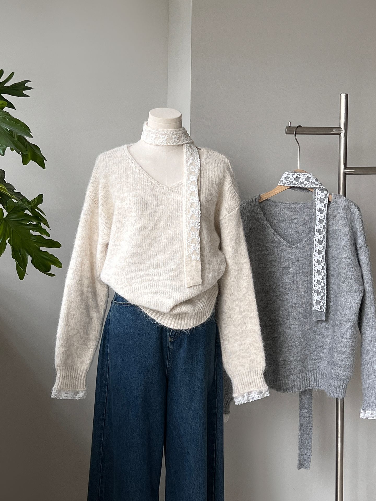 Suéter de punto suelto coreano de manga larga con cuello en V y cinta de encaje suave y ceroso de Jiangzuo para mujer, primavera y otoño, 8593