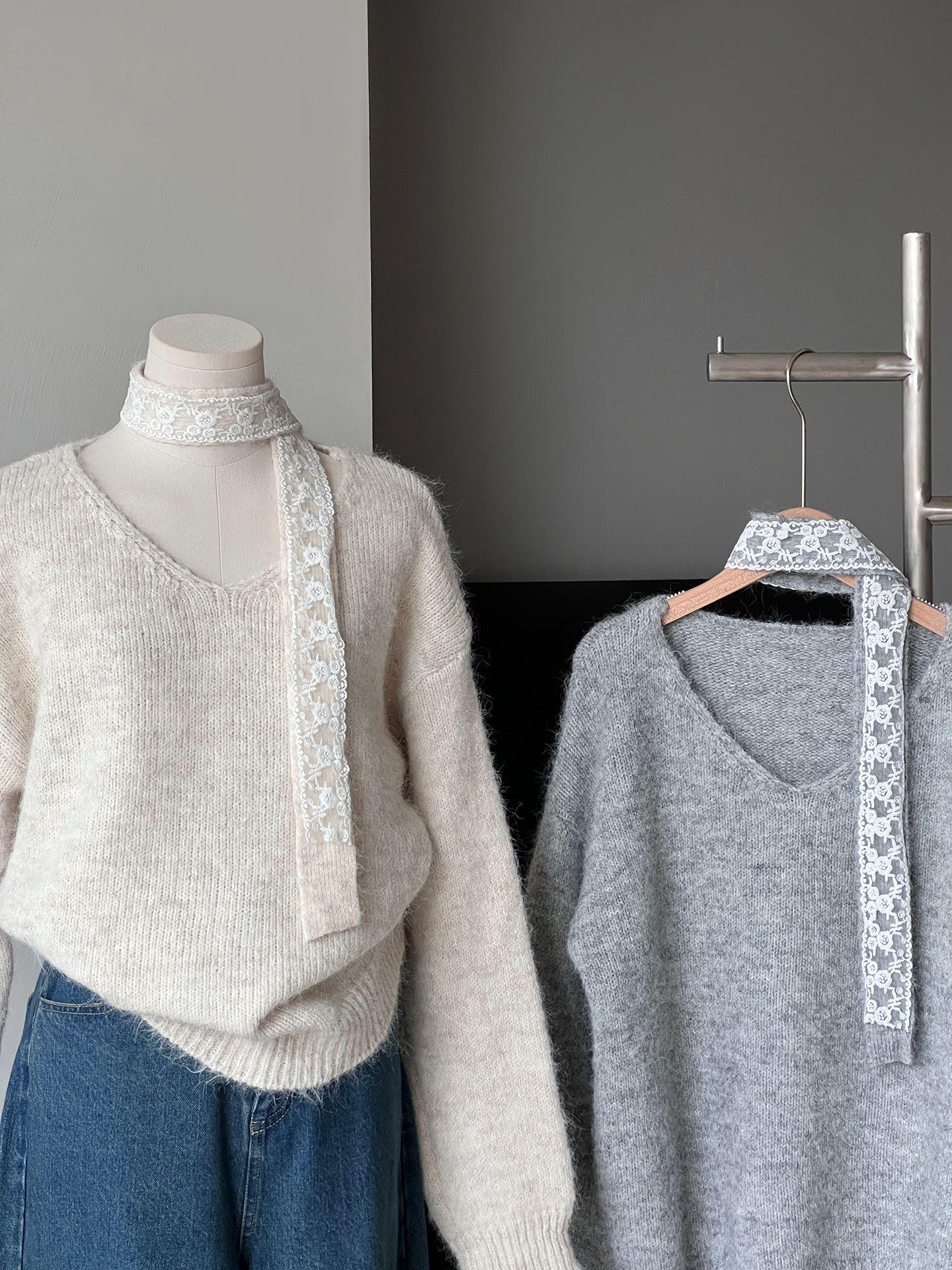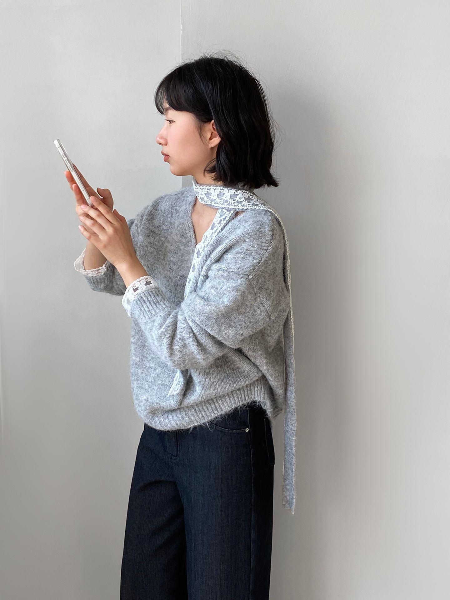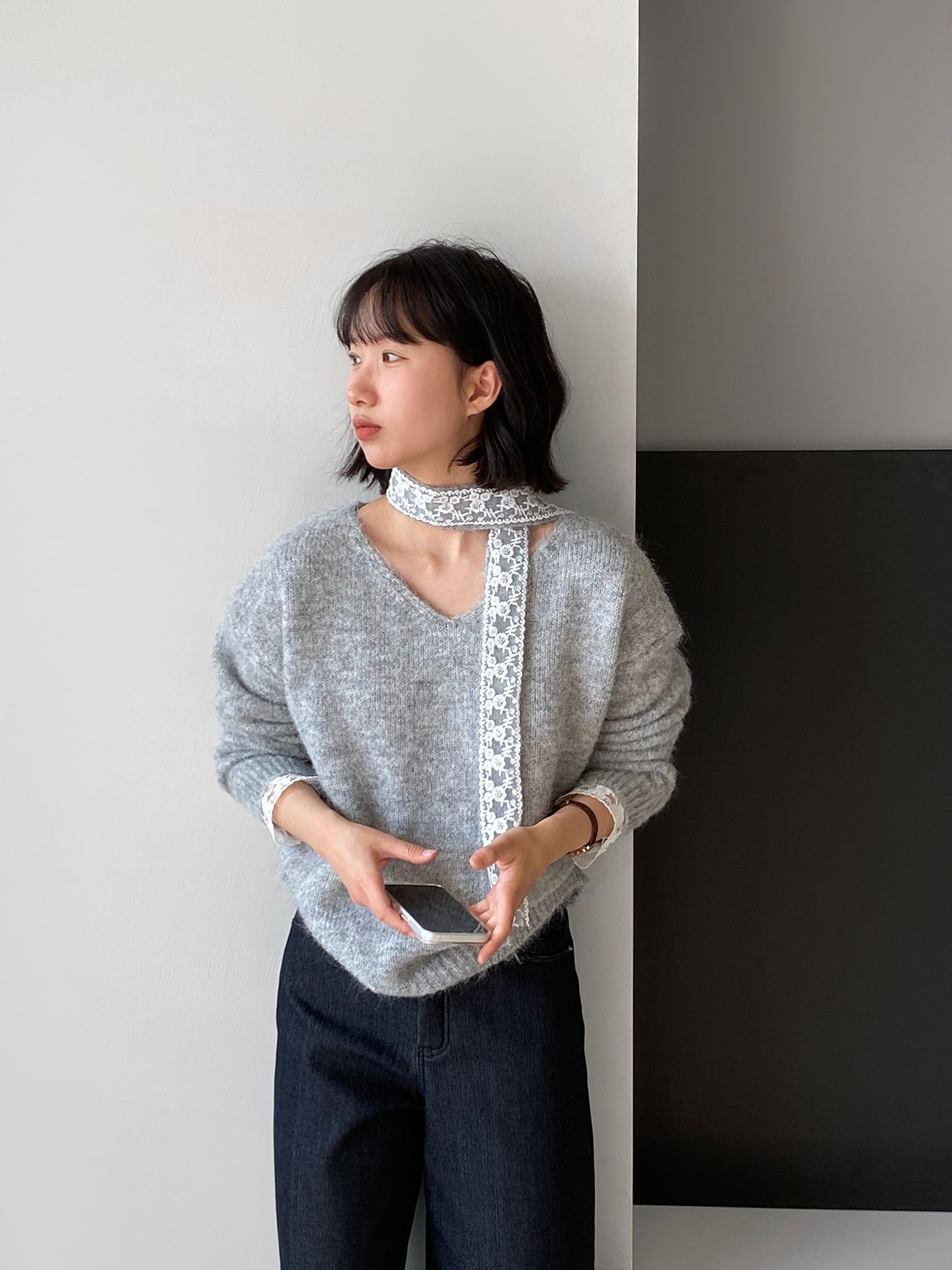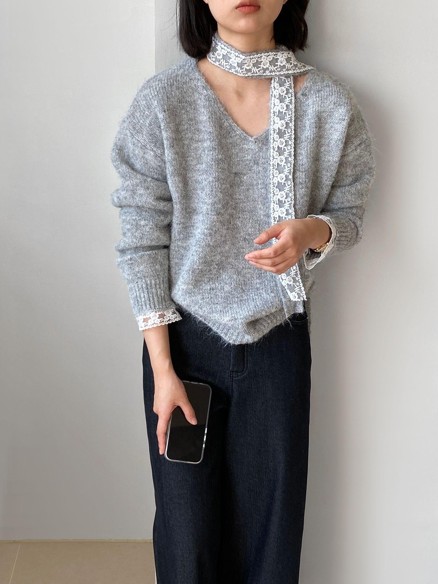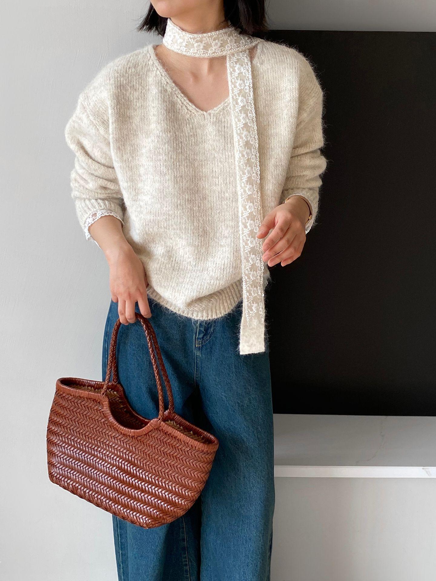 Suéter de punto suelto coreano de manga larga con cuello en V y cinta de encaje suave y ceroso de Jiangzuo para mujer, primavera y otoño, 8593