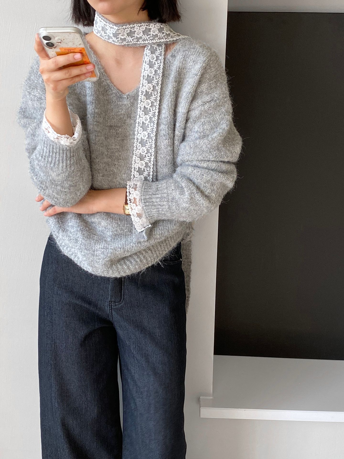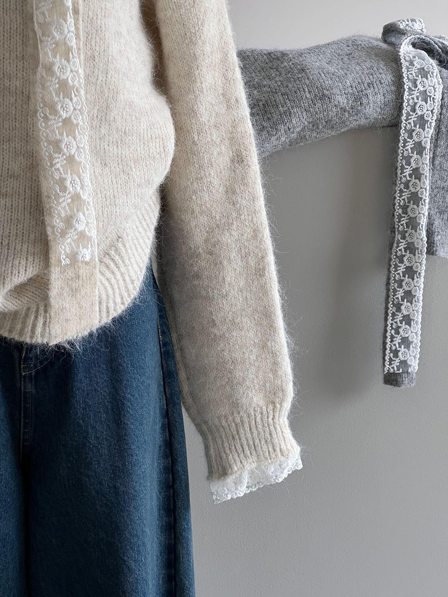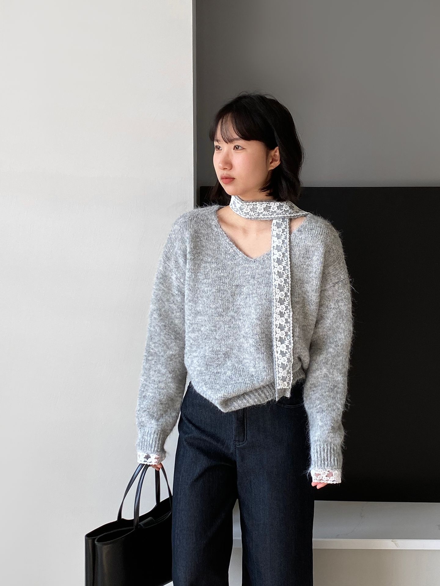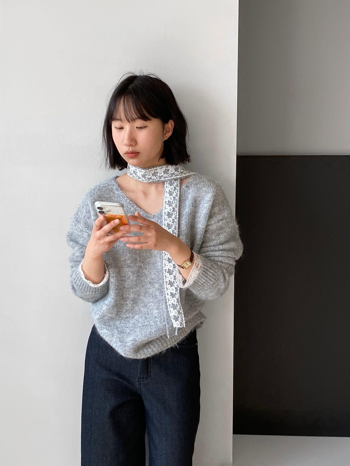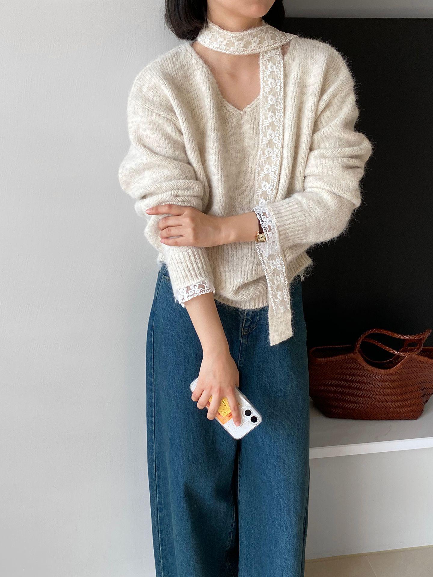 Suéter de punto suelto coreano de manga larga con cuello en V y cinta de encaje suave y ceroso de Jiangzuo para mujer, primavera y otoño, 8593
