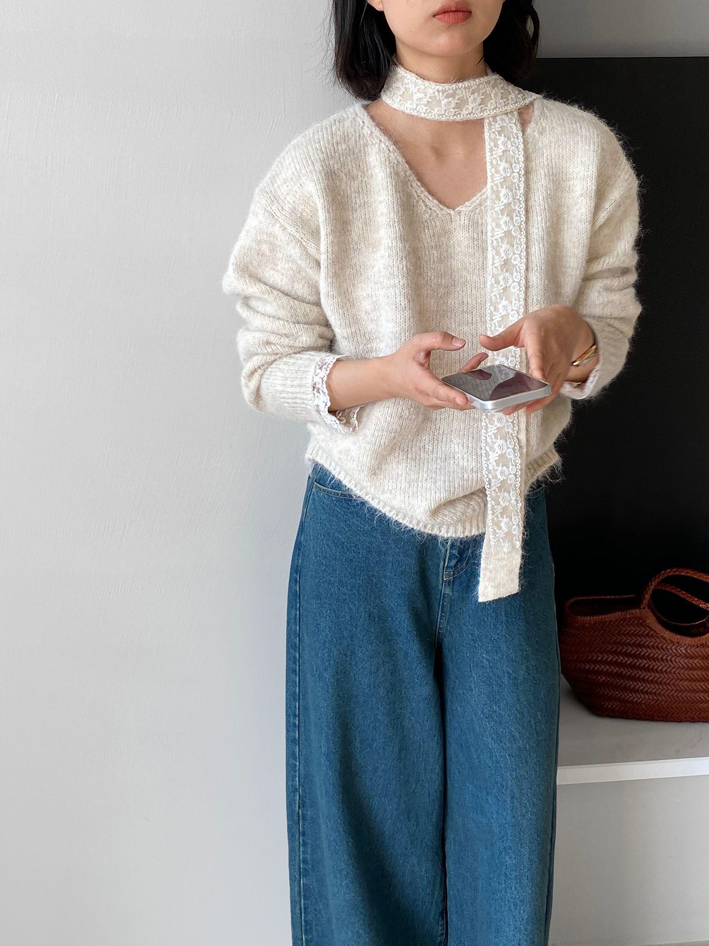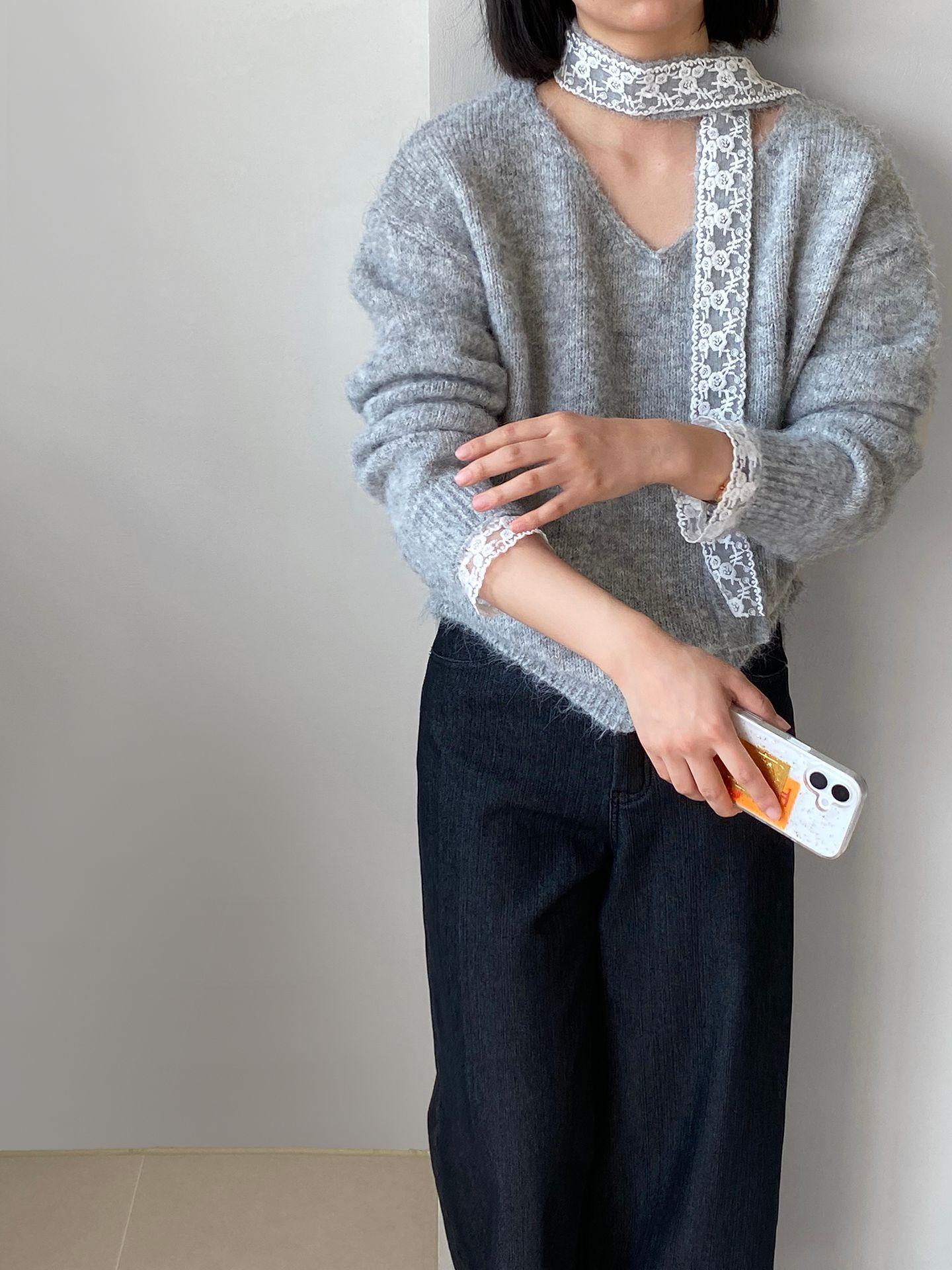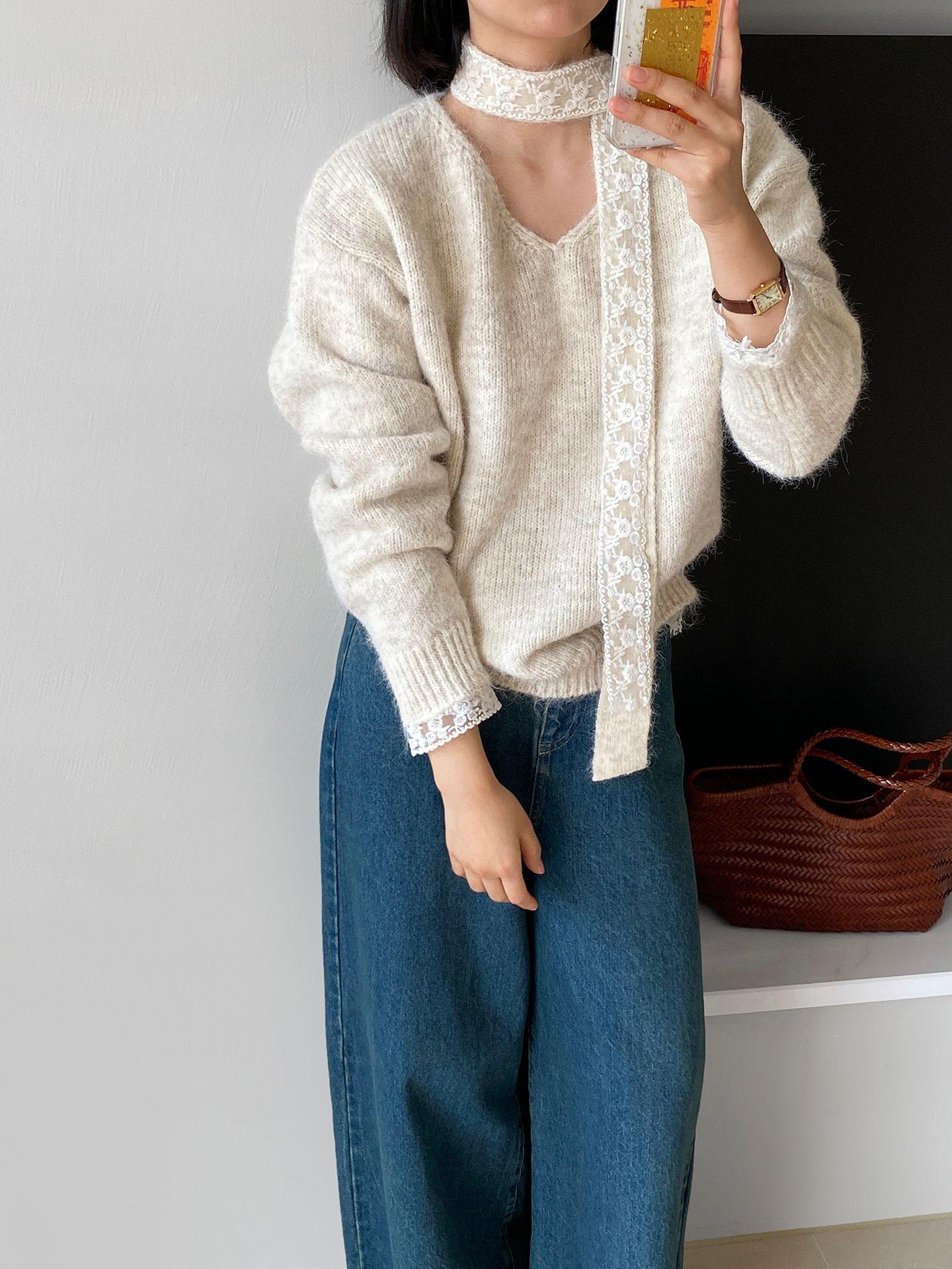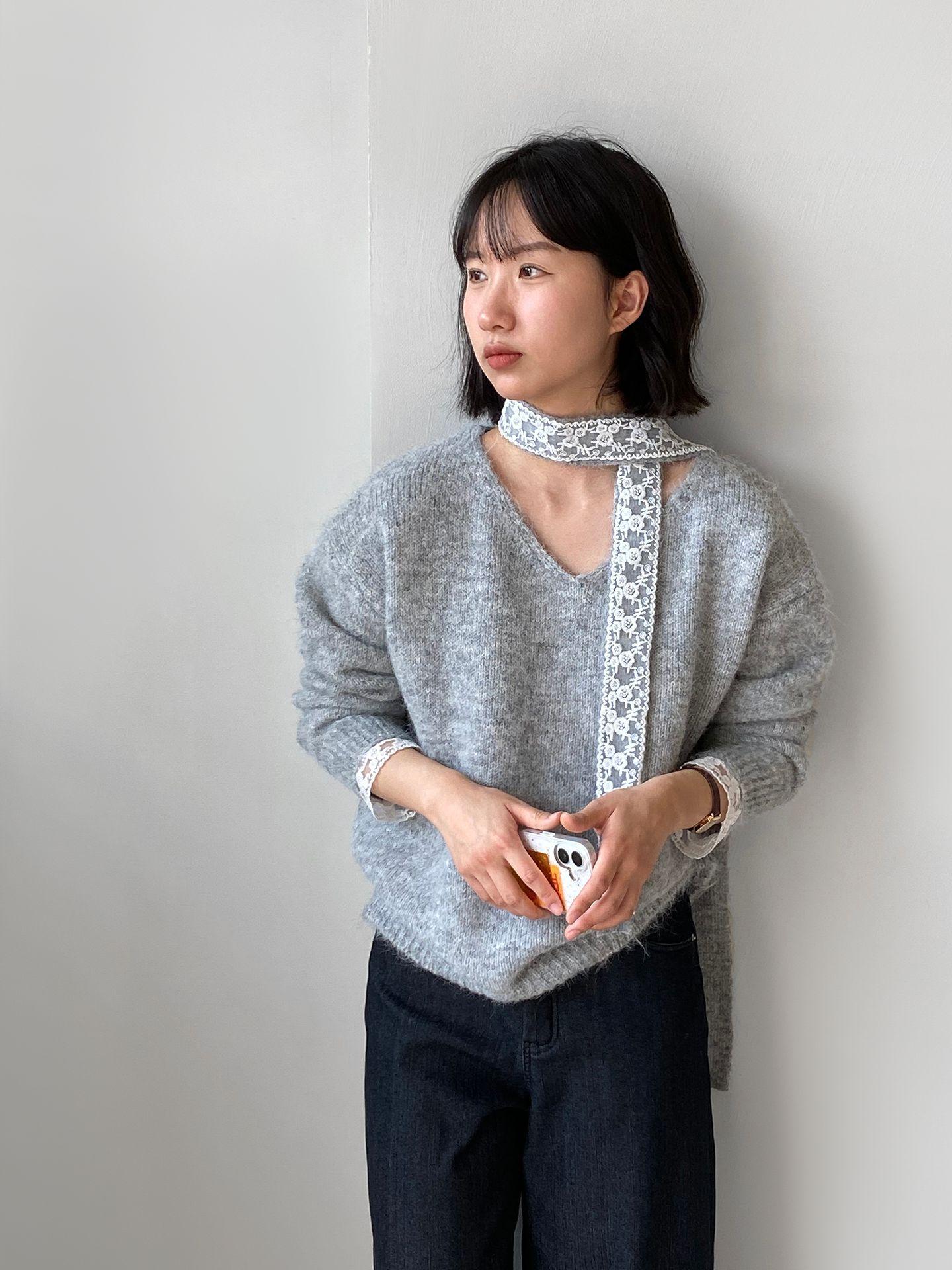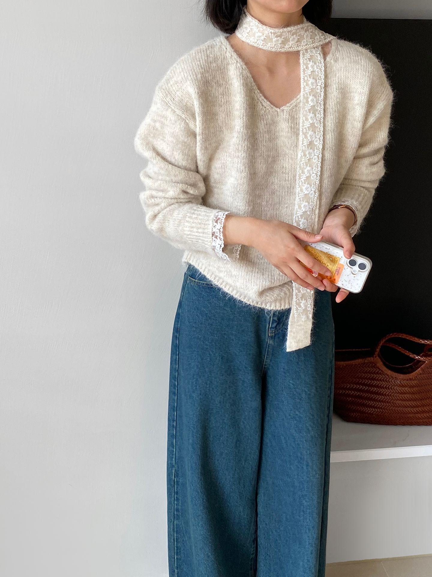 Suéter de punto suelto coreano de manga larga con cuello en V y cinta de encaje suave y ceroso de Jiangzuo para mujer, primavera y otoño, 8593