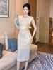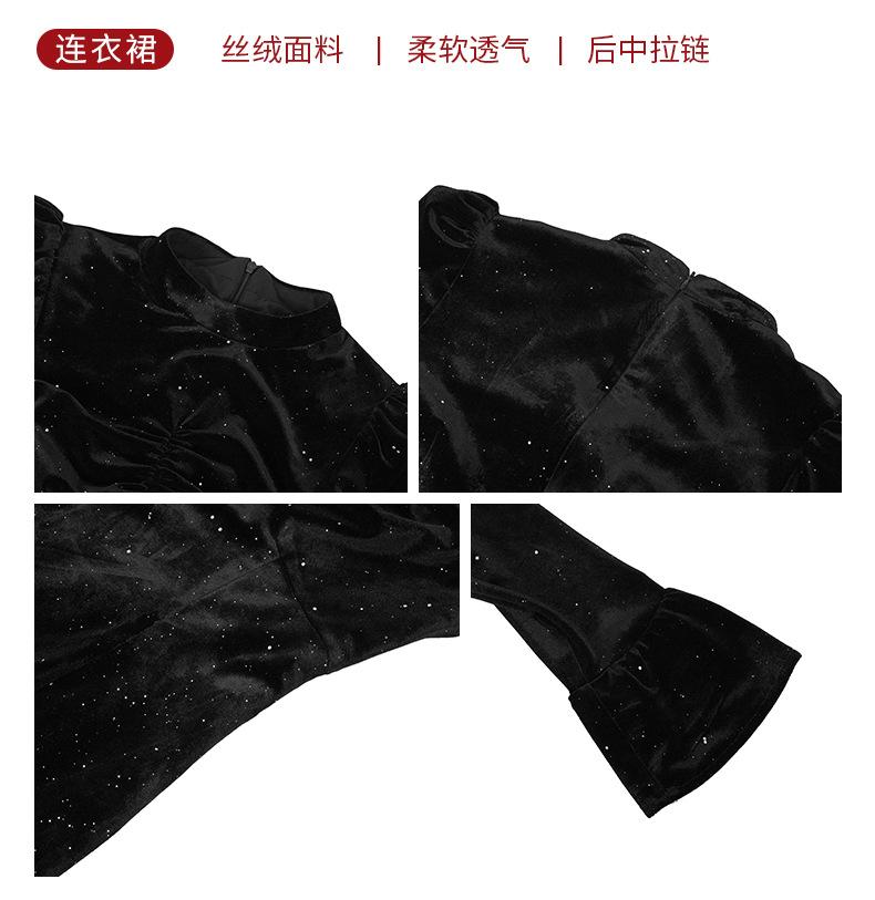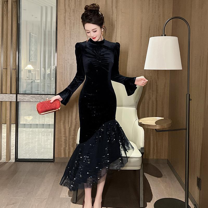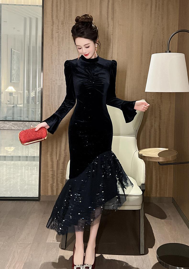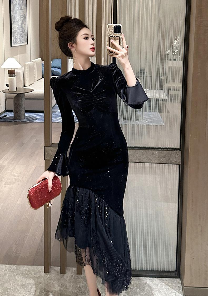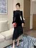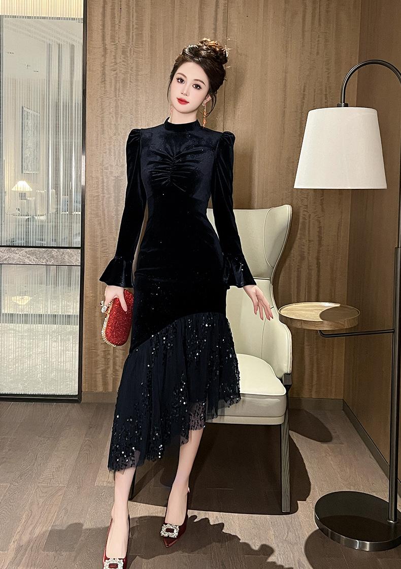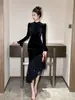 2025 Nuevo Otoño Vestido de Terciopelo Asimétrico Slim Plisado de Diseño Francés de Cuello Redondo para Mujer 45041