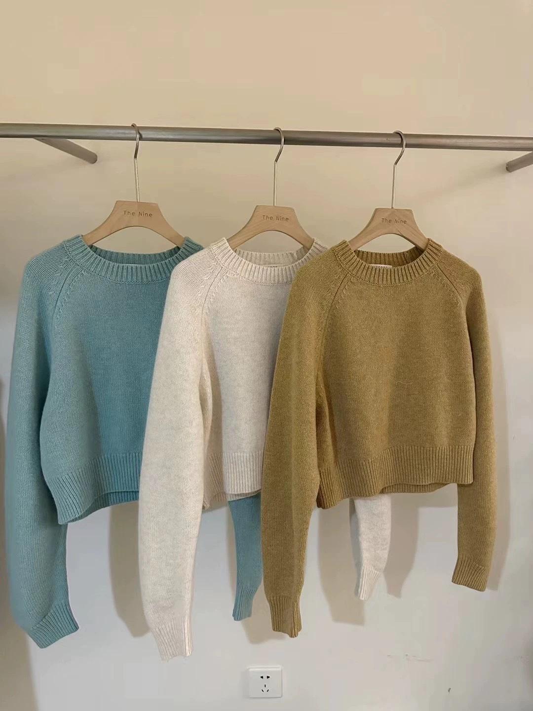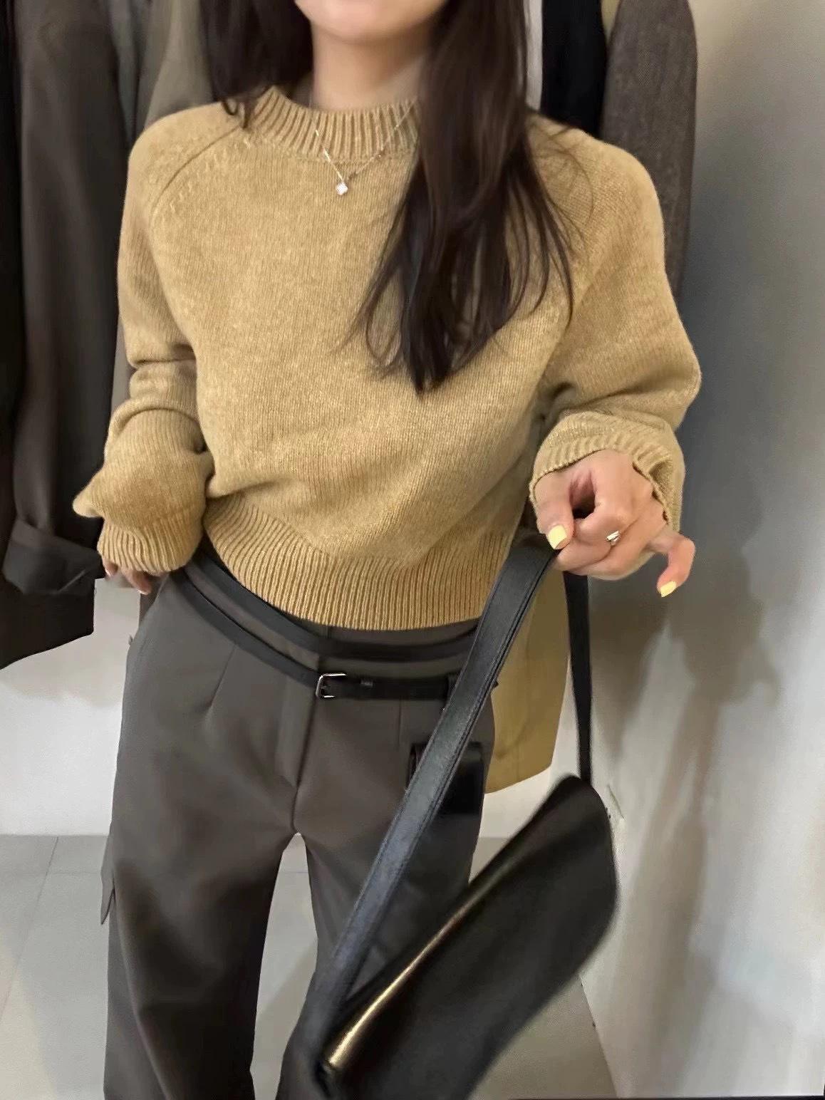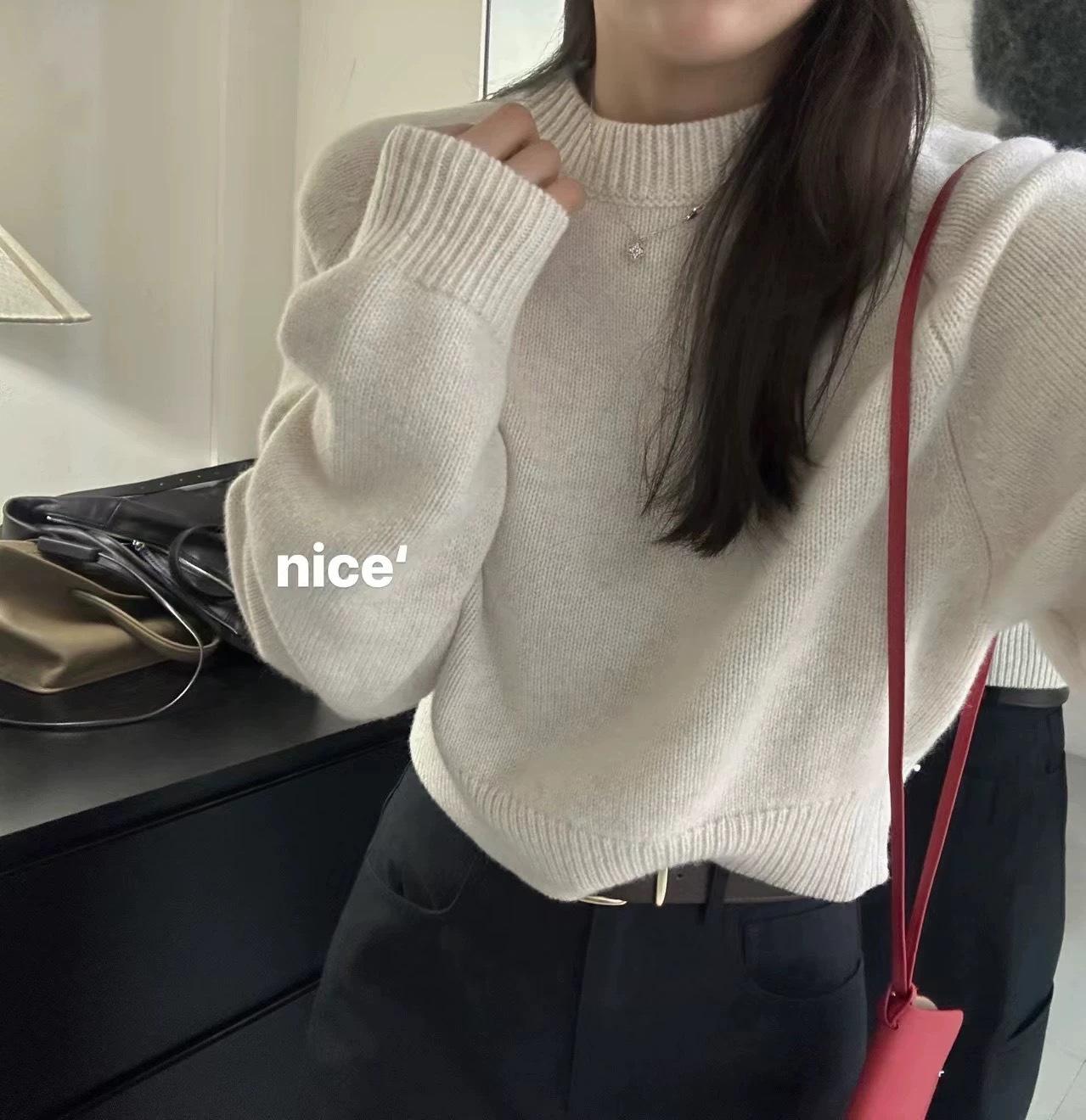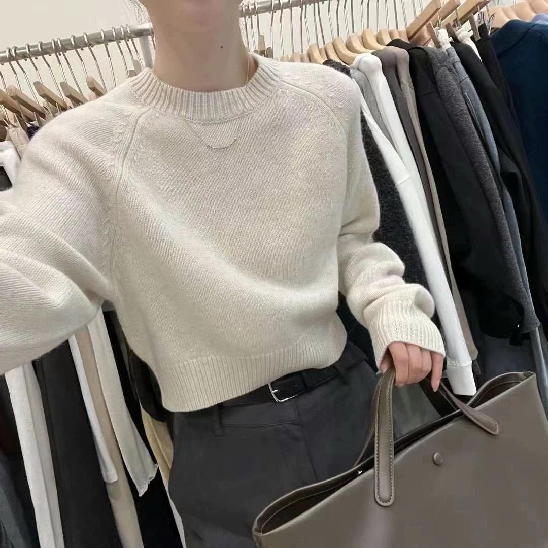 Suéter de Lana Pura para Mujer Nuevo Estilo Base Perezoso Suéter Holgado Grueso Cuello Redondo Corto Cashmere Tejido Top