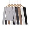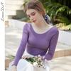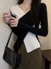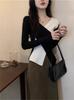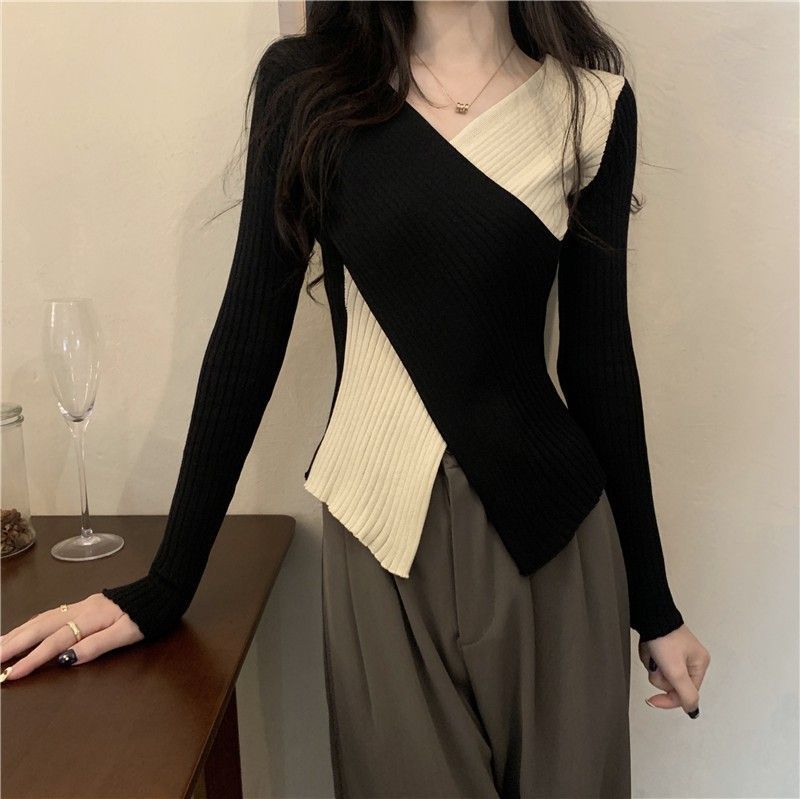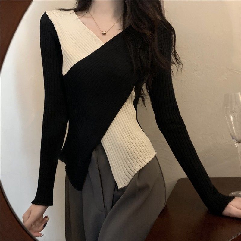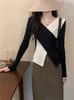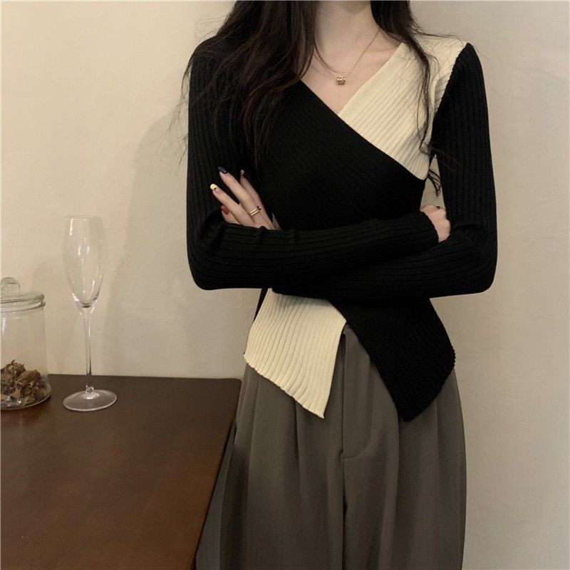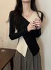 Camiseta de punto ajustada, sexy y pura, de nuevo estilo, con cintura ajustada, escote en V cruzado y aberturas elásticas.