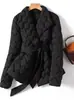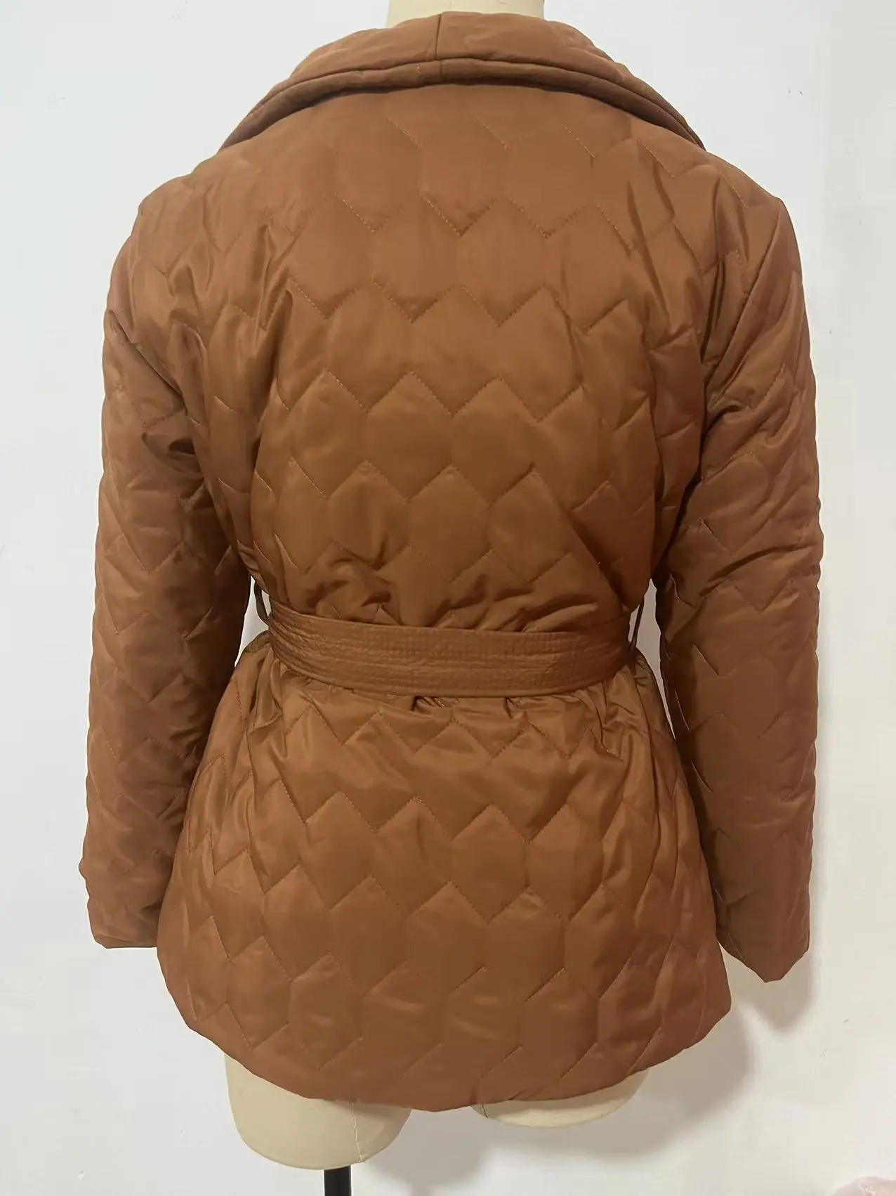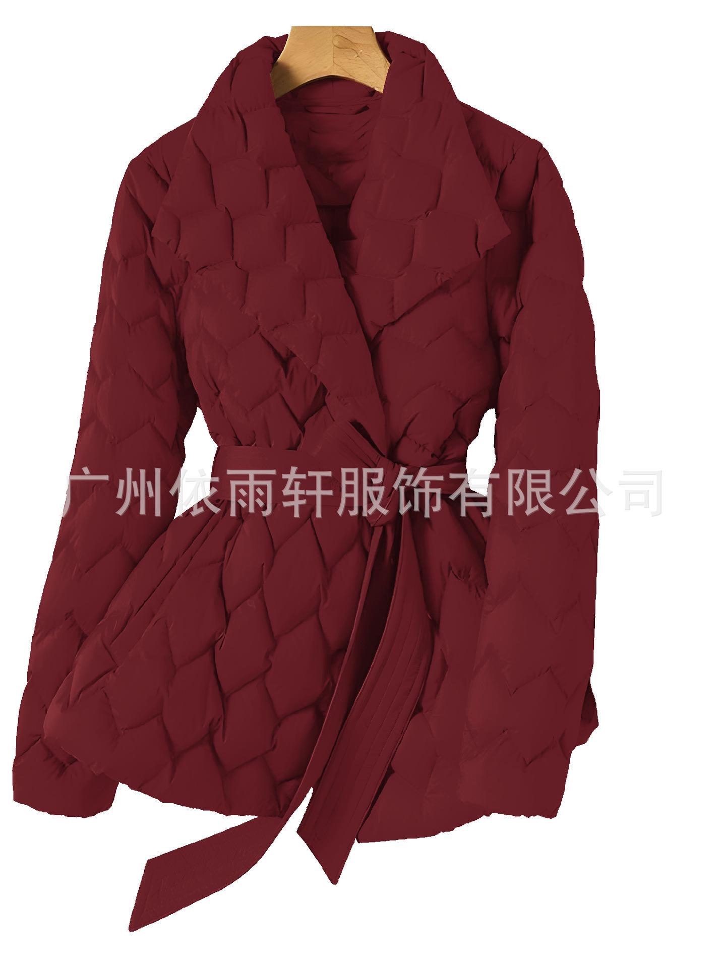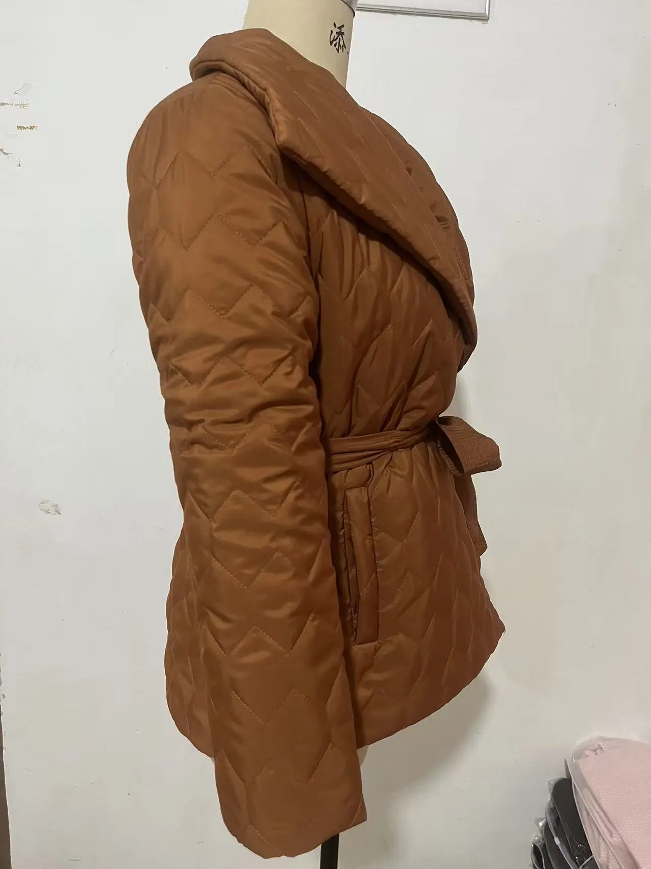 Chaqueta acolchada de algodón ligero de plumón de invierno transfronteriza con temperamento, acolchada con ondas de agua, solapa, cinturón en la cintura, larga, elegante, cortavientos, acolchada de algodón