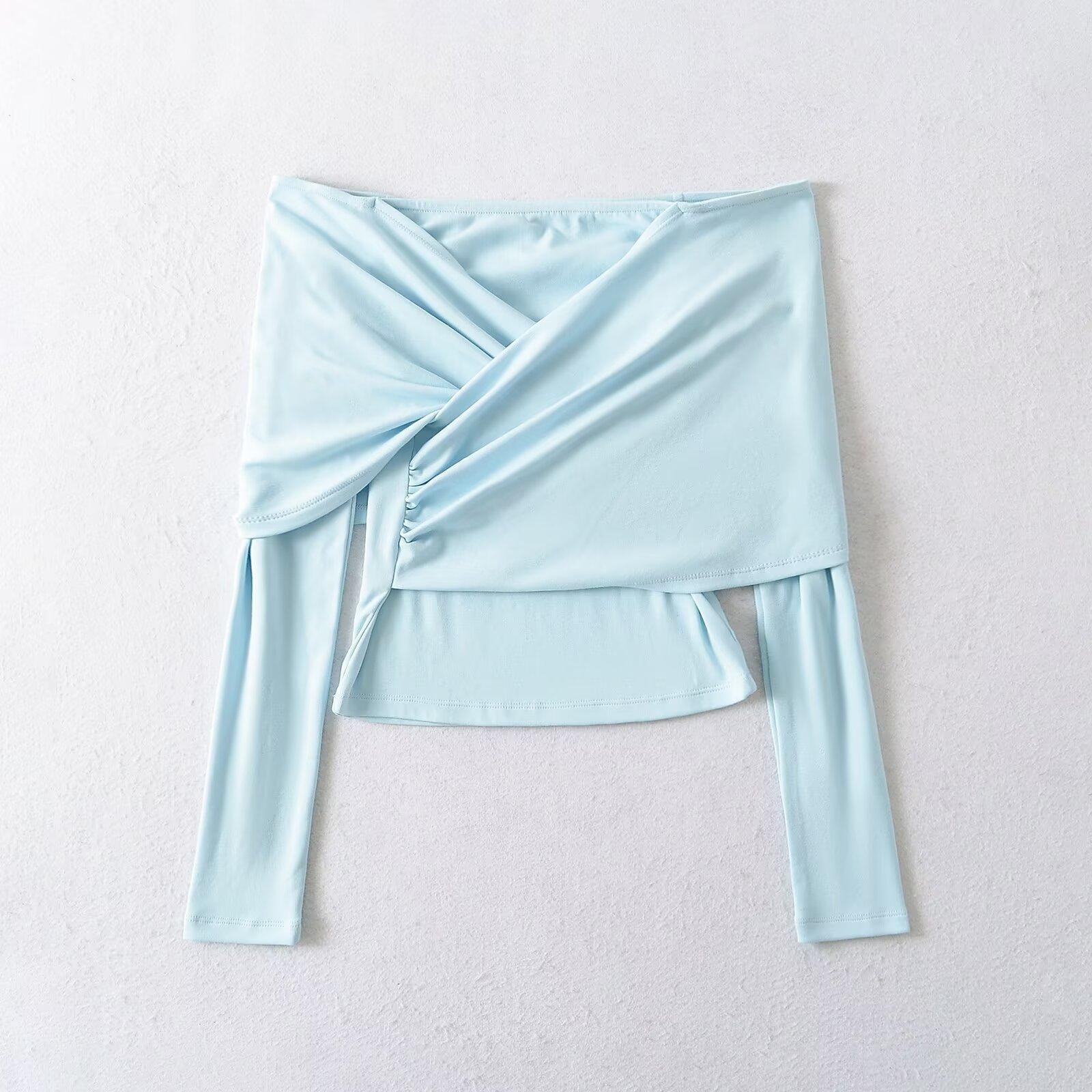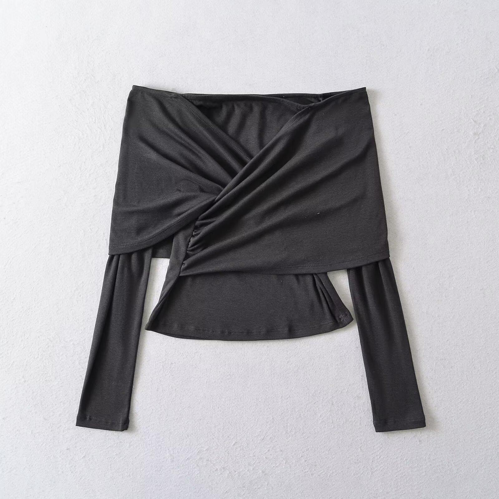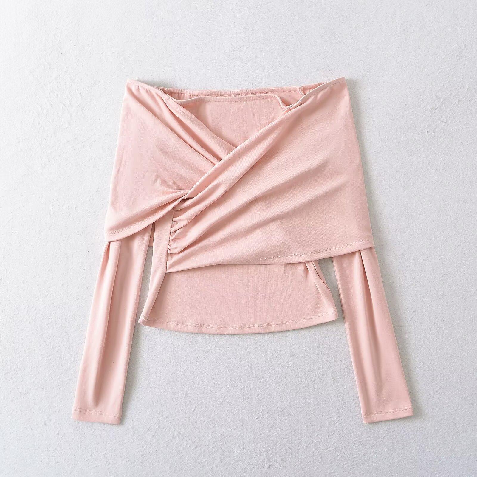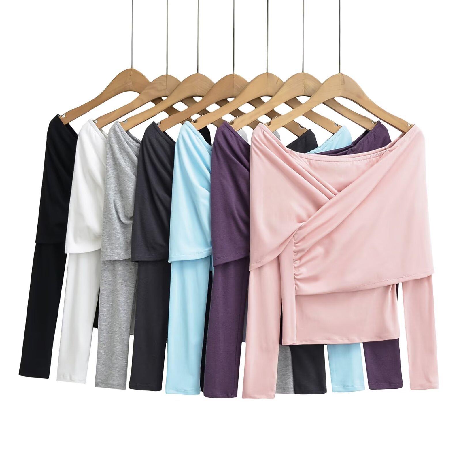 24382-Camiseta de Hombro Plisada de Manga Larga para Spice Girls Europeas y Americanas 2024 Nuevo Diseño con Sentido Slim Fit Top para Mujer