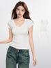 Camiseta de manga corta con cuello en V y hombros descubiertos para mujer, estilo americano, ajustada, de algodón, con interior corto, color negro