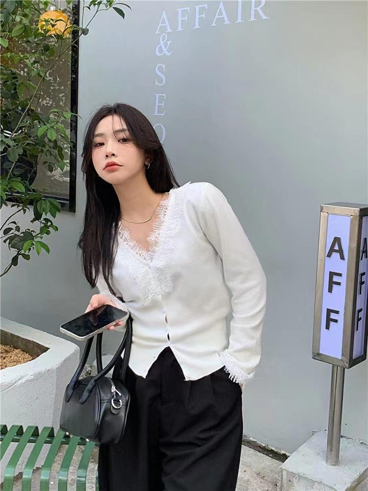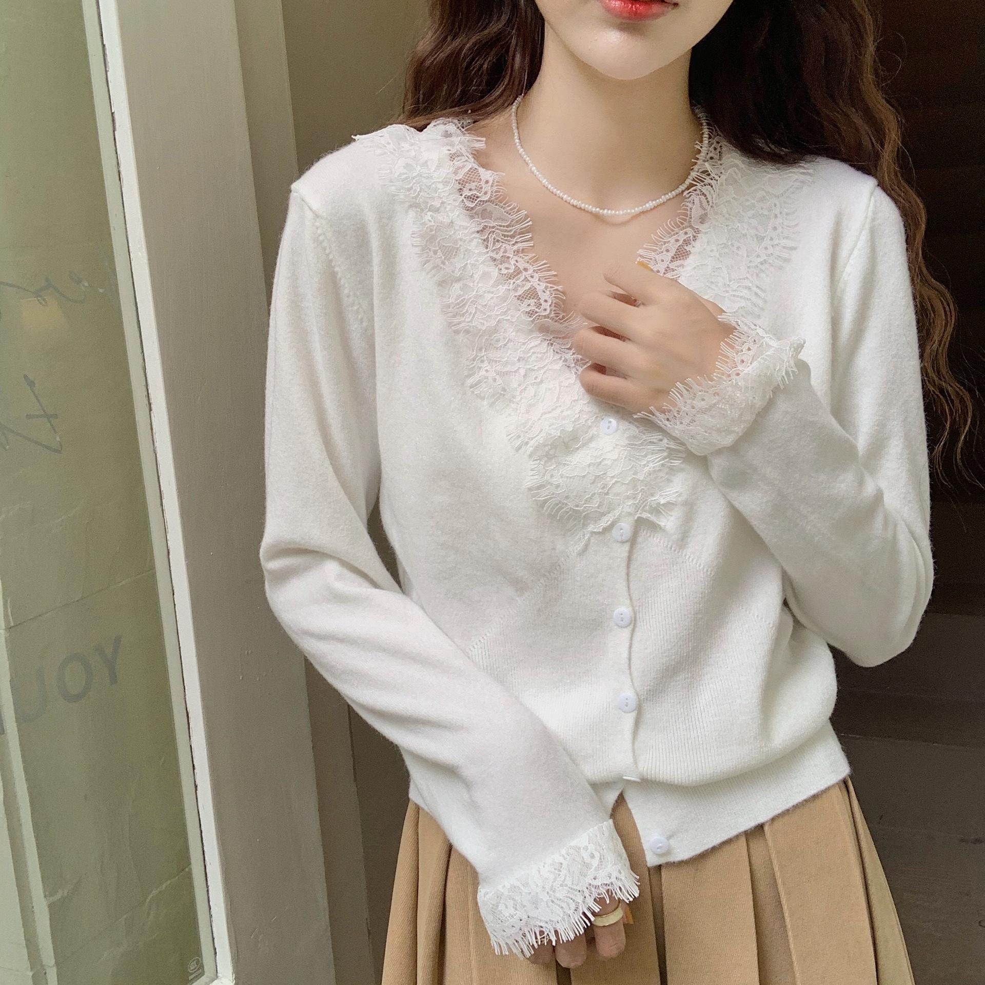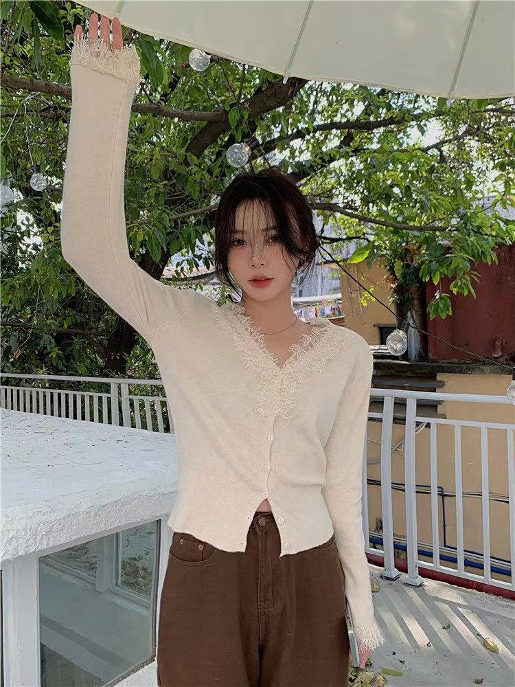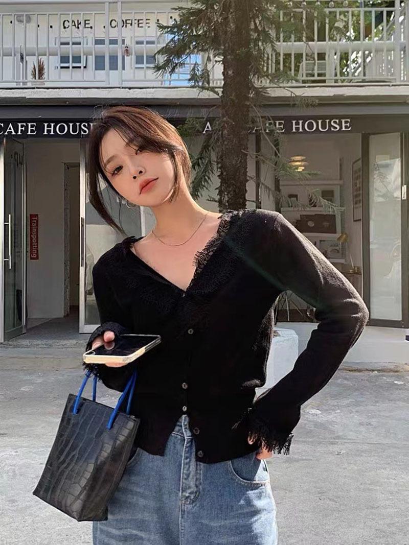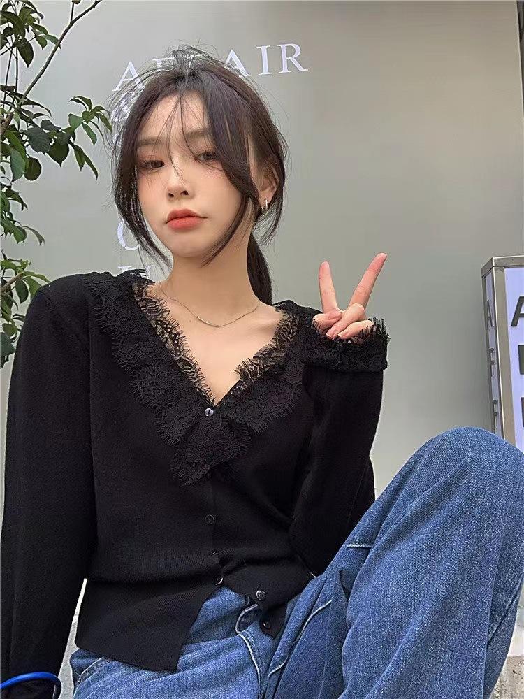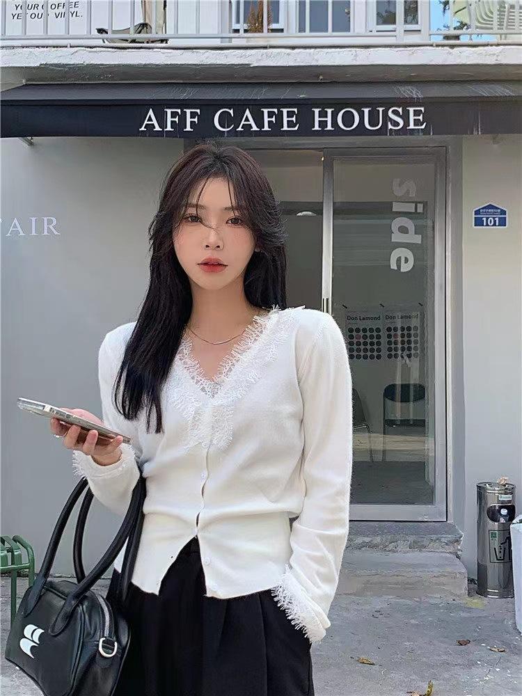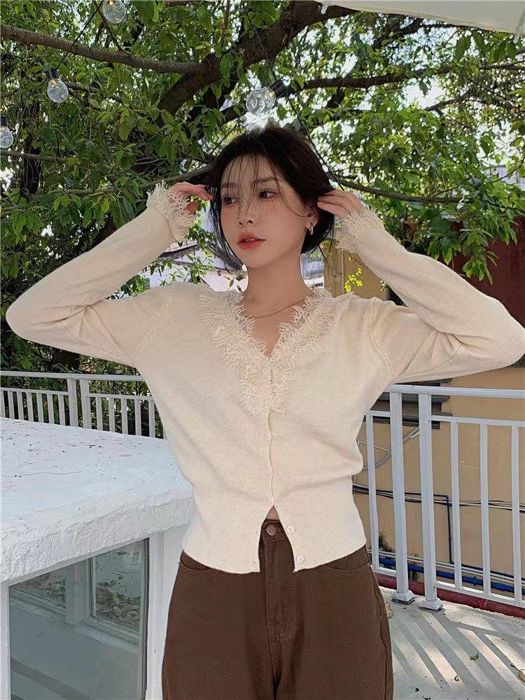 Suéter de encaje con cuello en V para mujer, cárdigan, suéter de primavera, otoño e invierno, diseño único, elegante, top corto, camisa base para mujer