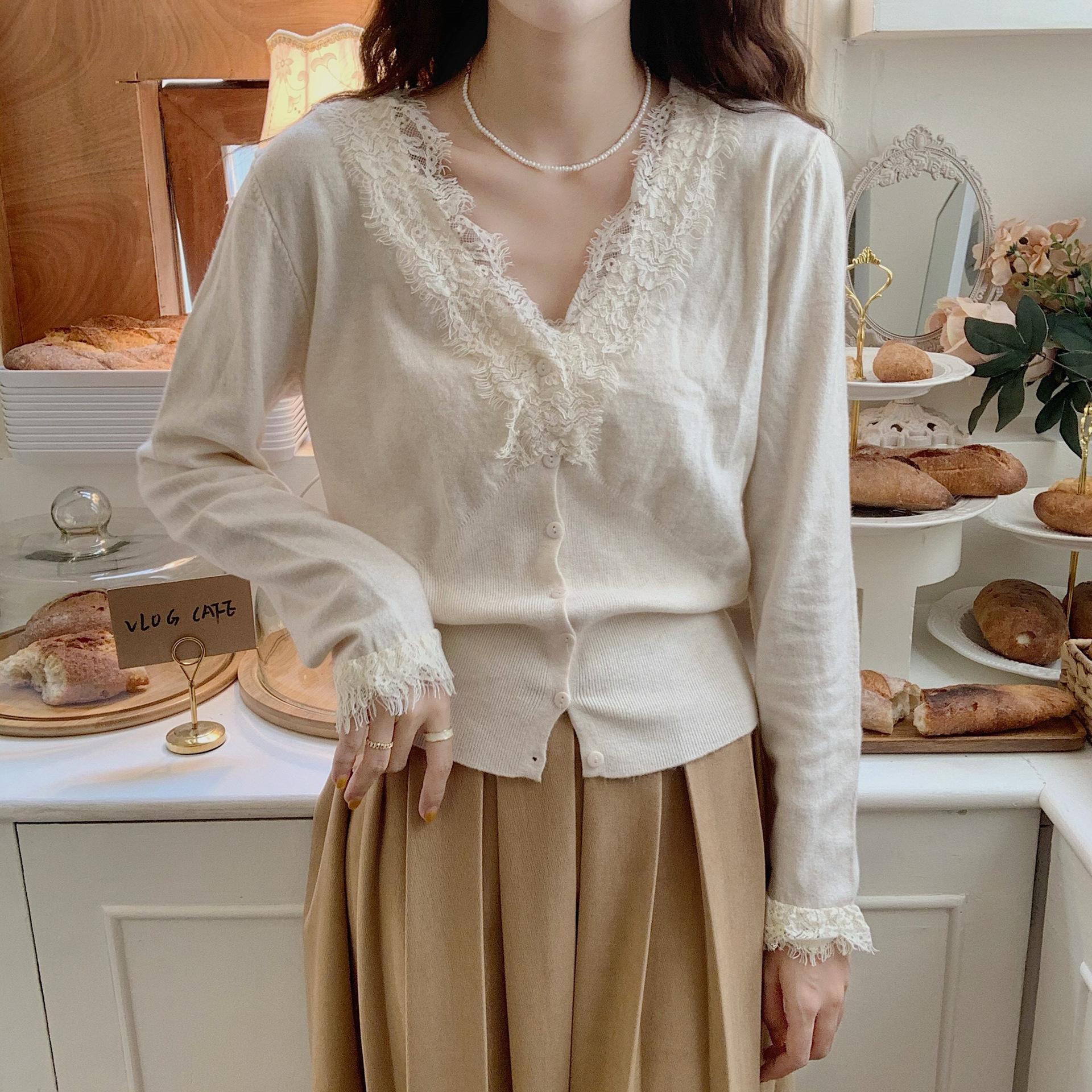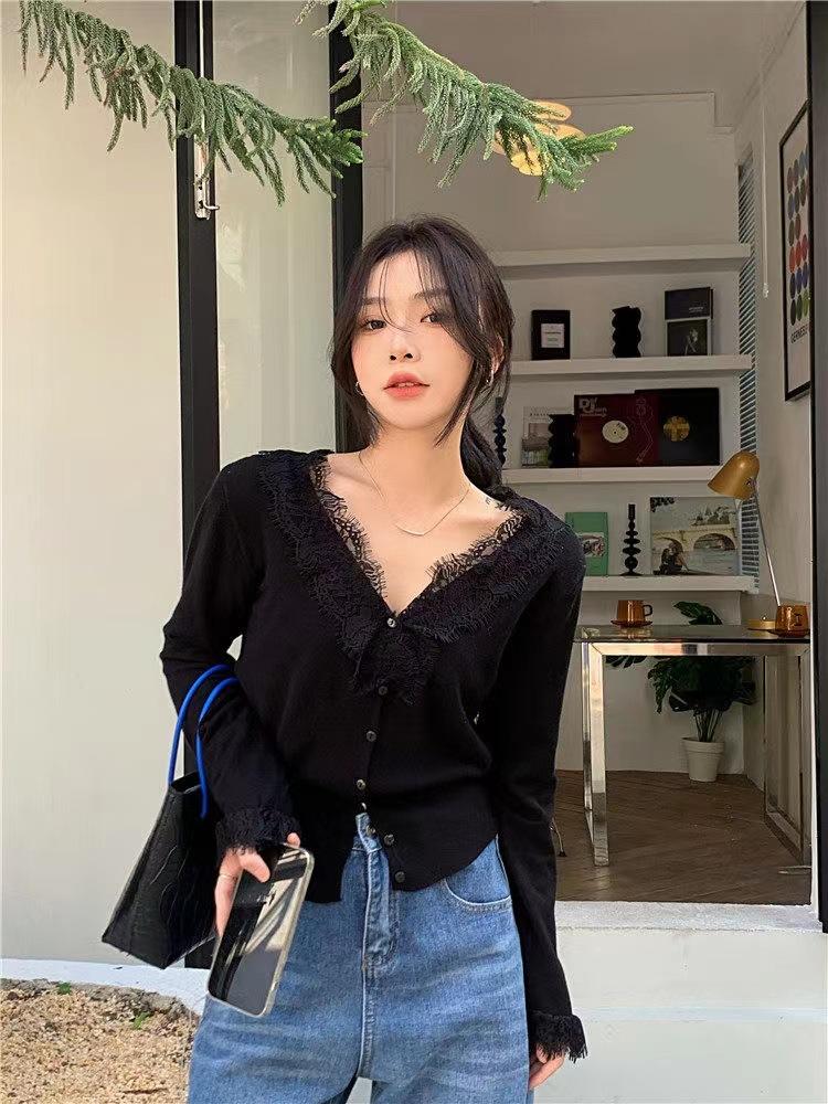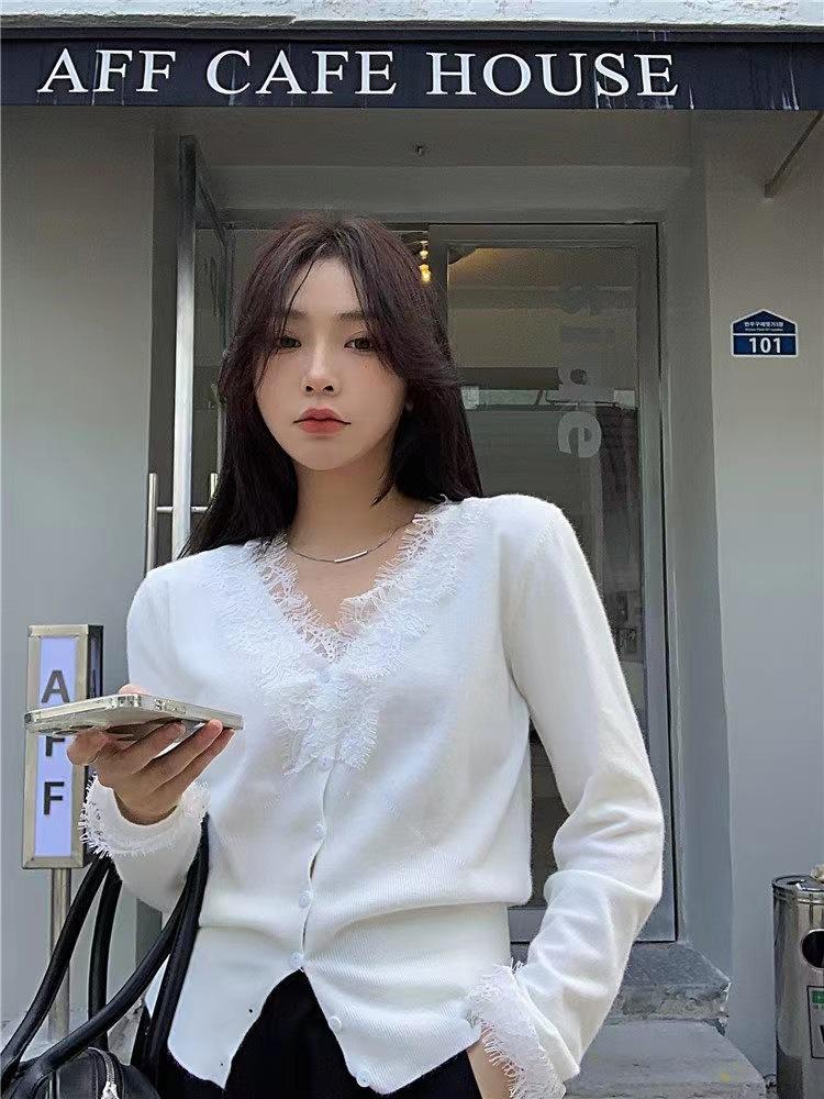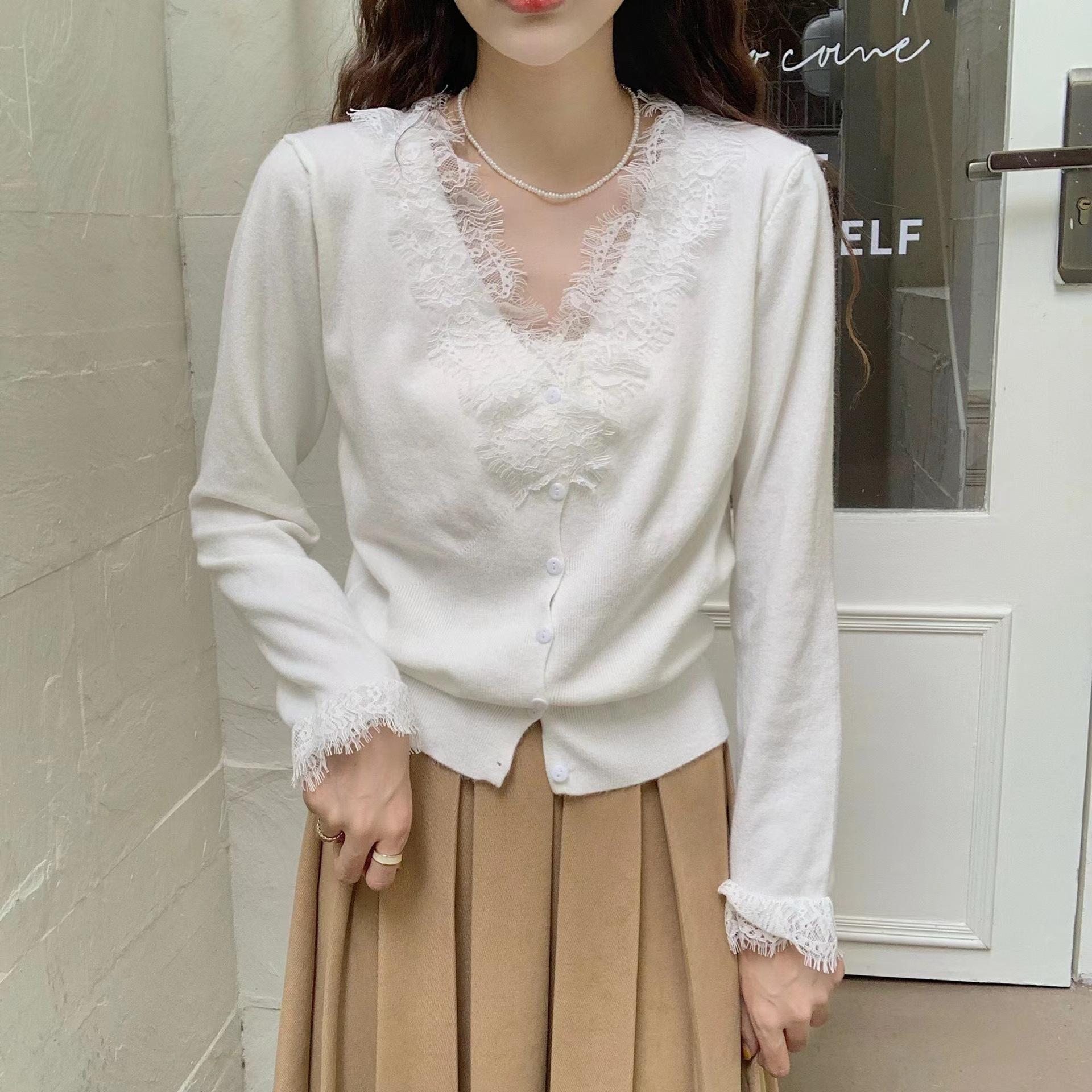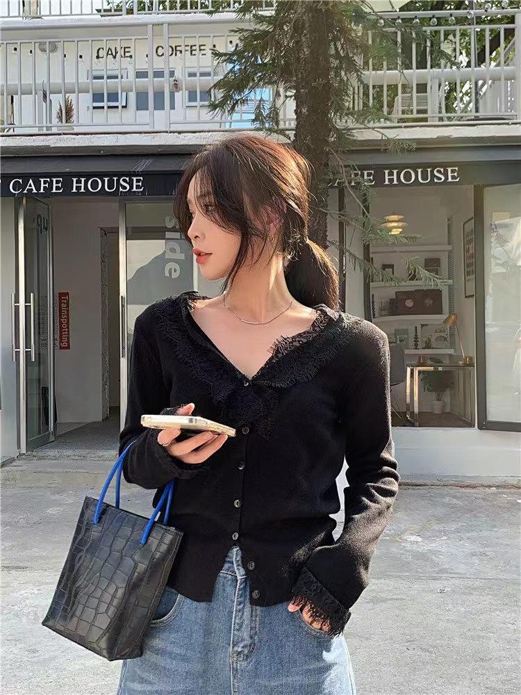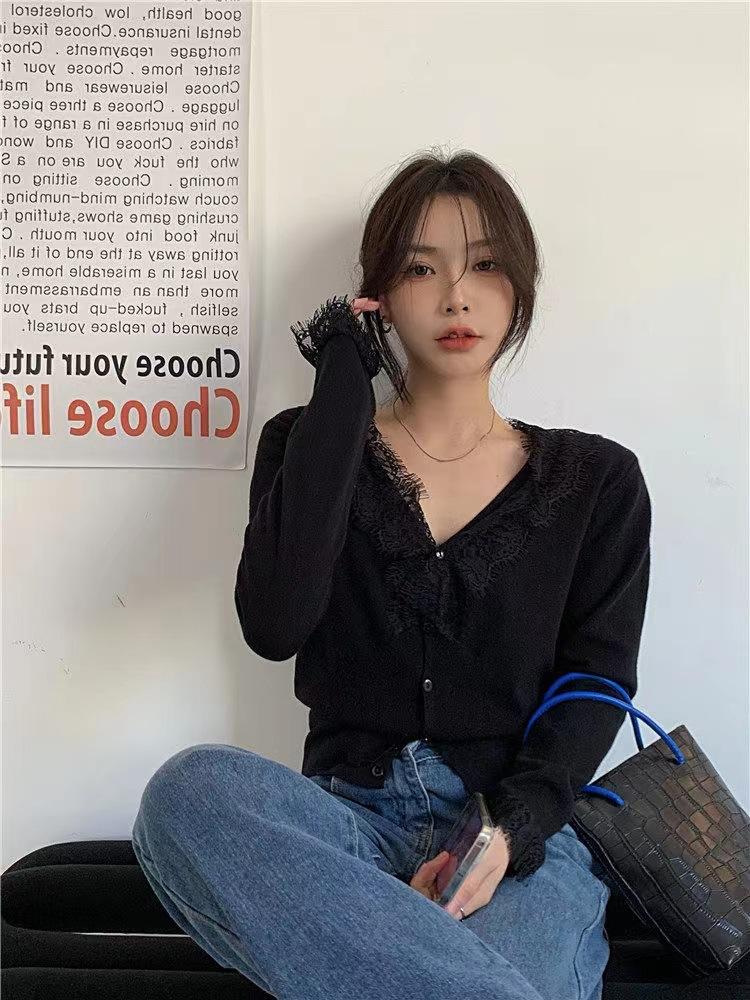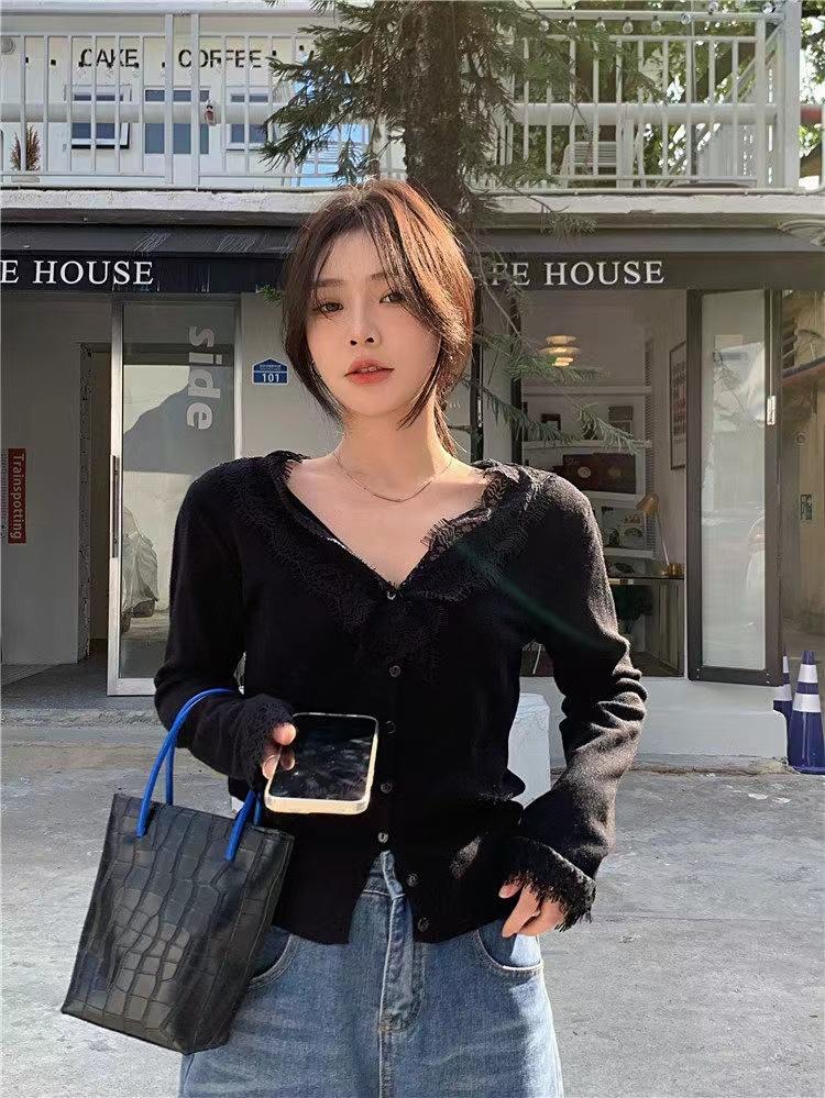 Suéter de encaje con cuello en V para mujer, cárdigan, suéter de primavera, otoño e invierno, diseño único, elegante, top corto, camisa base para mujer