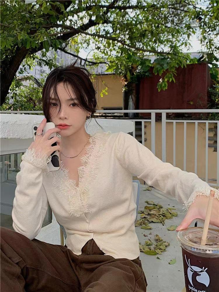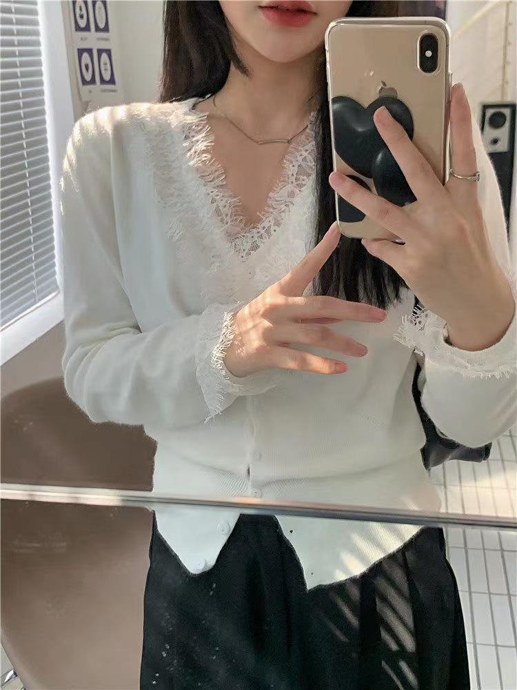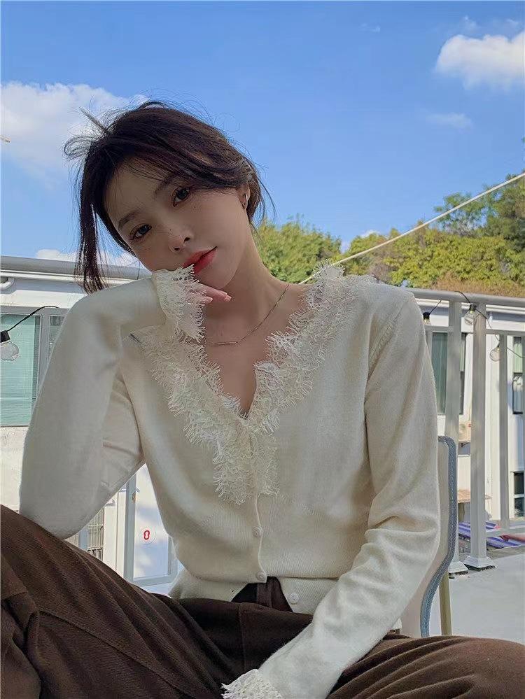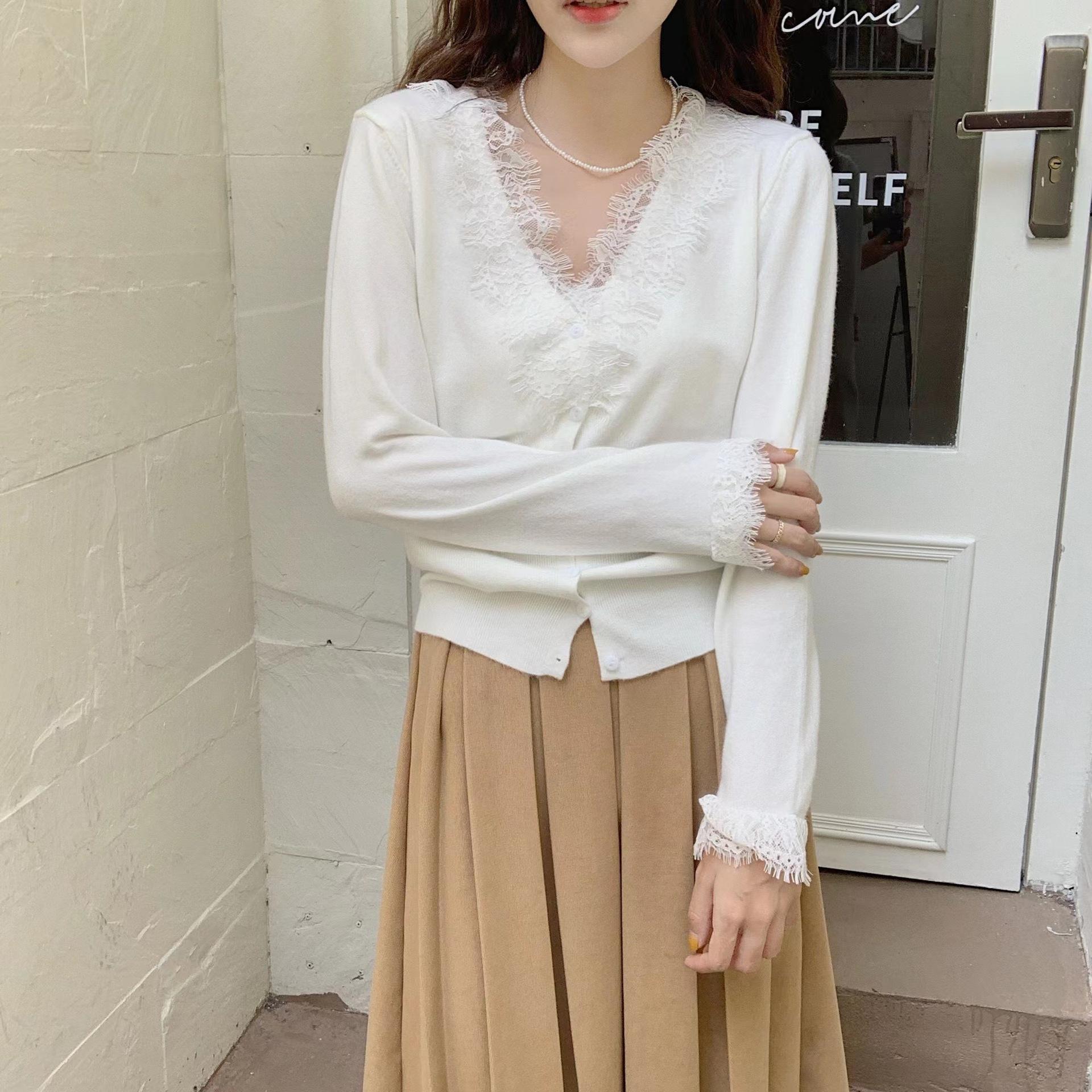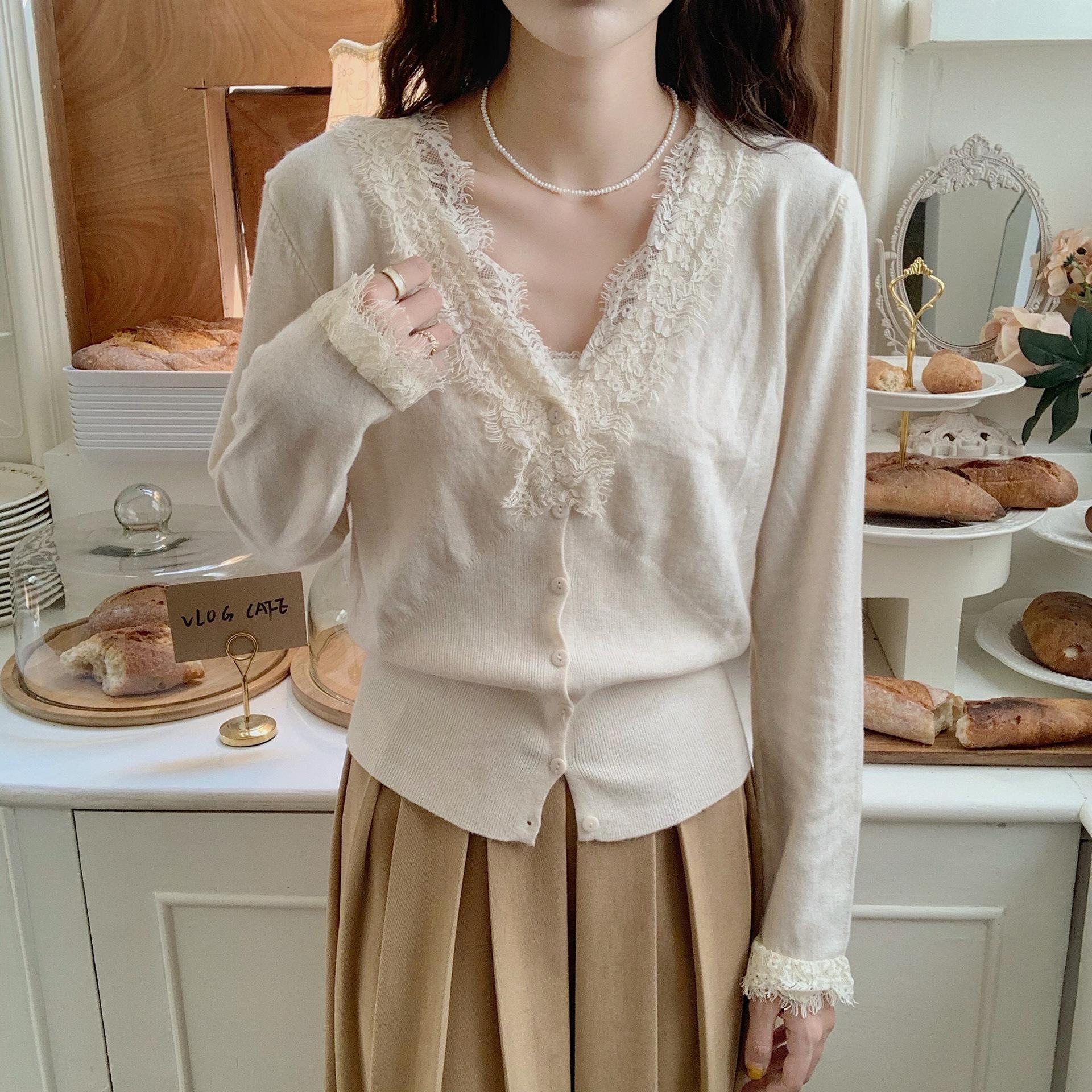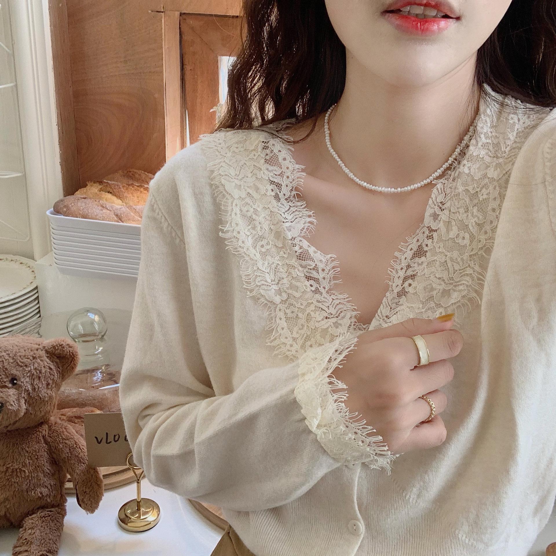 Suéter de encaje con cuello en V para mujer, cárdigan, suéter de primavera, otoño e invierno, diseño único, elegante, top corto, camisa base para mujer