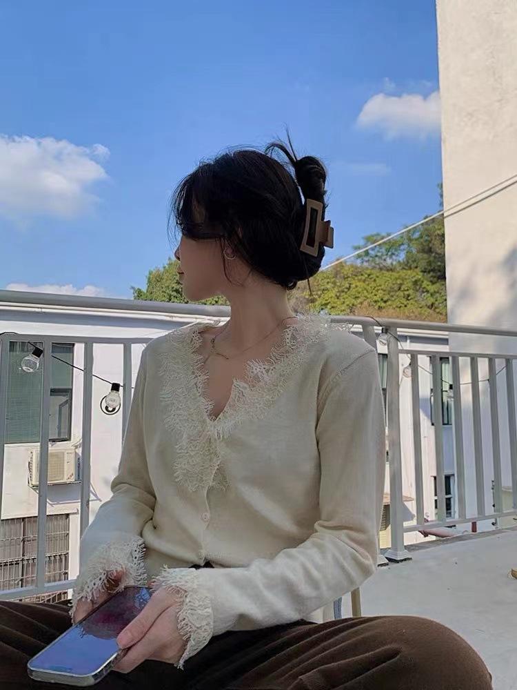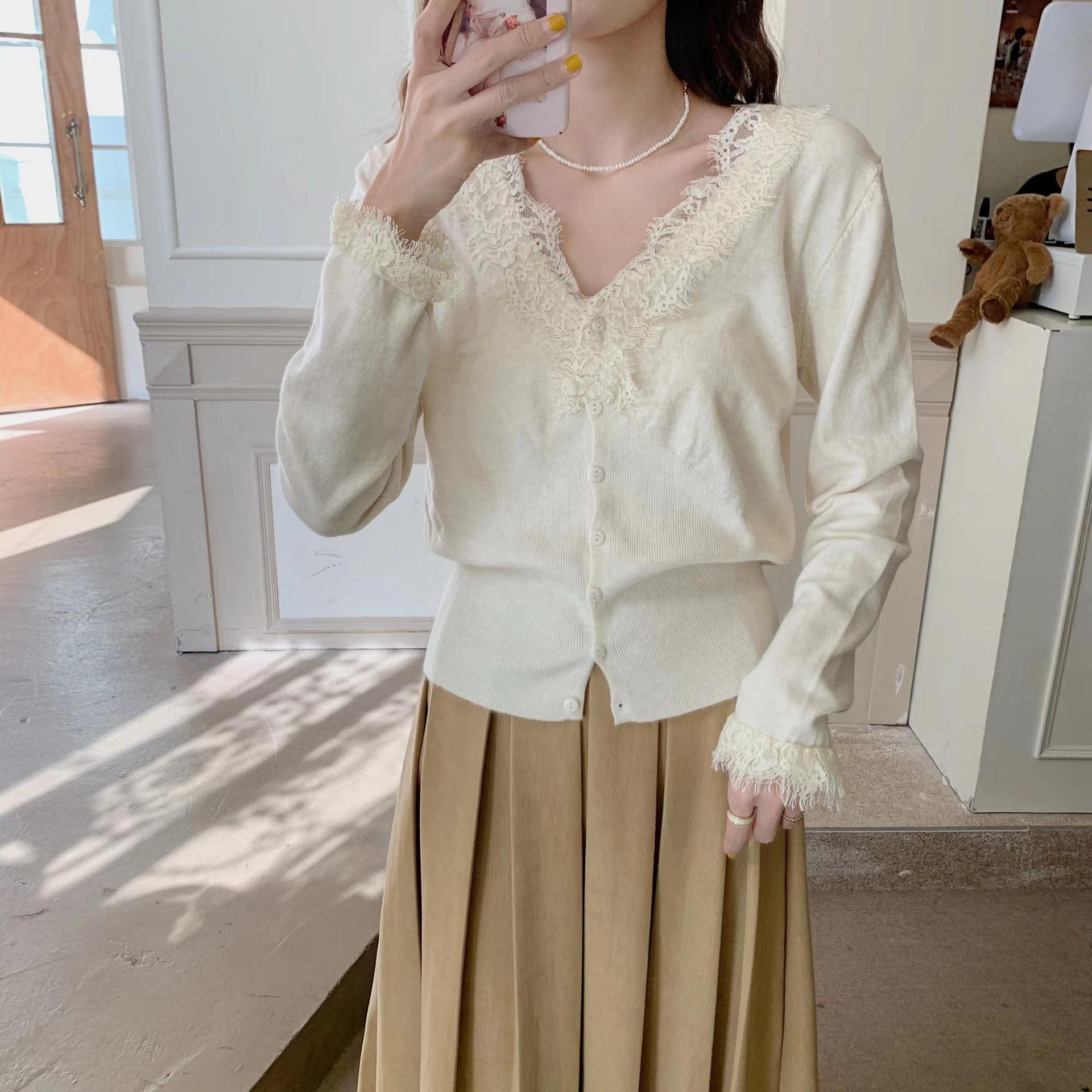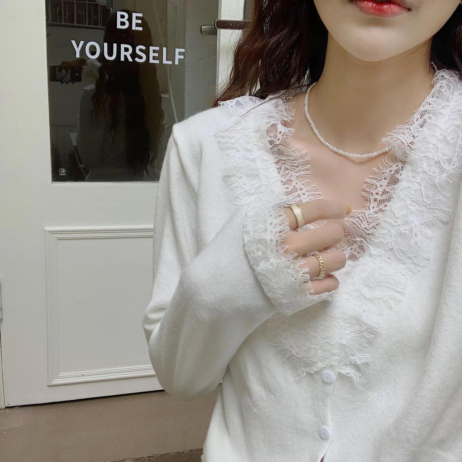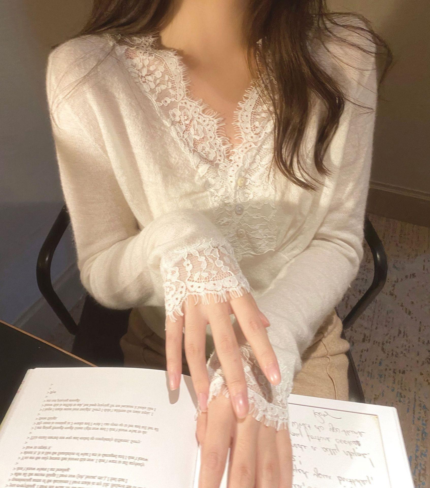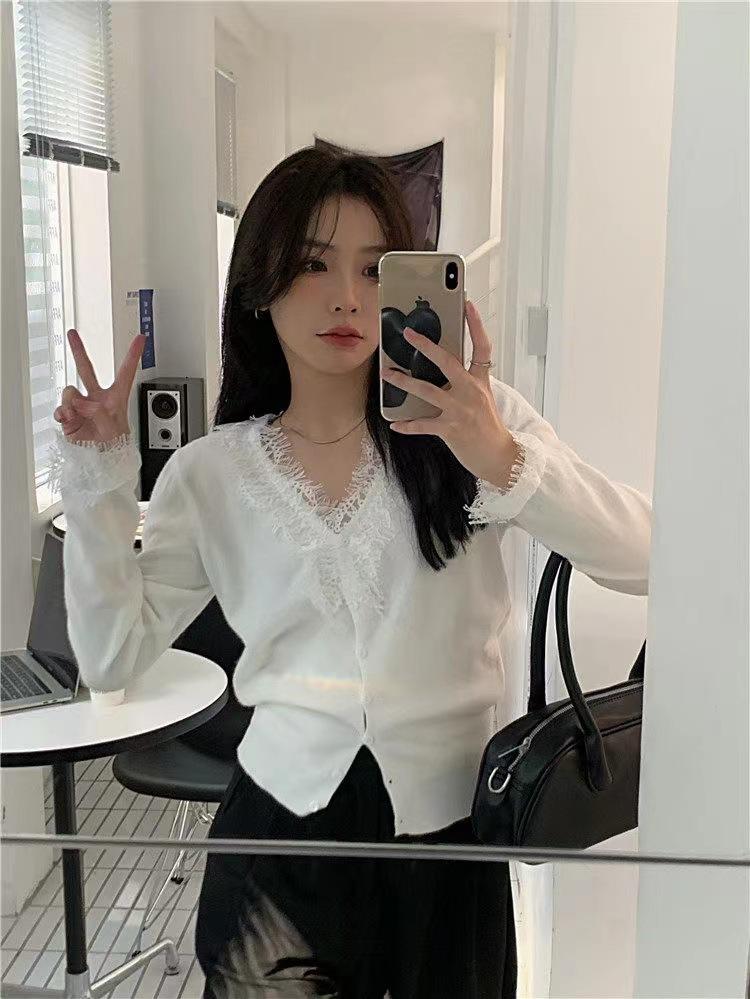 Suéter de encaje con cuello en V para mujer, cárdigan, suéter de primavera, otoño e invierno, diseño único, elegante, top corto, camisa base para mujer