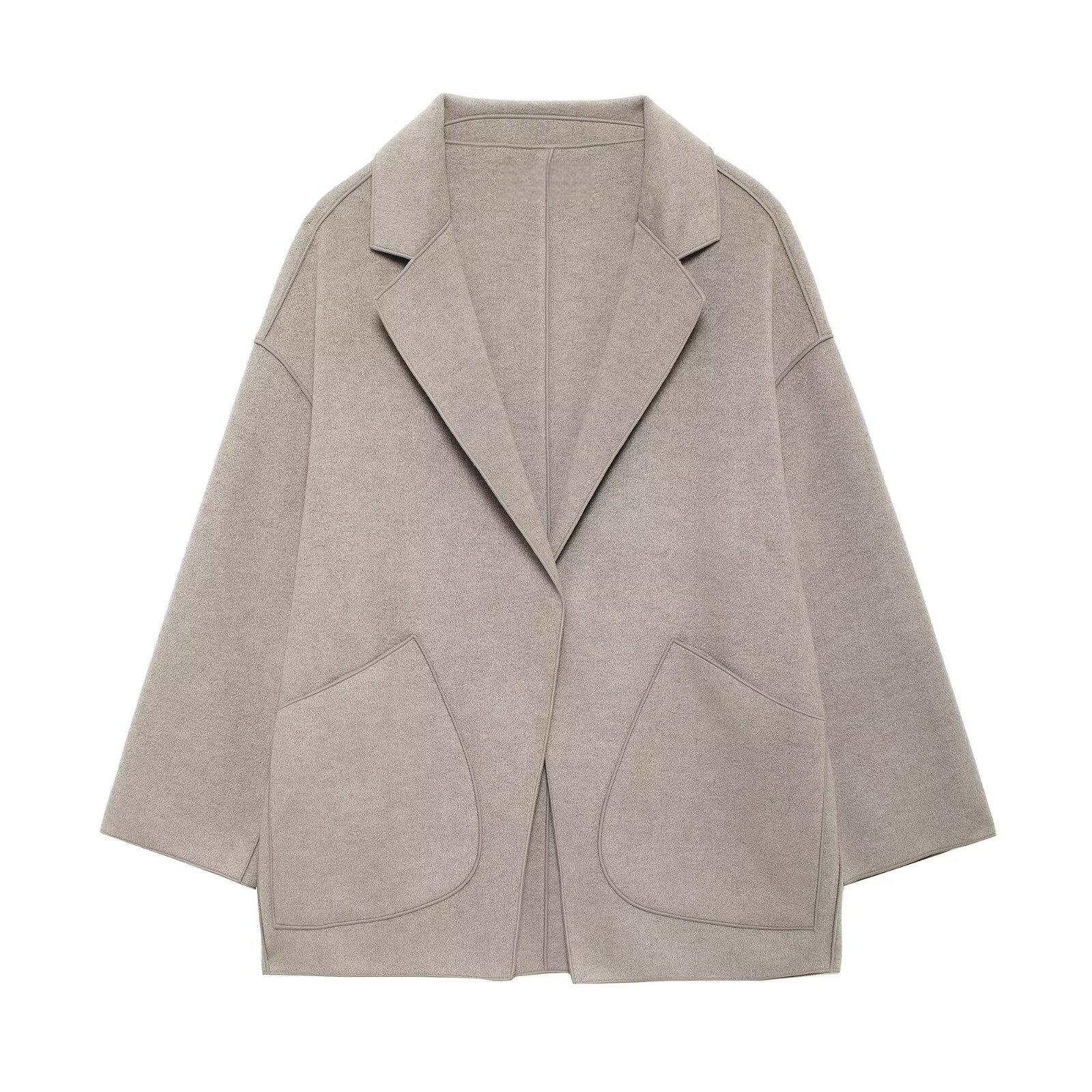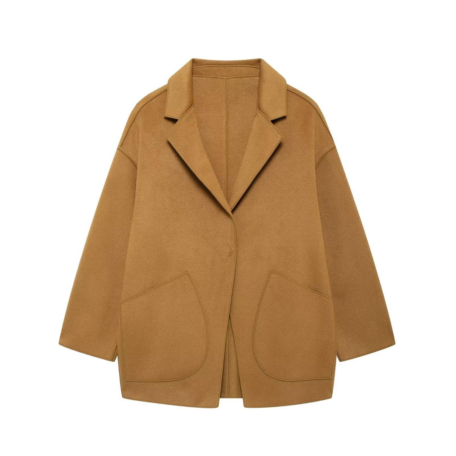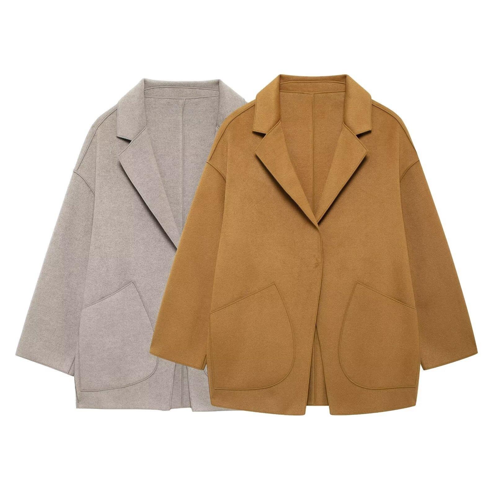Chaqueta de Lana de Doble Cara para Mujer Europea y Americana Transfronteriza Primavera 2025 Holgada con Solapas y Bolsillo Grande Color Sólido Largo Medio