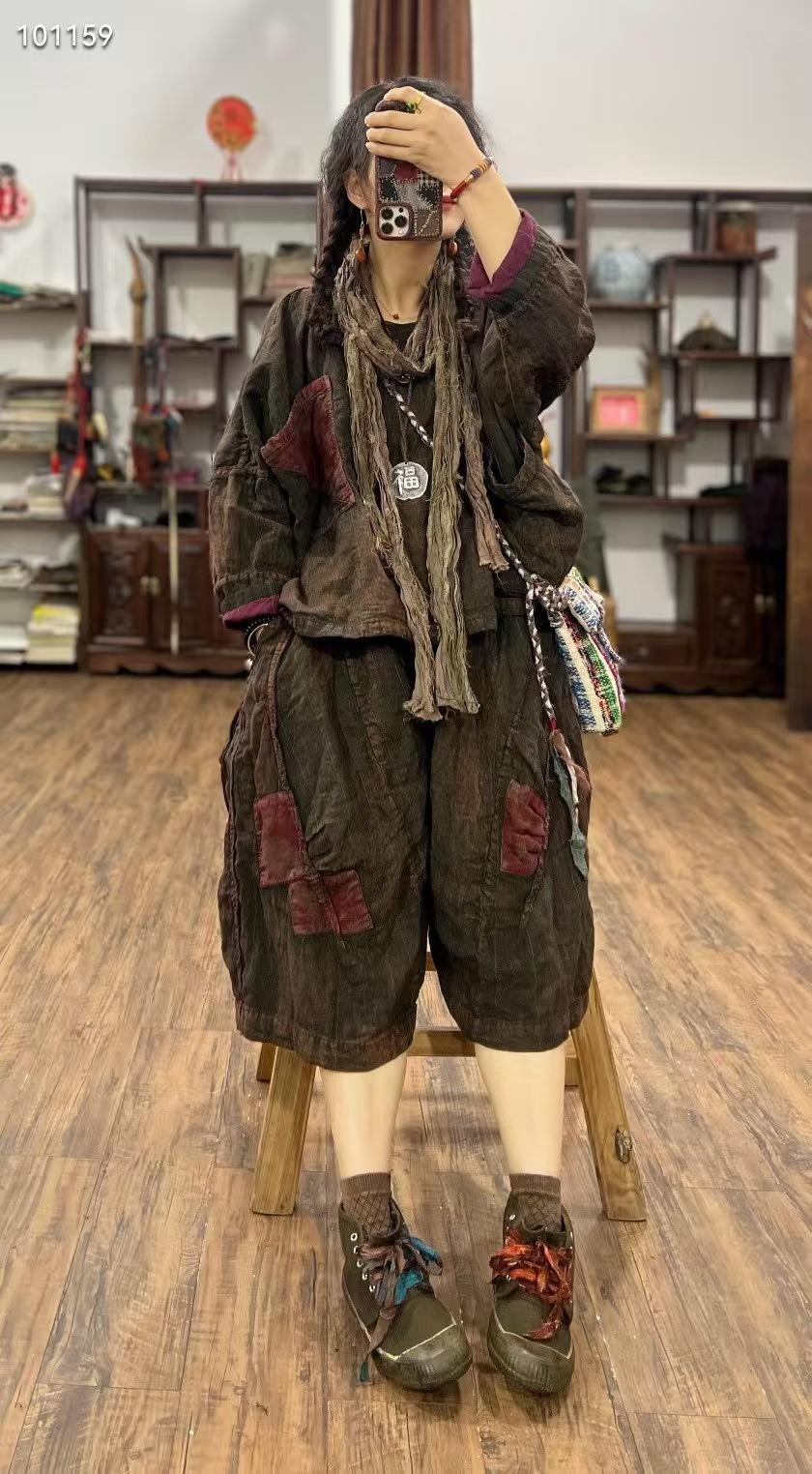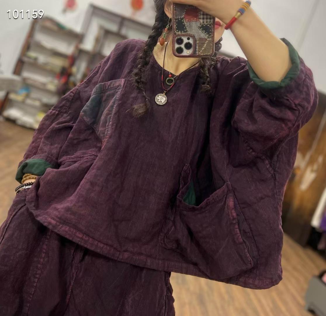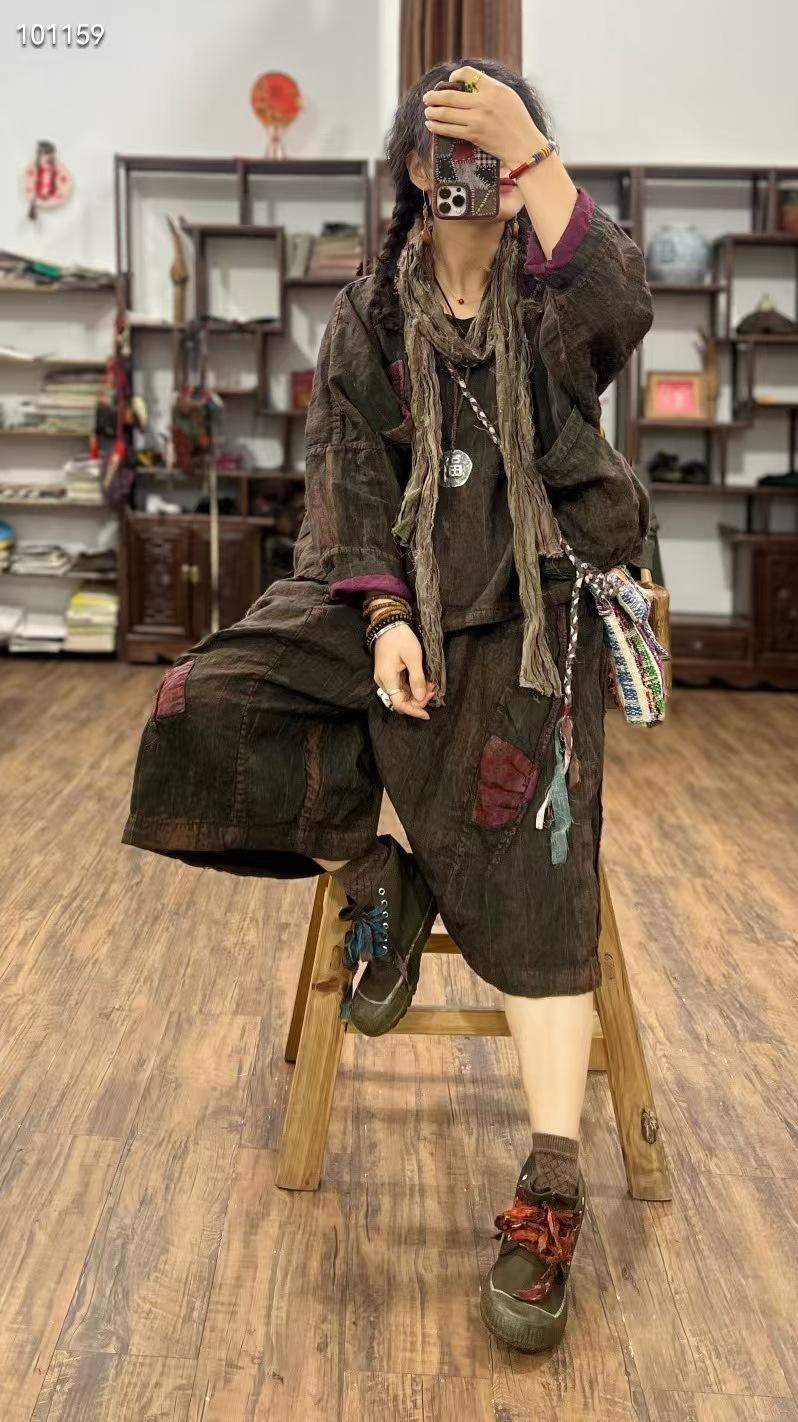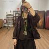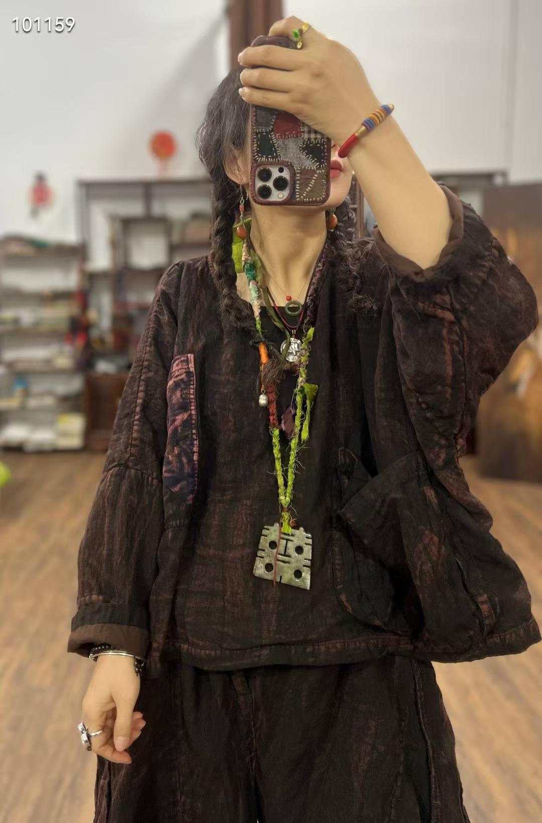 Jersey de cuello redondo de estilo retro de primavera 25, camisa pequeña de lino de doble capa con diseño artístico de nicho y parche.