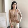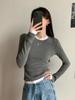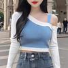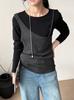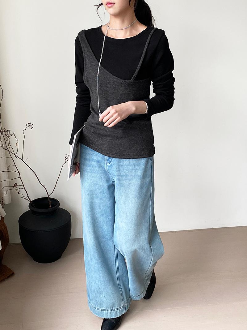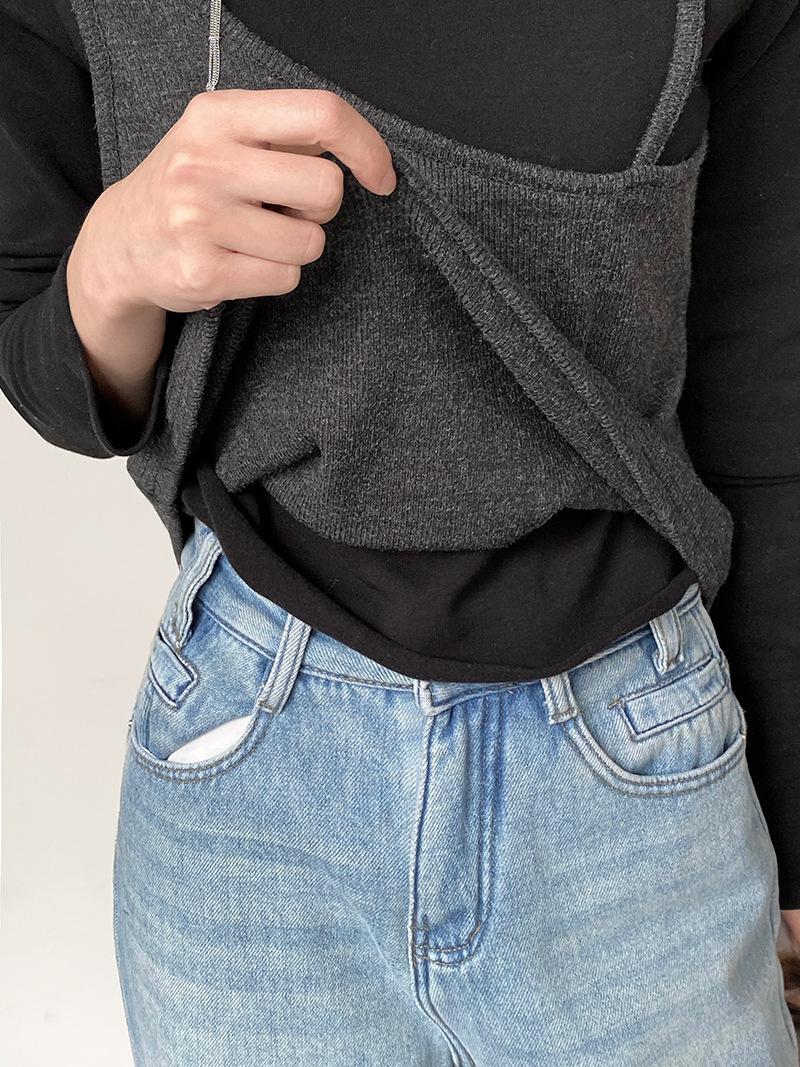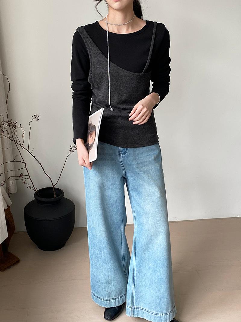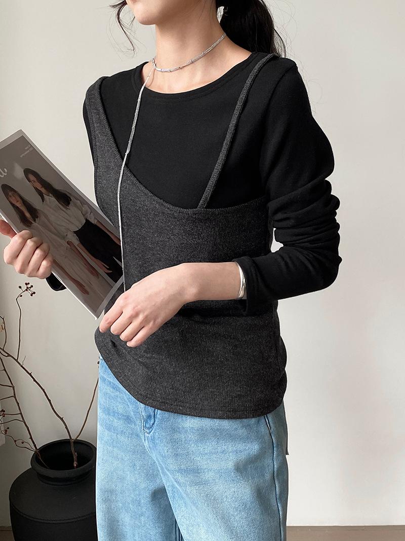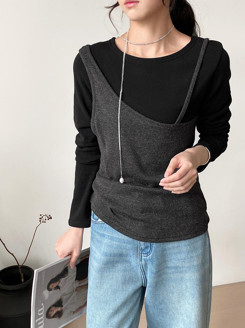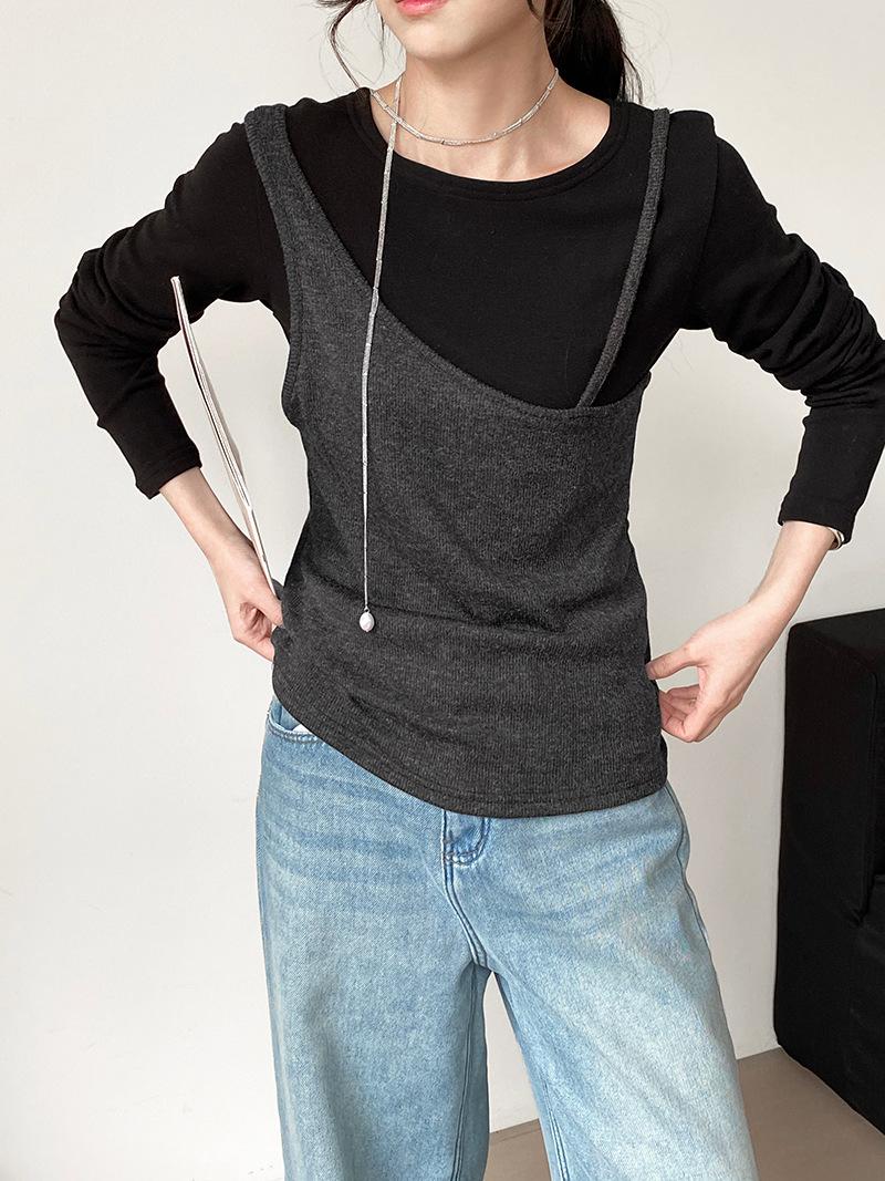 Camiseta de Manga Larga de Diseño Coreano con Sensación de Lijado Falso de Dos Piezas para Mujer, Ajustada, Elástica, Combinable con Todo, Camiseta Básica con Tirantes 2508