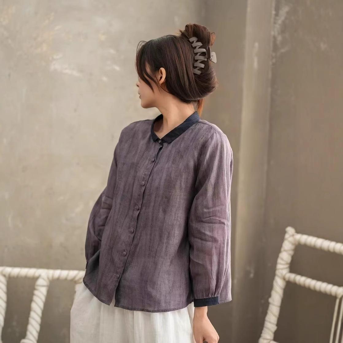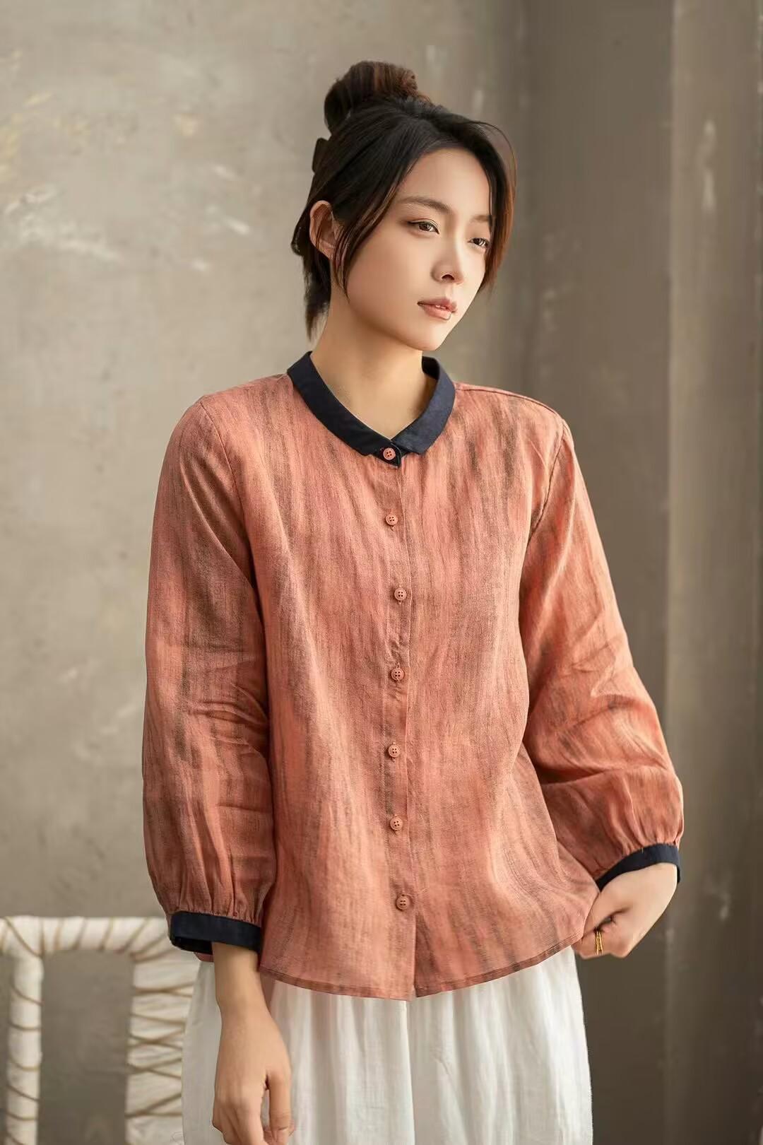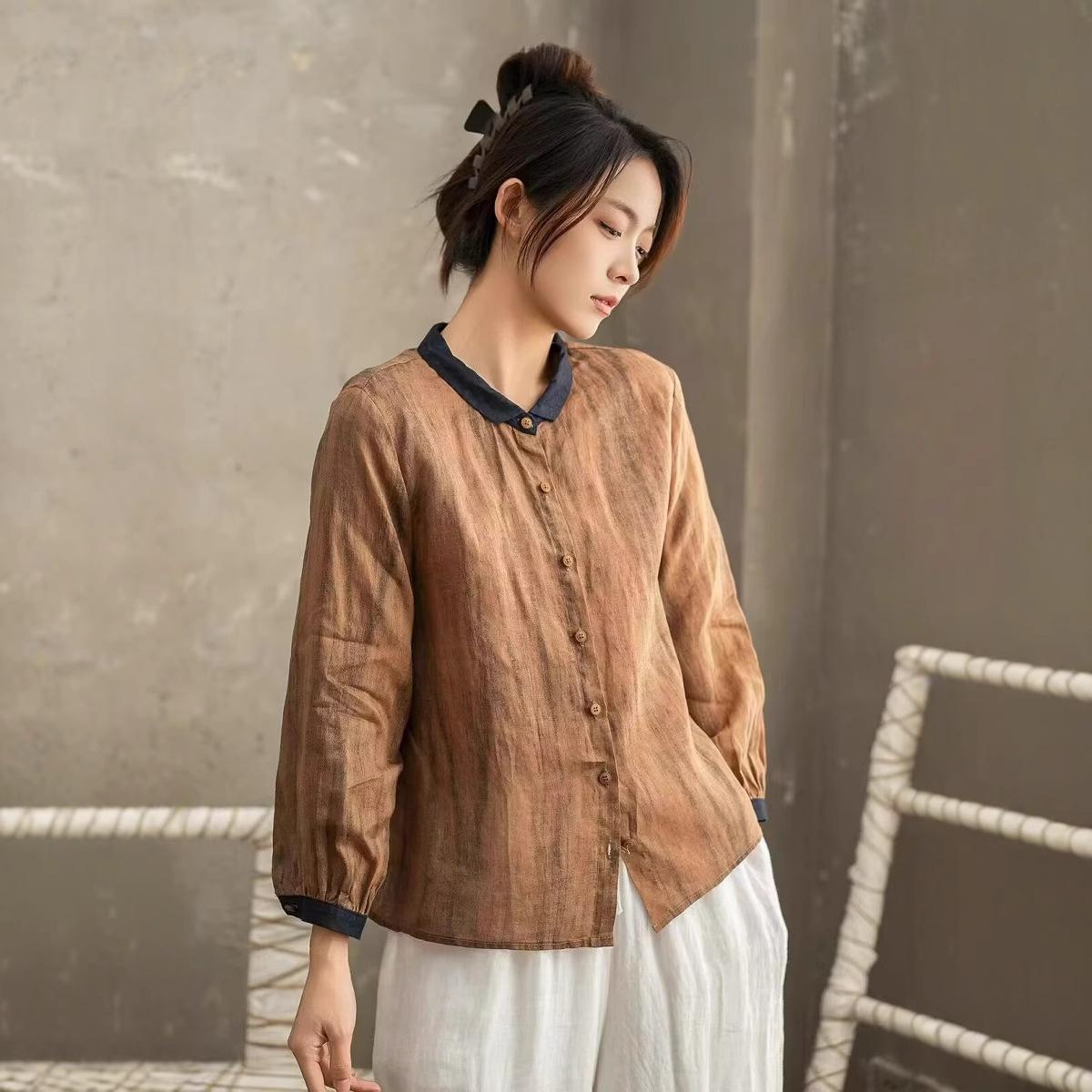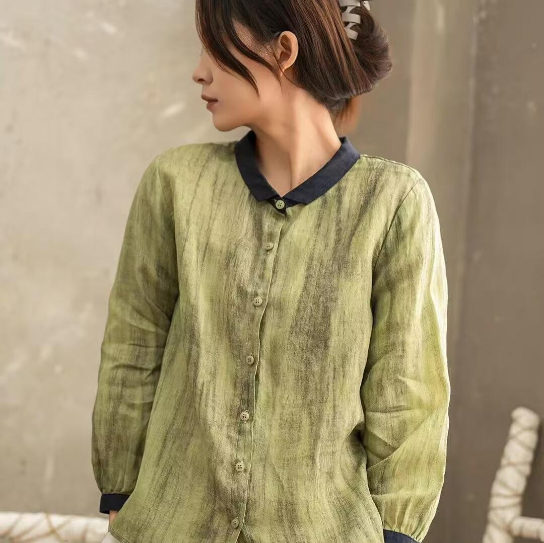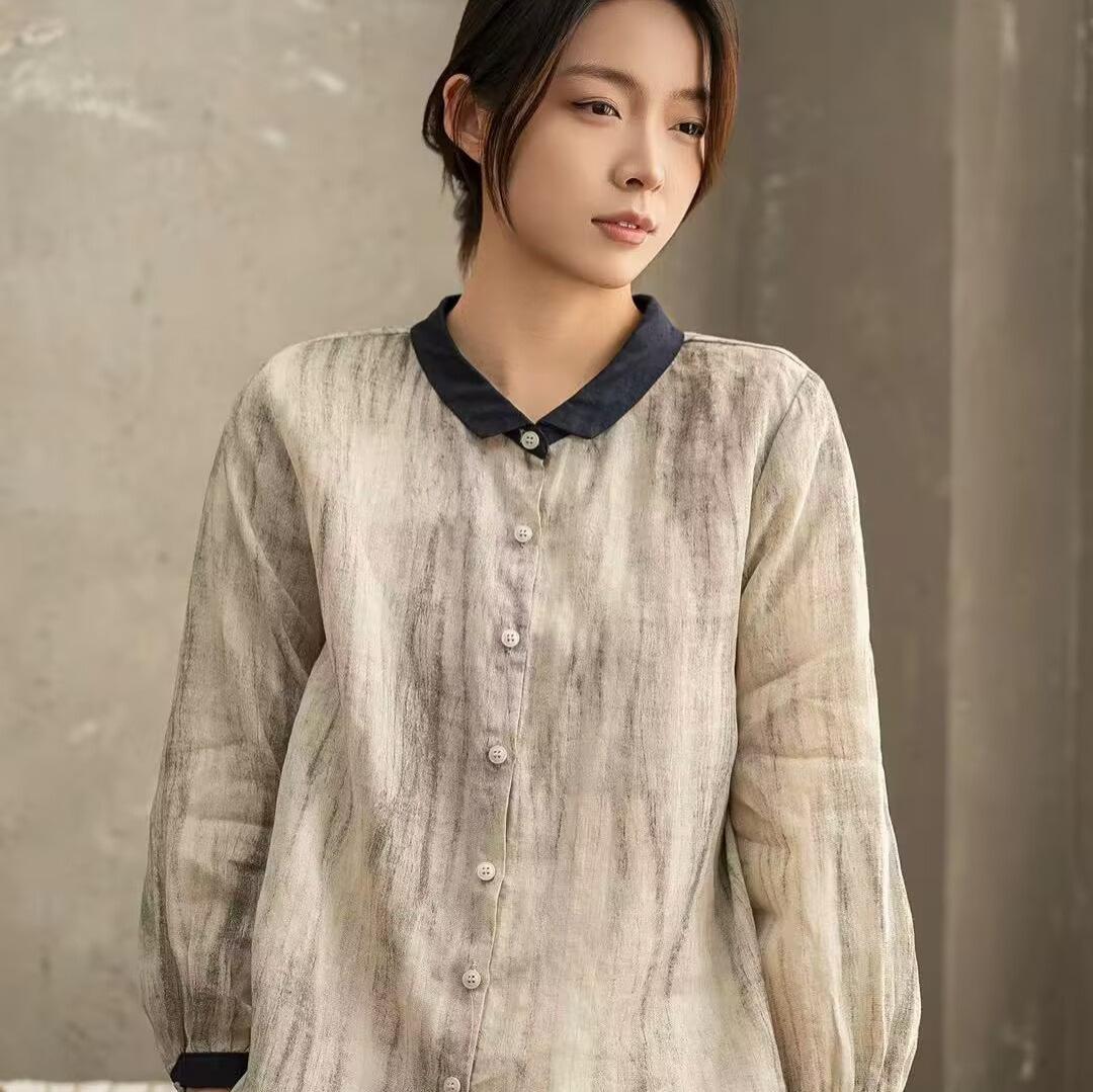 Primavera 2025 Nueva Camisa Retro Estilo Contraste Color-combinado Ramio Abotonadura Sencilla Casual Camisa Artística