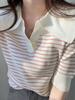 Suéter de manga corta con cuello polo a rayas vintage para mujer, camiseta de verano con hombros finos, prenda superior elegante y antiedad.