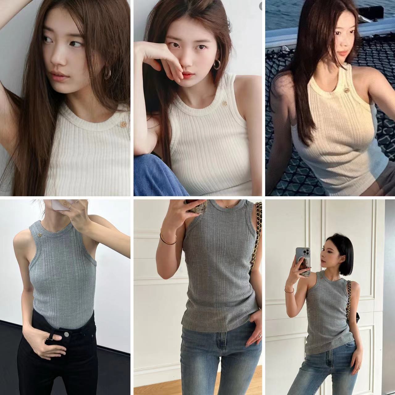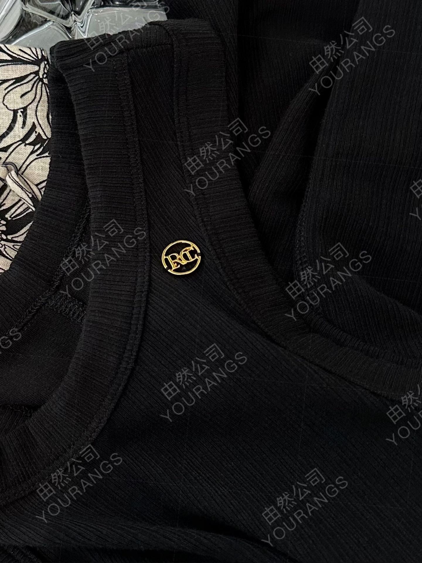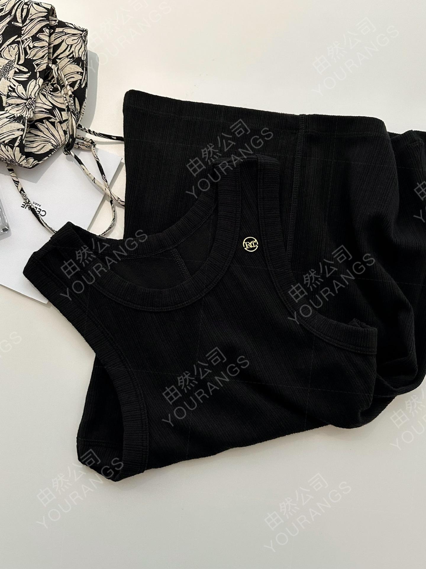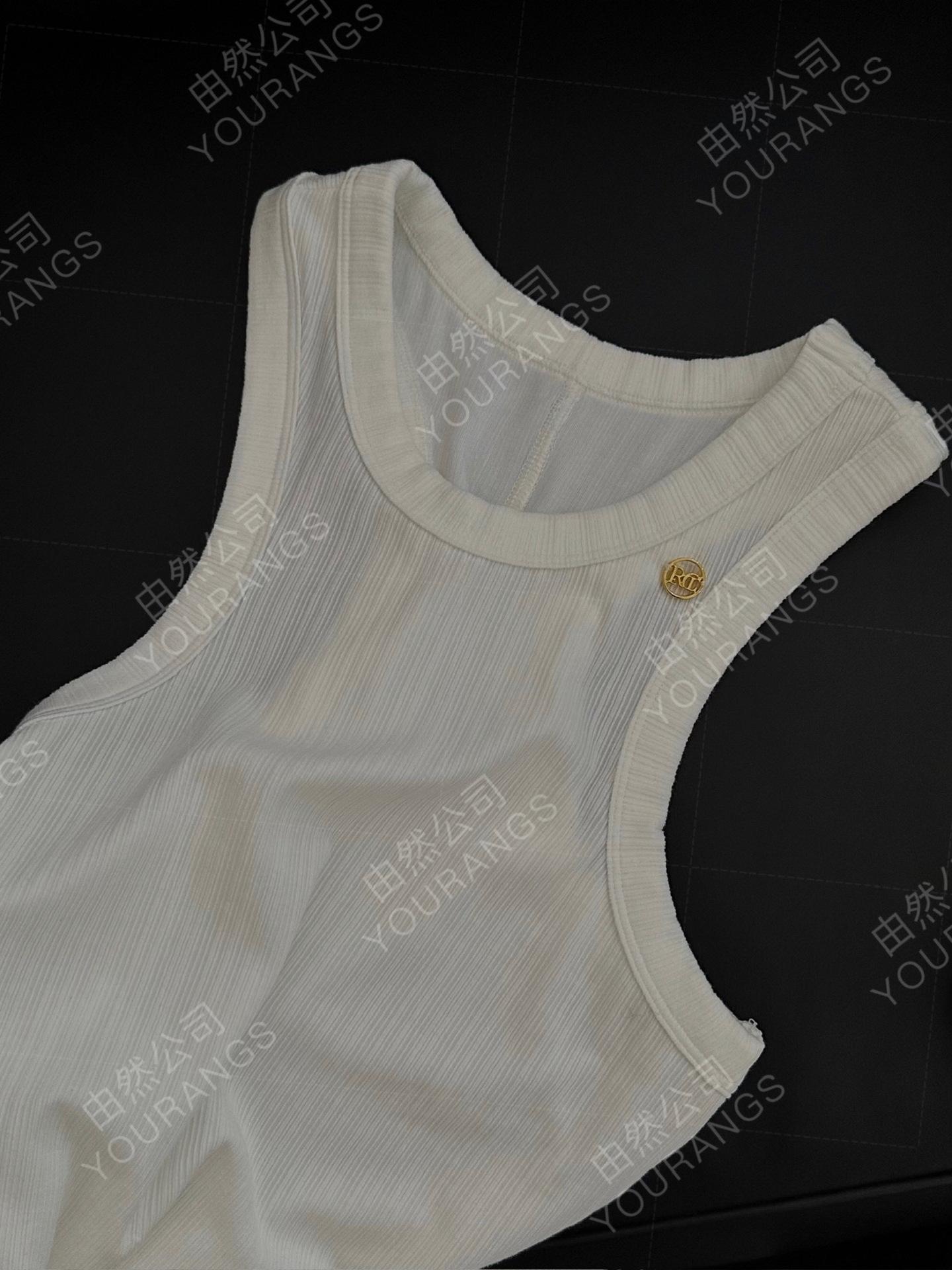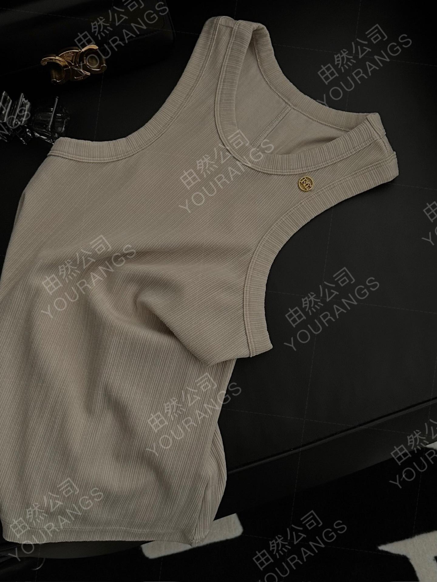 [Kui Qing 50] RE Elástico de Alta Torsión Ligero Canalé Fino Etiqueta Metálica Ajustado Simple Cuello Redondo Tejido Chaleco en I