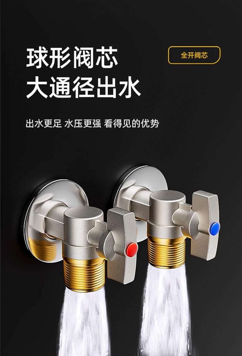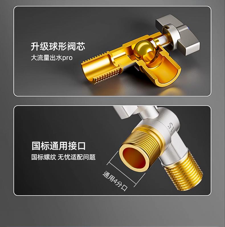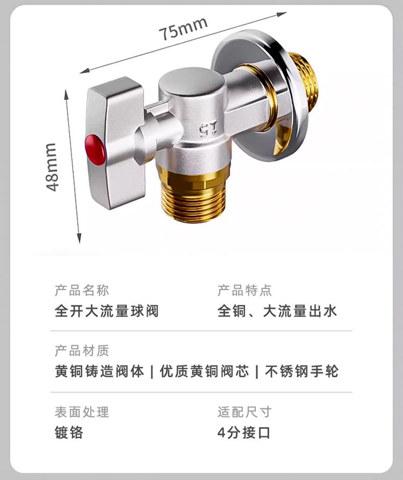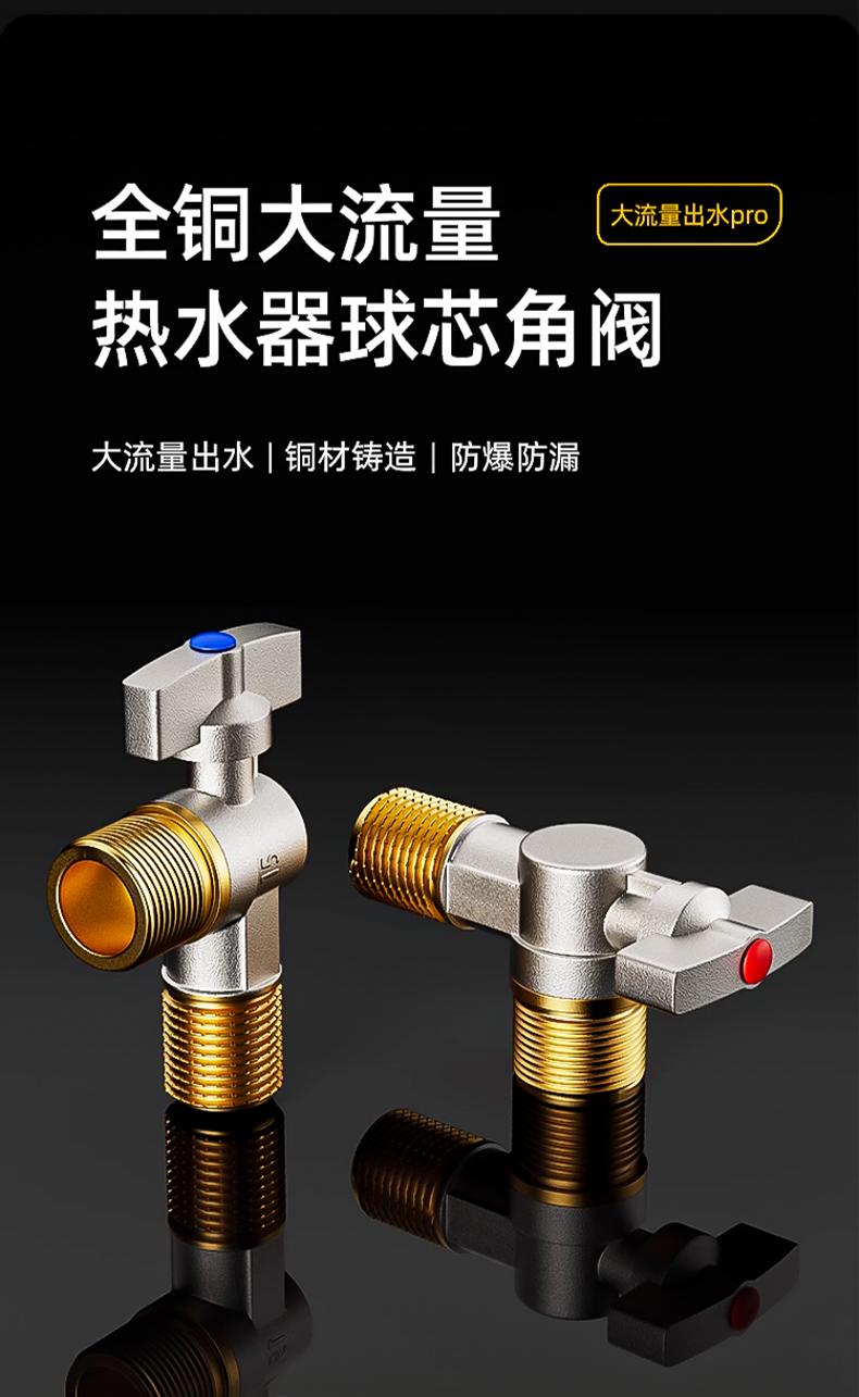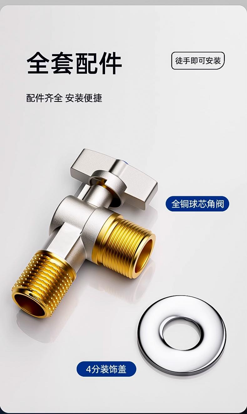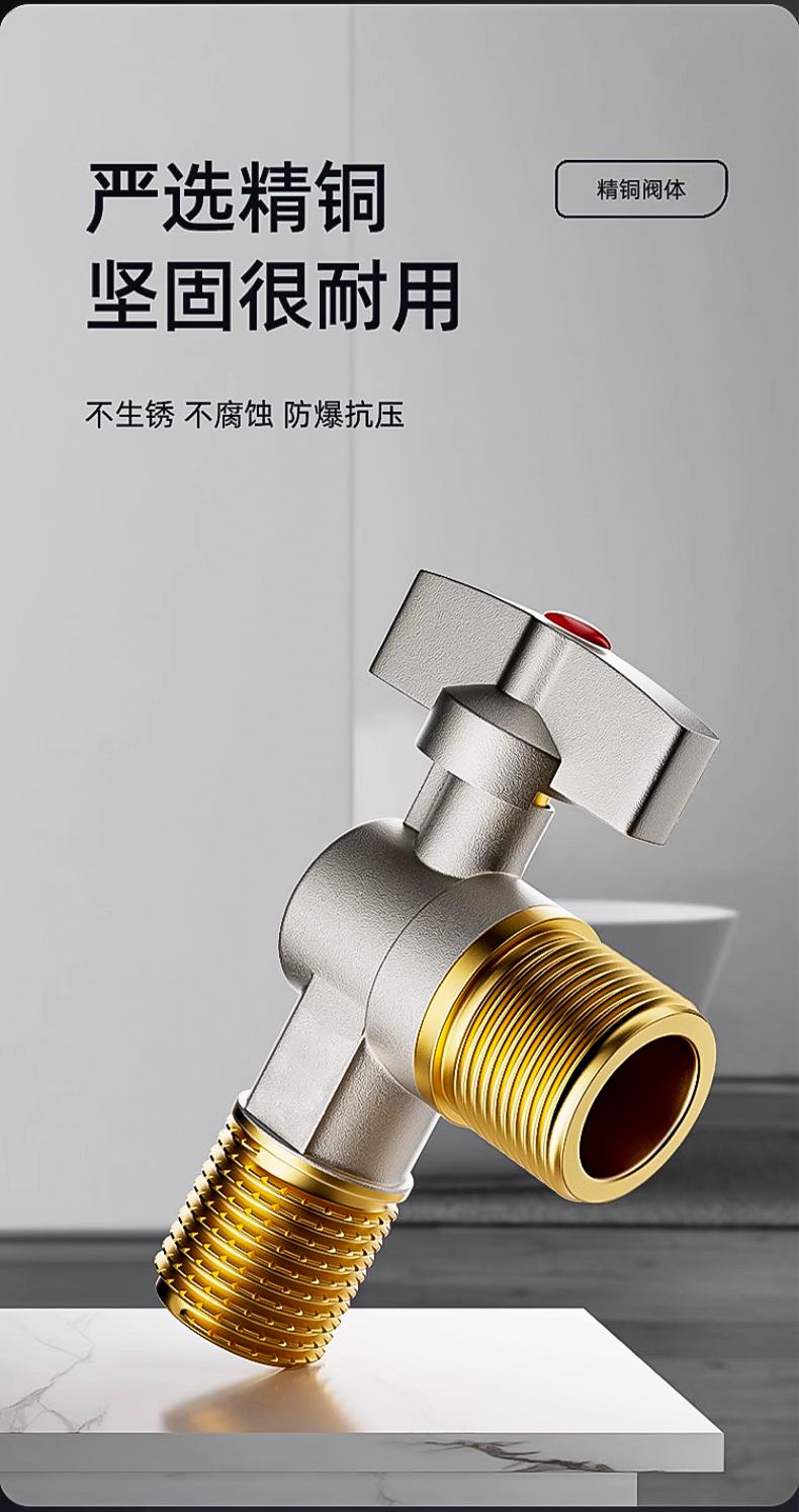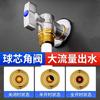 Válvula de ángulo de flujo grande con núcleo de bola totalmente abierto, todo de cobre, calentador de agua a gas para agua fría y caliente, válvula de bola especial, interruptor de válvula triangular de 4 puntos