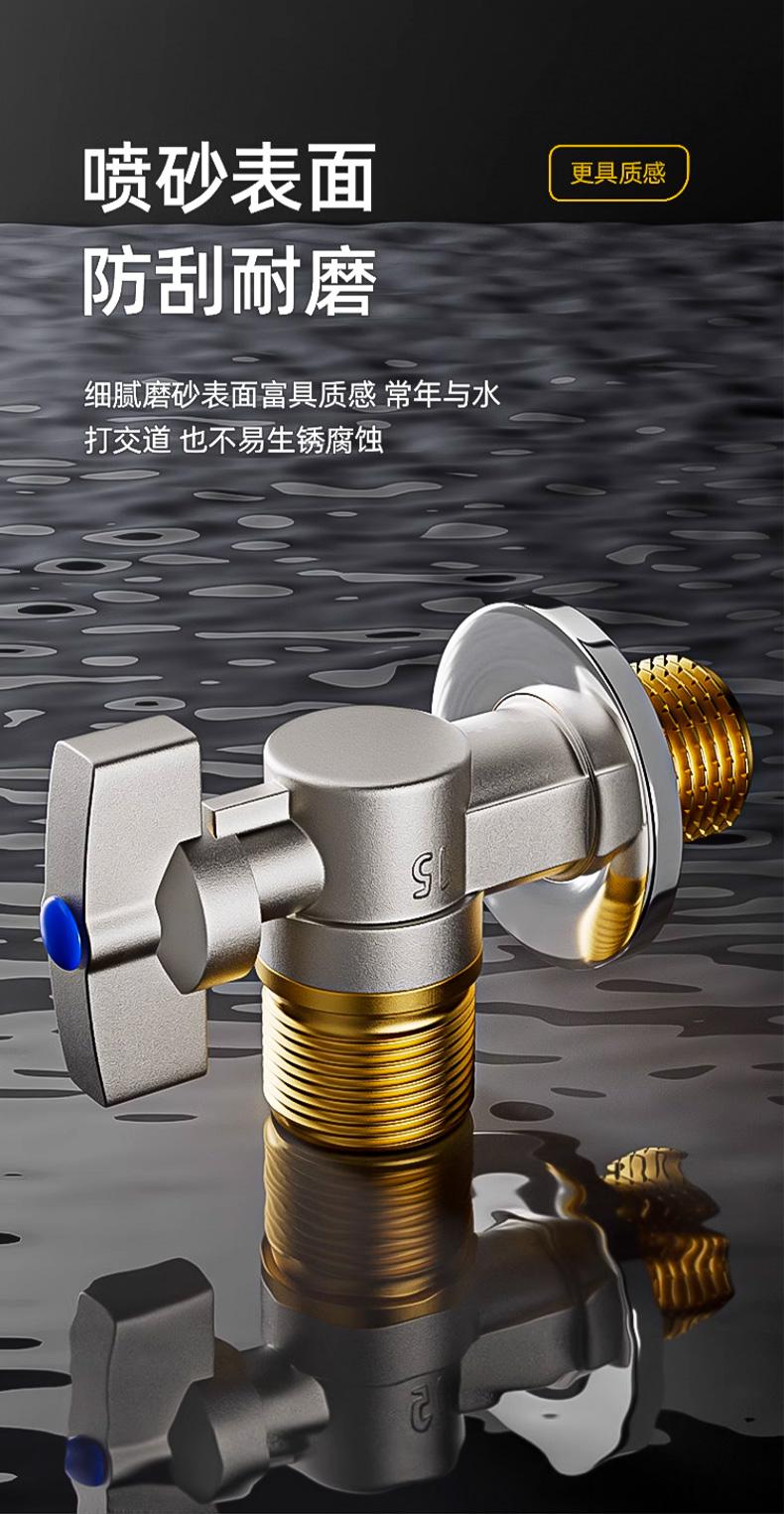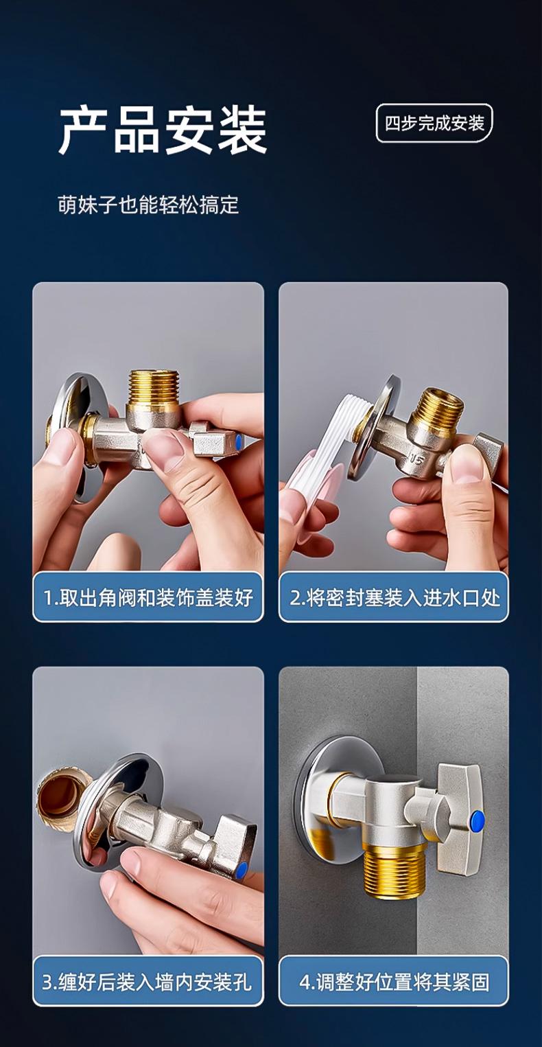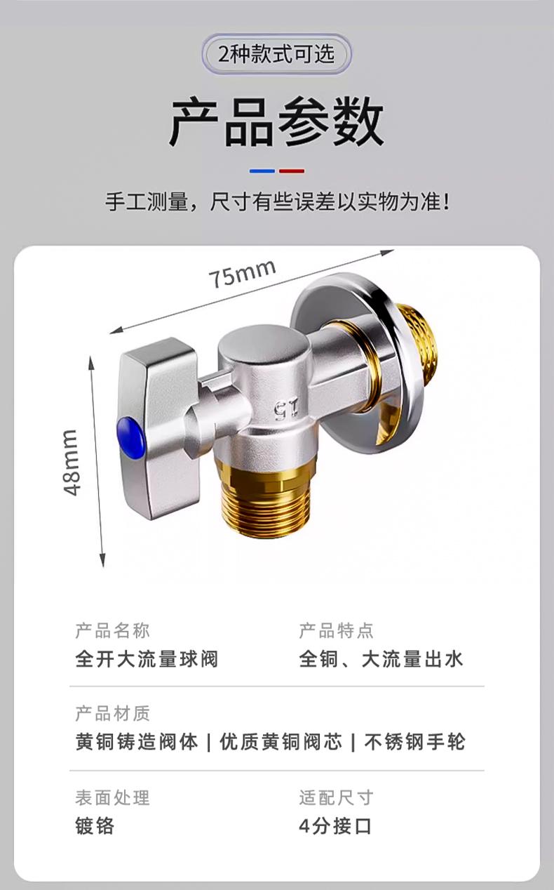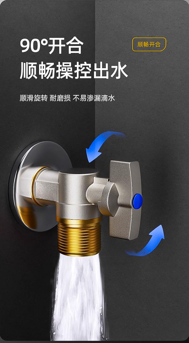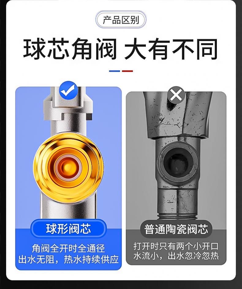 Válvula de ángulo de flujo grande con núcleo de bola totalmente abierto, todo de cobre, calentador de agua a gas para agua fría y caliente, válvula de bola especial, interruptor de válvula triangular de 4 puntos