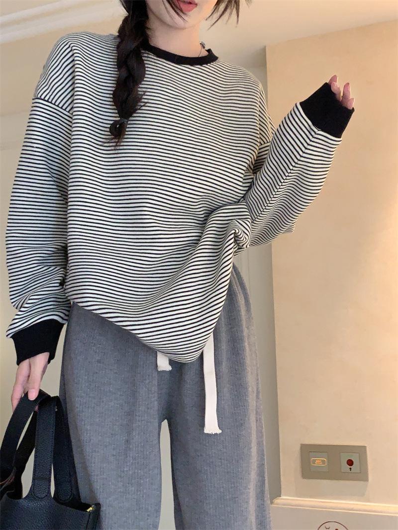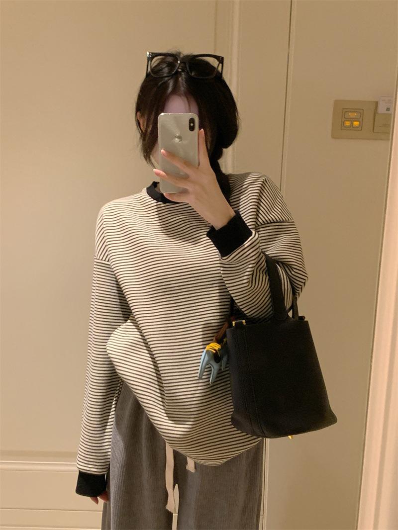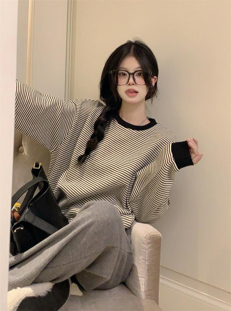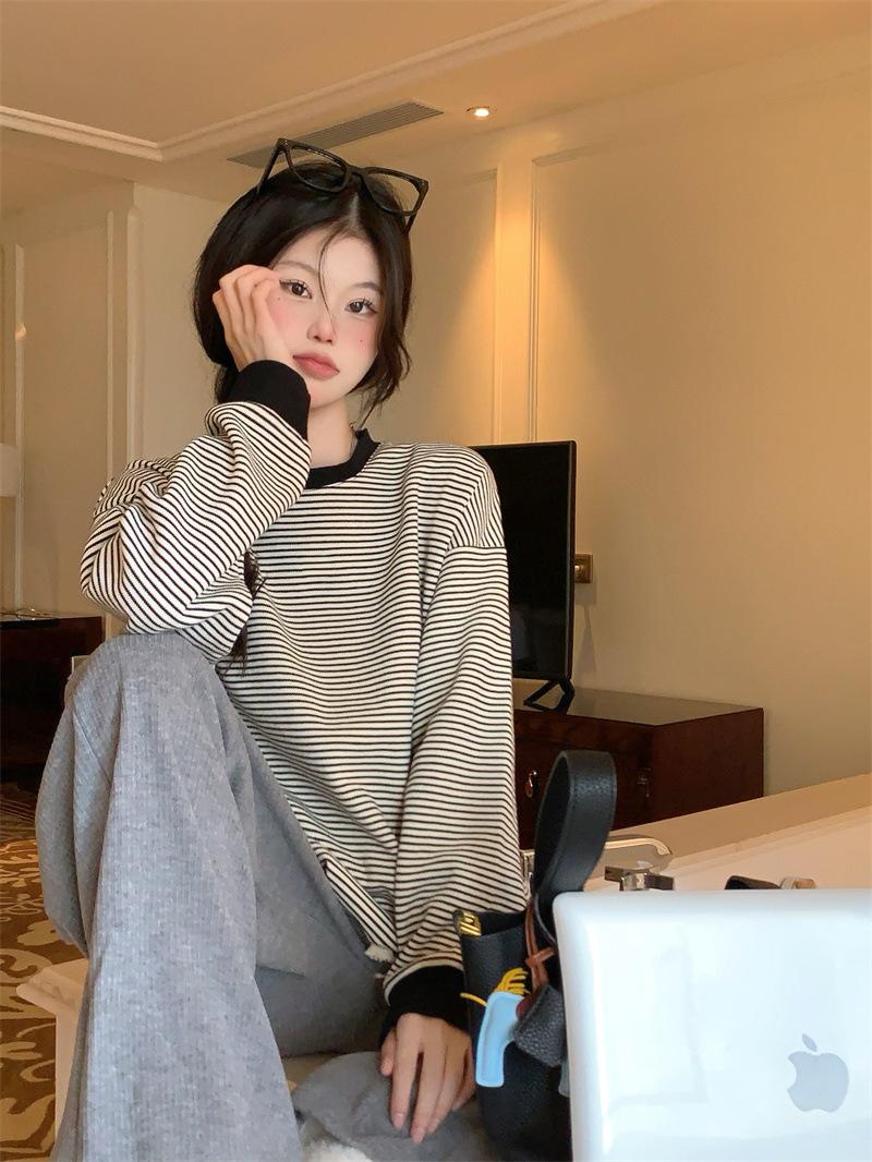 Suéter Camiseta de Manga Larga a Rayas para Mujer Otoño 2024 Nueva Suelta Versátil Cuello Redondo Casual Sudadera de Estudiante Top de Moda
