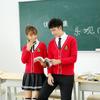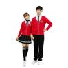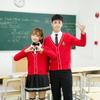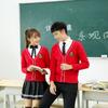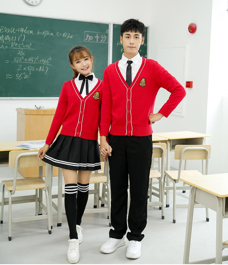 Women's red cardigan + pure white long sleeve + black stripe skirt + black bow suit, Men's red cardigan + pure...