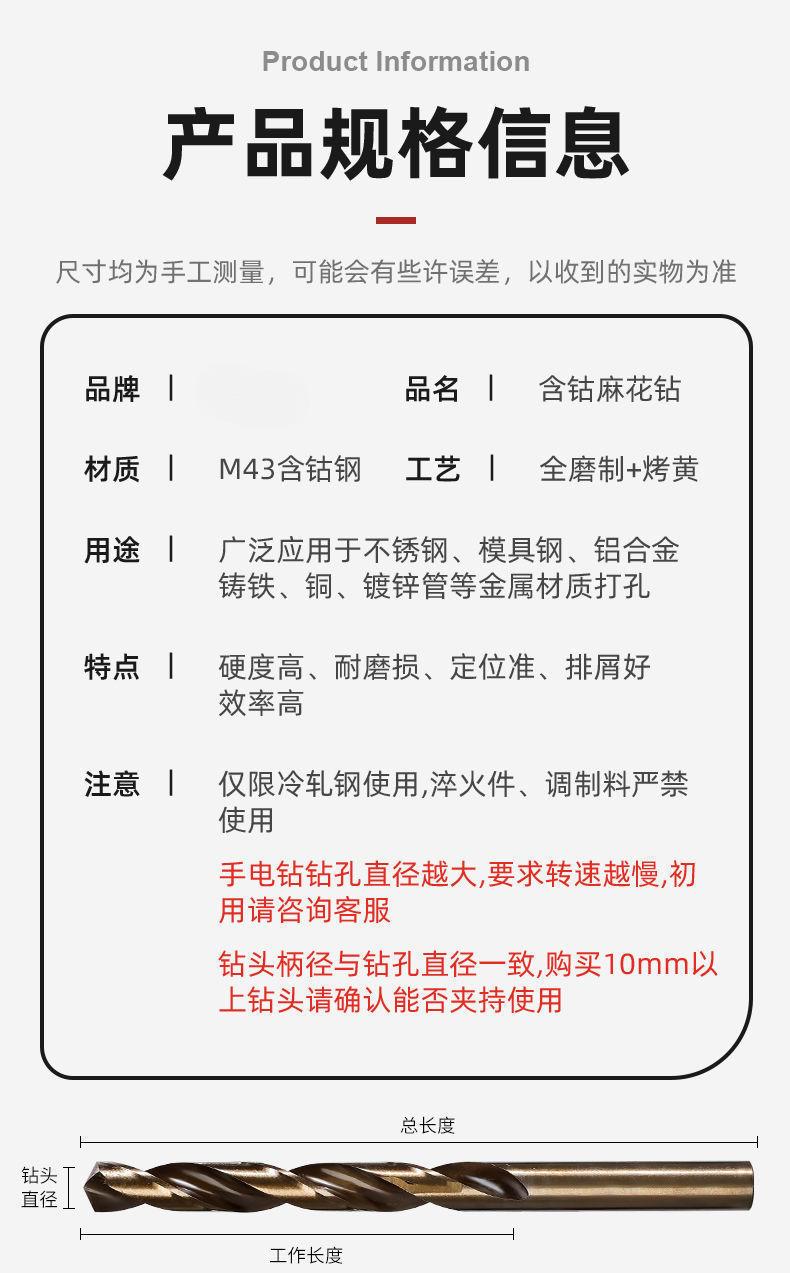 Broca helicoidal Broca de cobalto Acero inoxidable Taladro especial de alta dureza Placa de acero Taladro de metal Madera Acero de alta velocidad Torreta