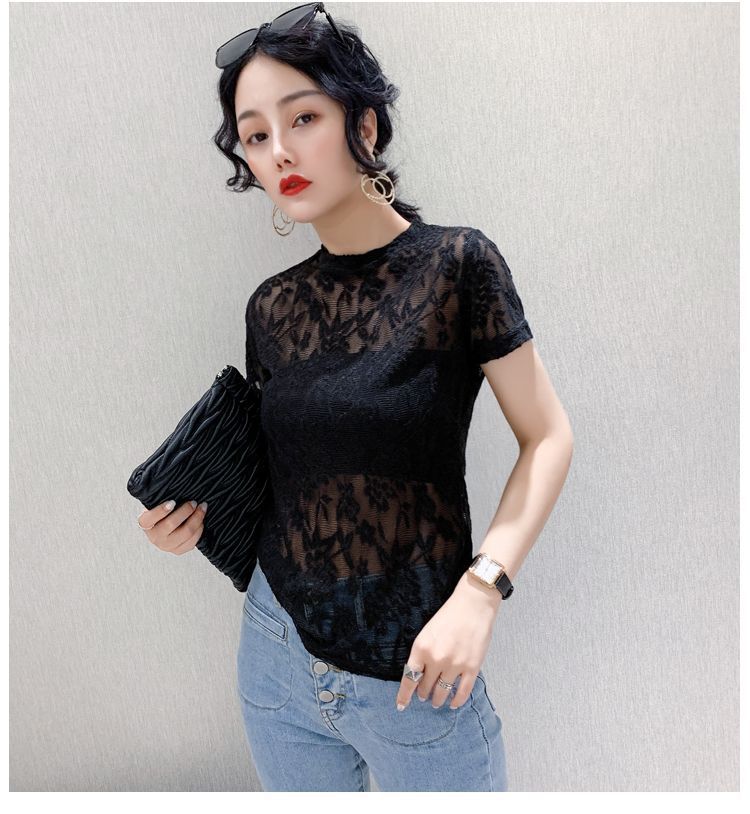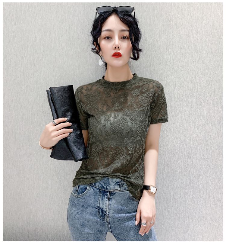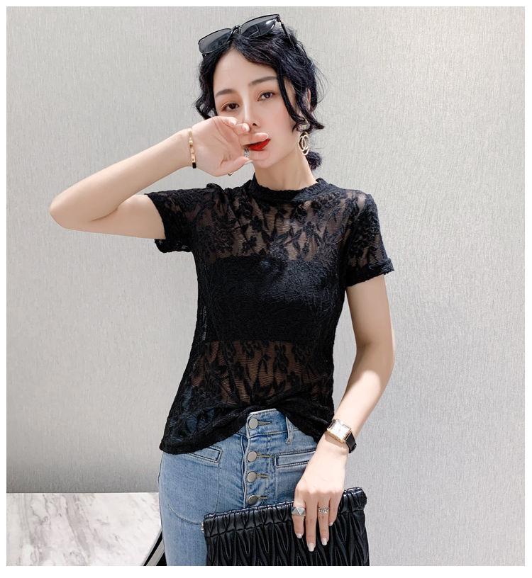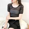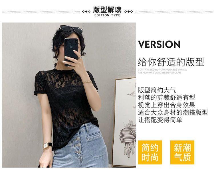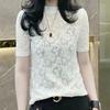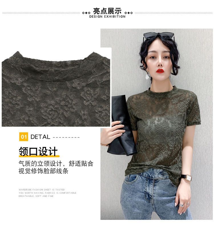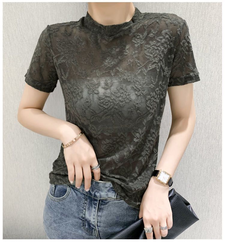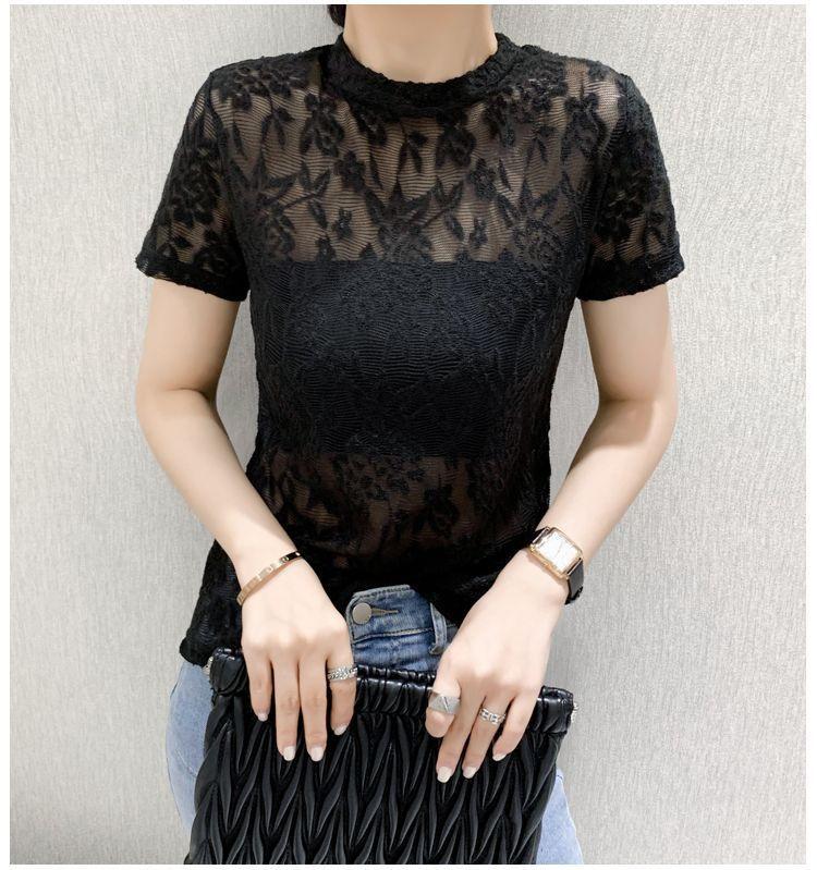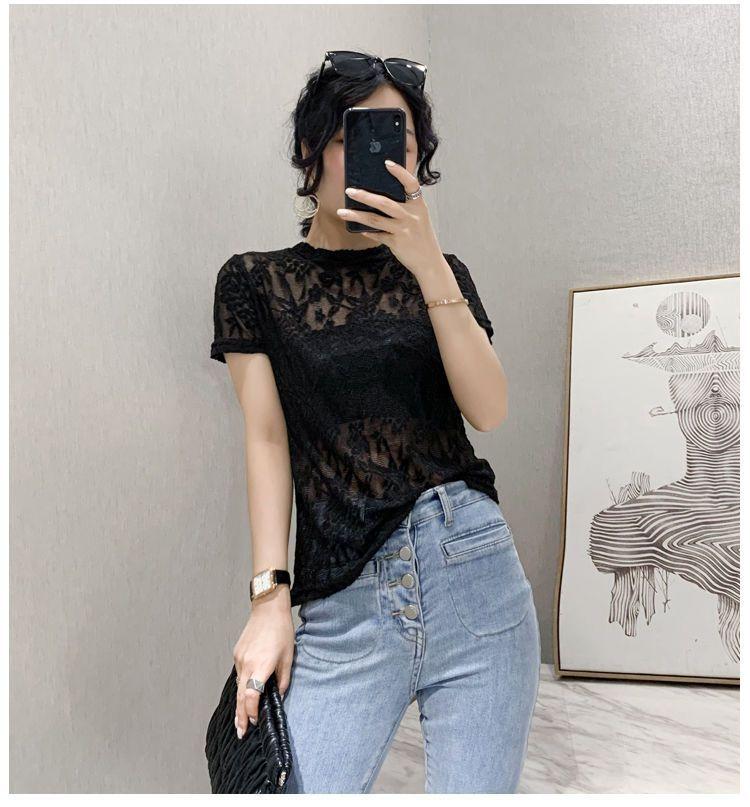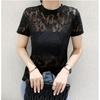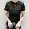 [Enviar sin tirantes] Camiseta de manga corta de encaje con protección solar de manga corta para mujer, Estación Europea, Hueca, Estilo Occidental, Camiseta base de malla