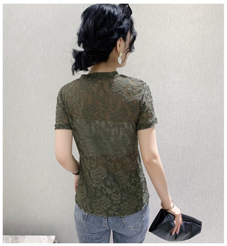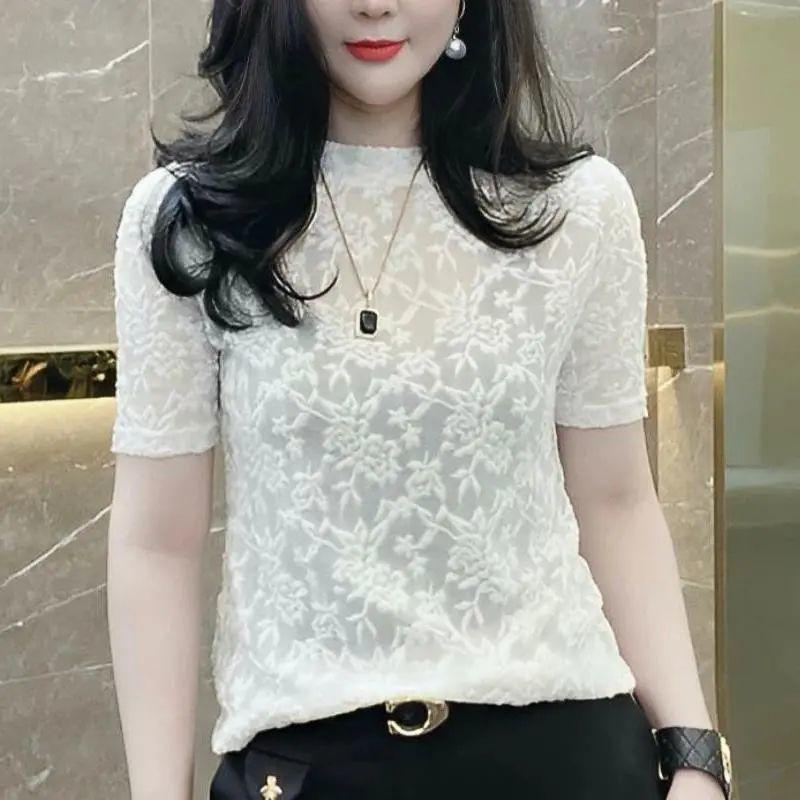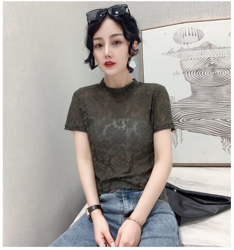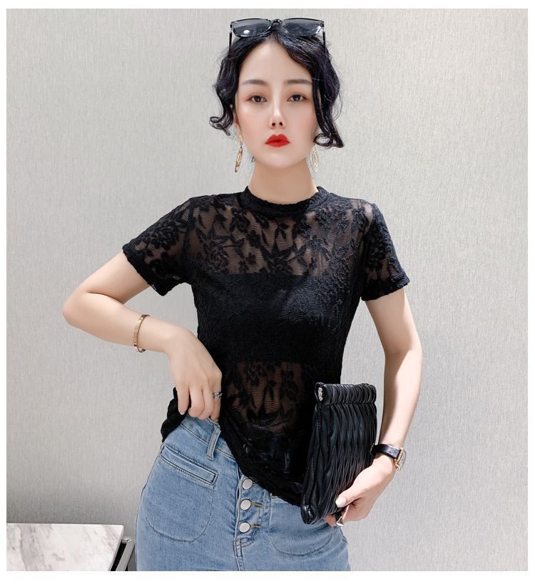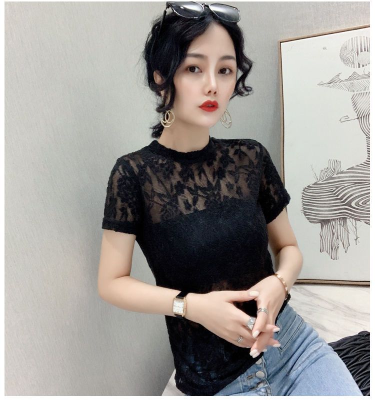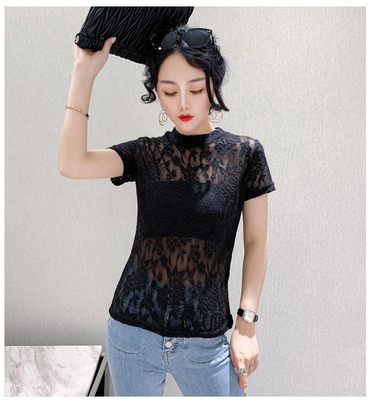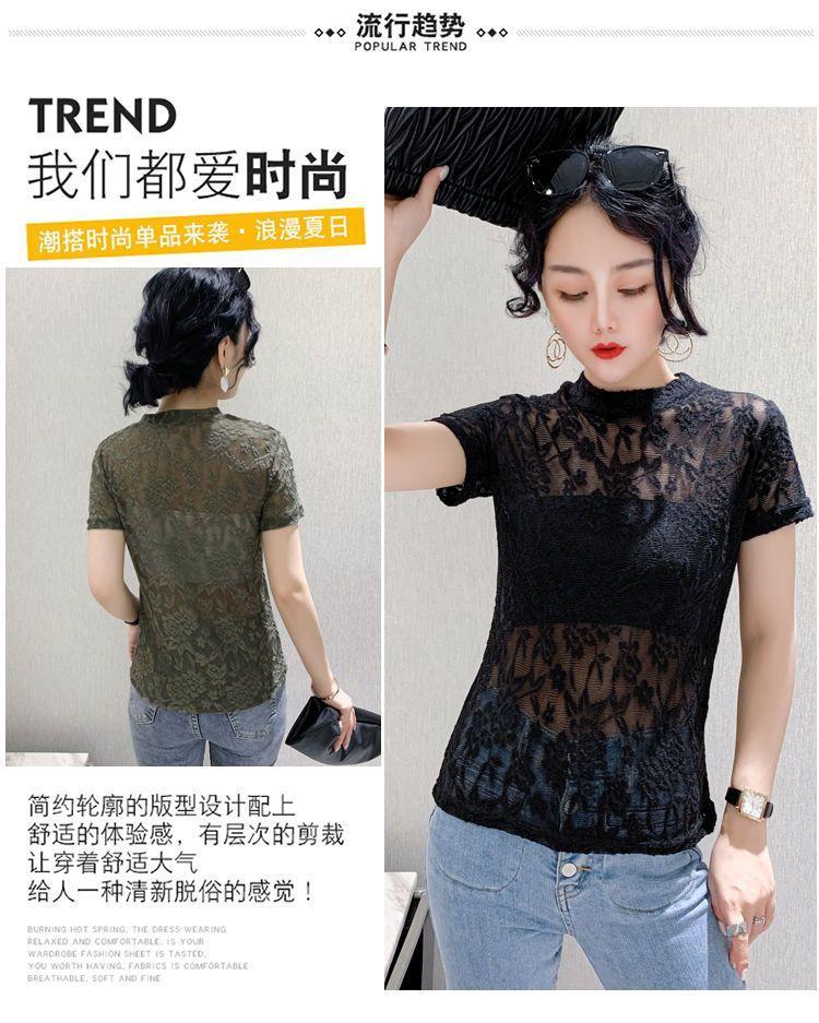 [Enviar sin tirantes] Camiseta de manga corta de encaje con protección solar de manga corta para mujer, Estación Europea, Hueca, Estilo Occidental, Camiseta base de malla