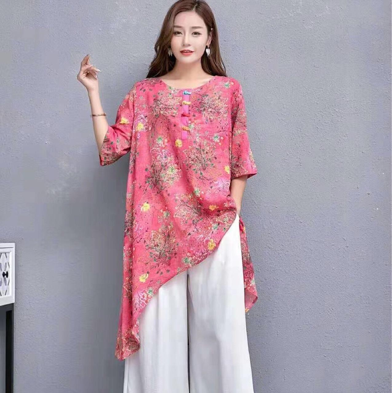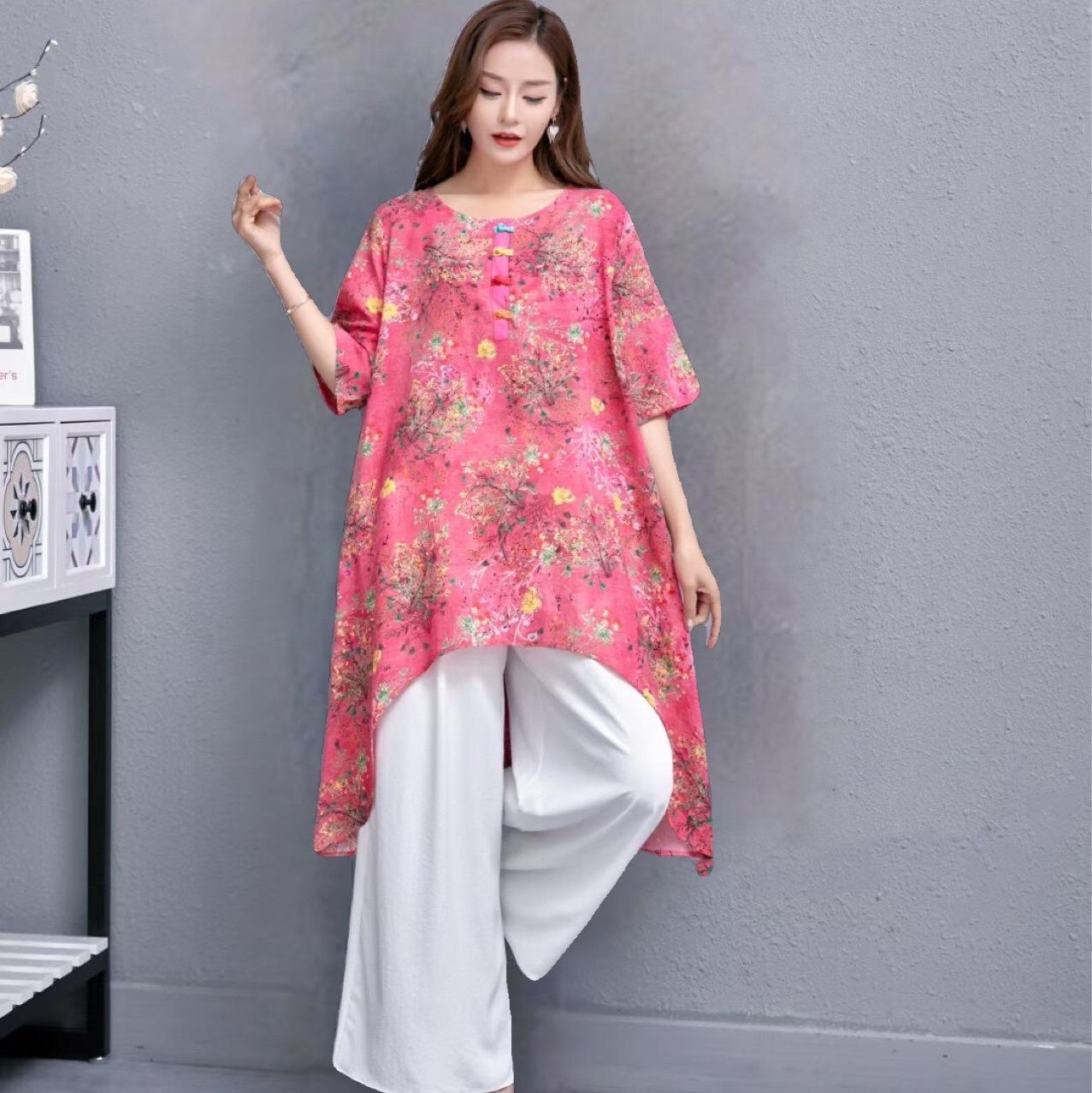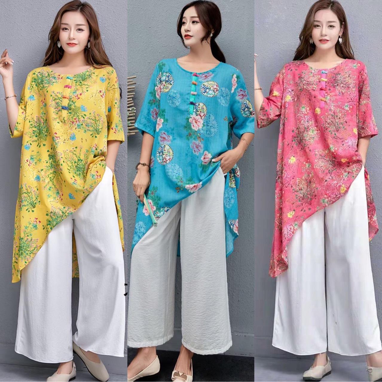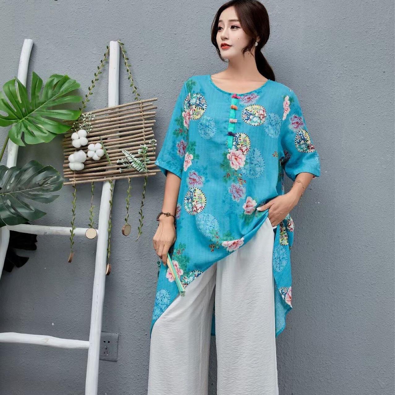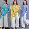 Ropa de Mujer de Estilo Étnico 2022 Verano Nuevo Algodón y Lino Estampado Delgado Top de Mujer y Pantalones de Pierna Recta Conjunto Casual