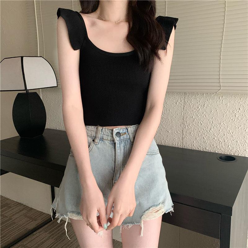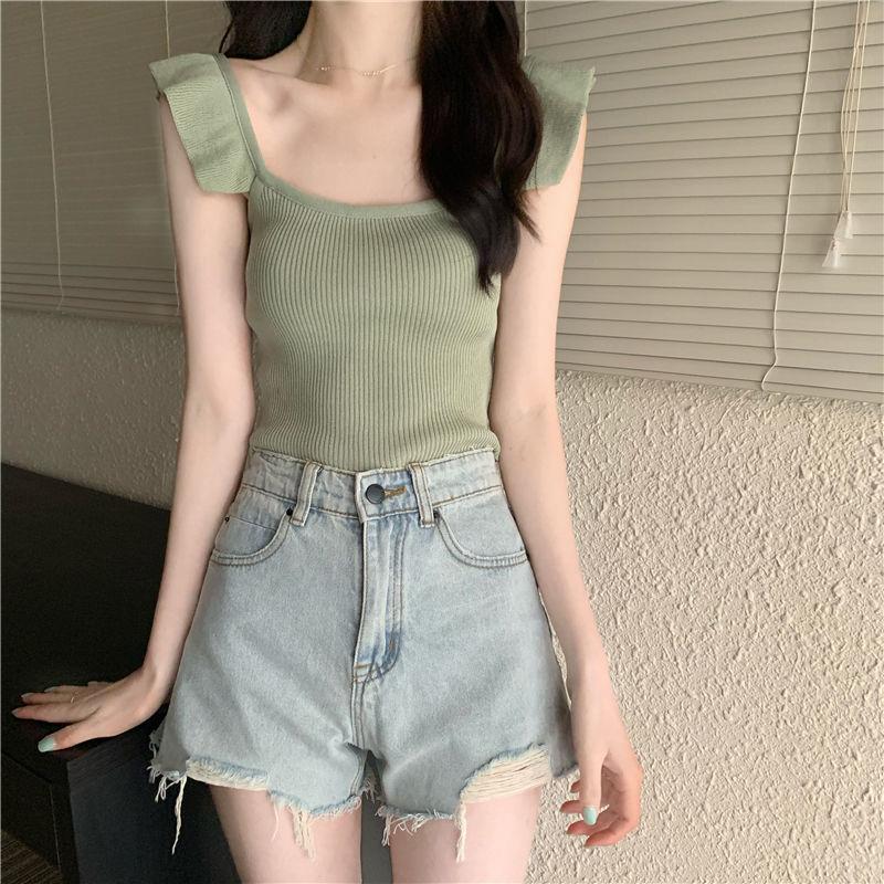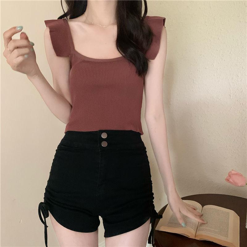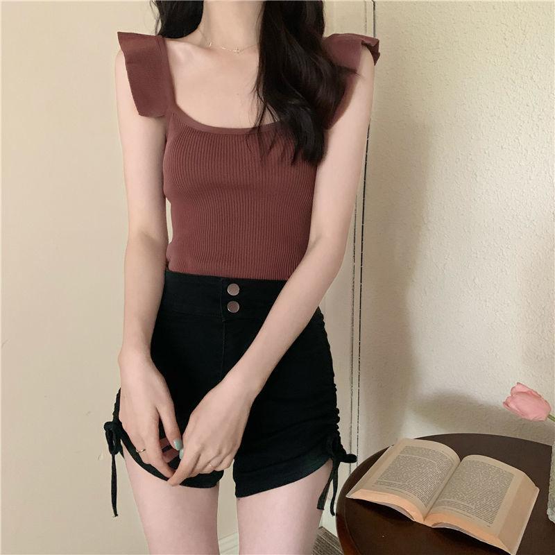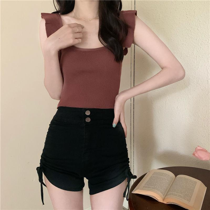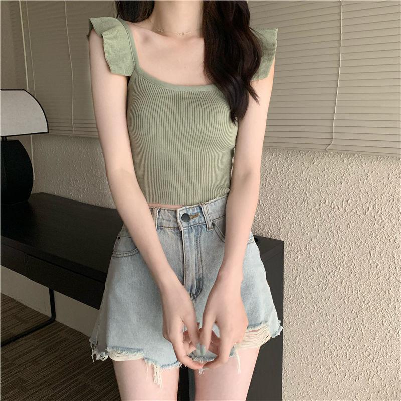 Compra Chaleco de punto francés con volantes y manga corta volada para mujer, diseño nicho de verano, corto, grande, sin mangas con cuello U al por mayor en Joom.pro