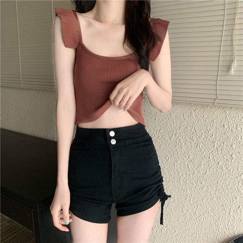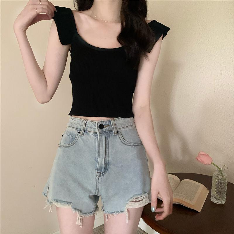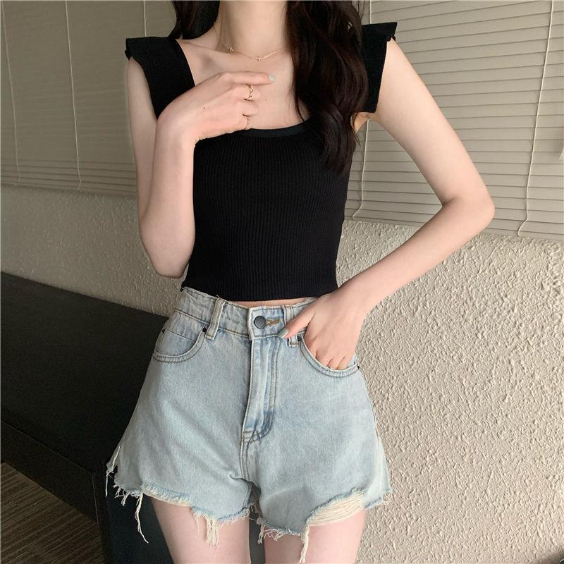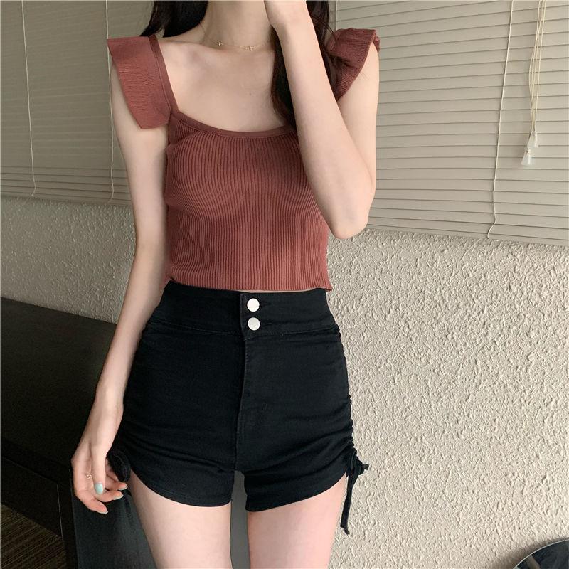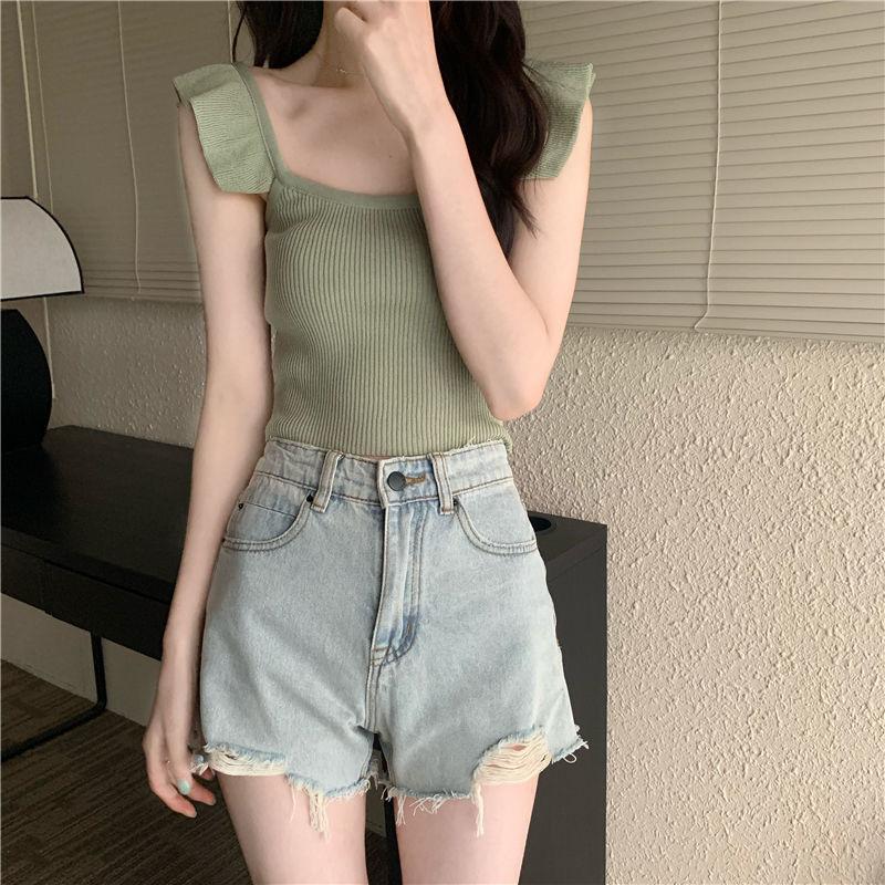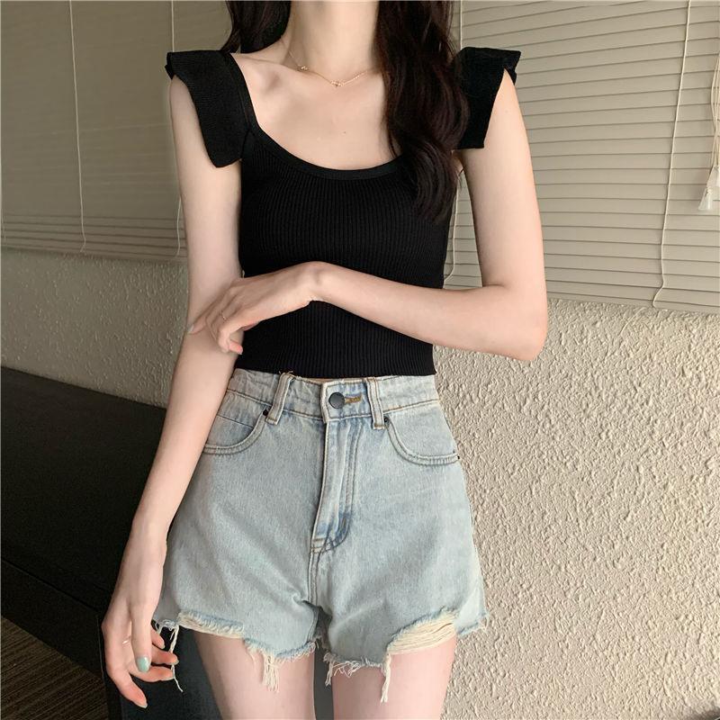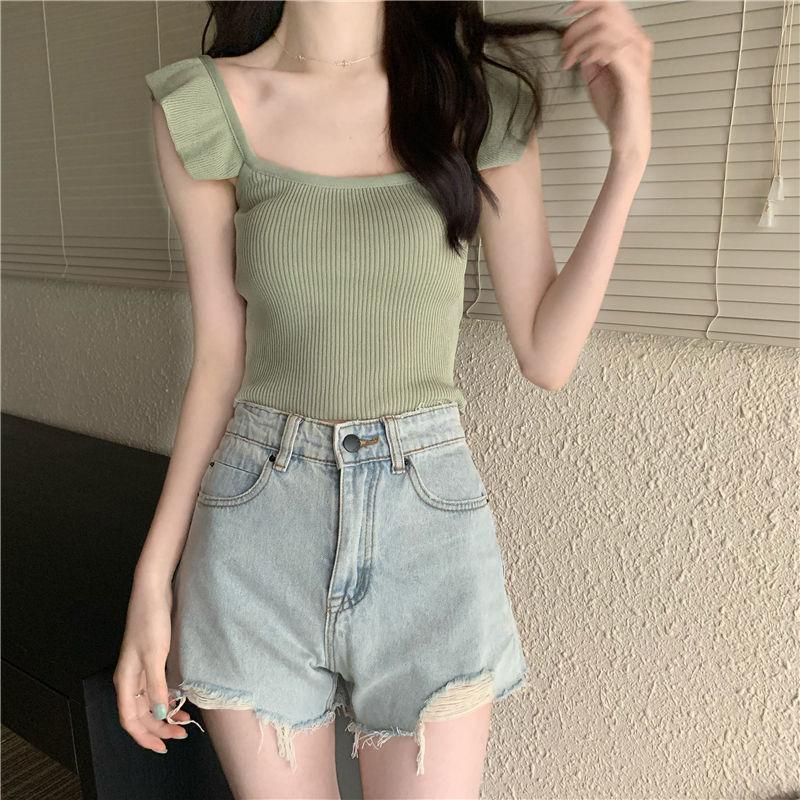 Compra Chaleco de punto francés con volantes y manga corta volada para mujer, diseño nicho de verano, corto, grande, sin mangas con cuello U al por mayor en Joom.pro