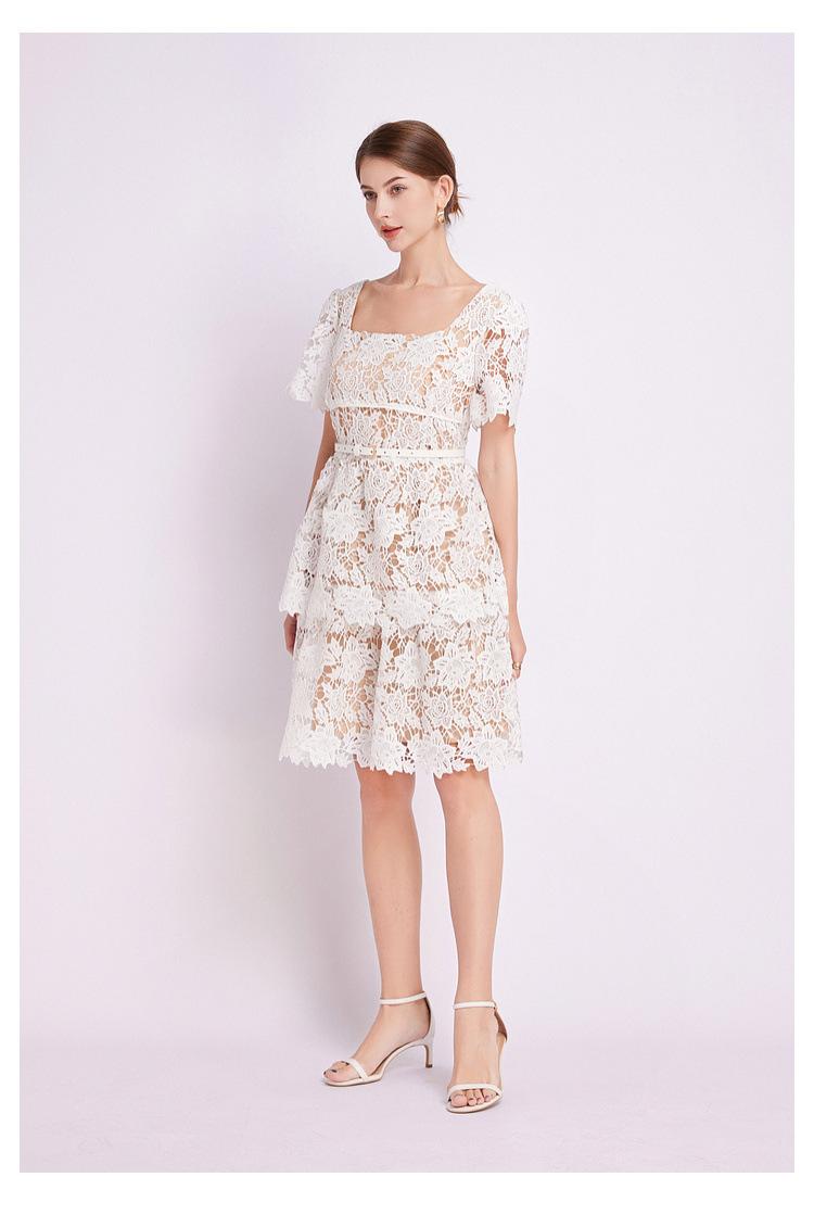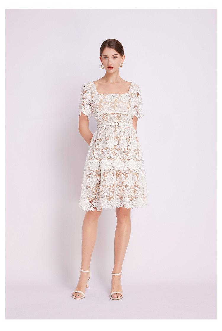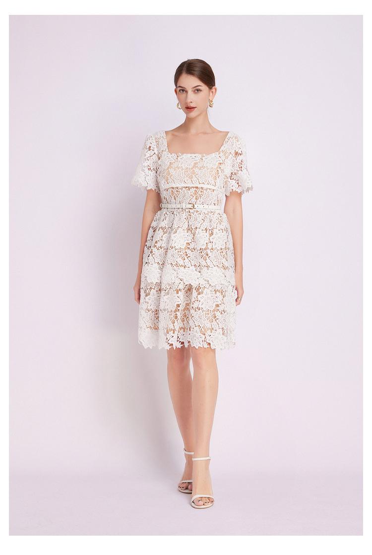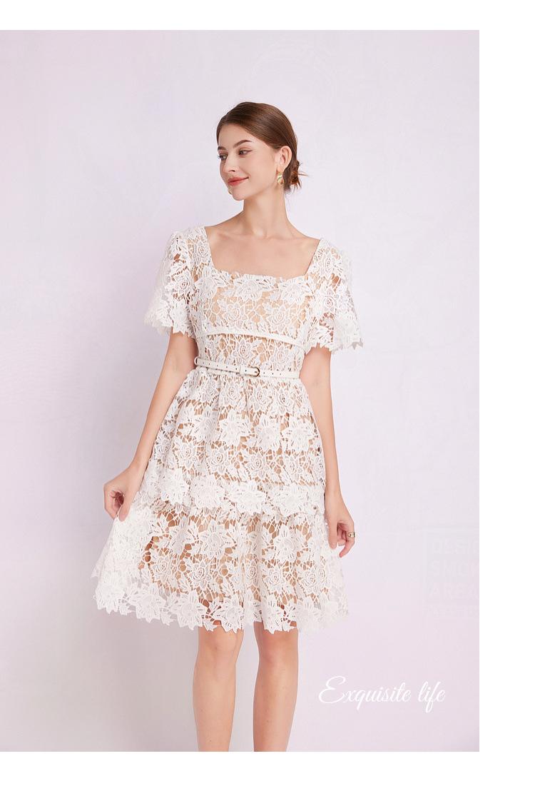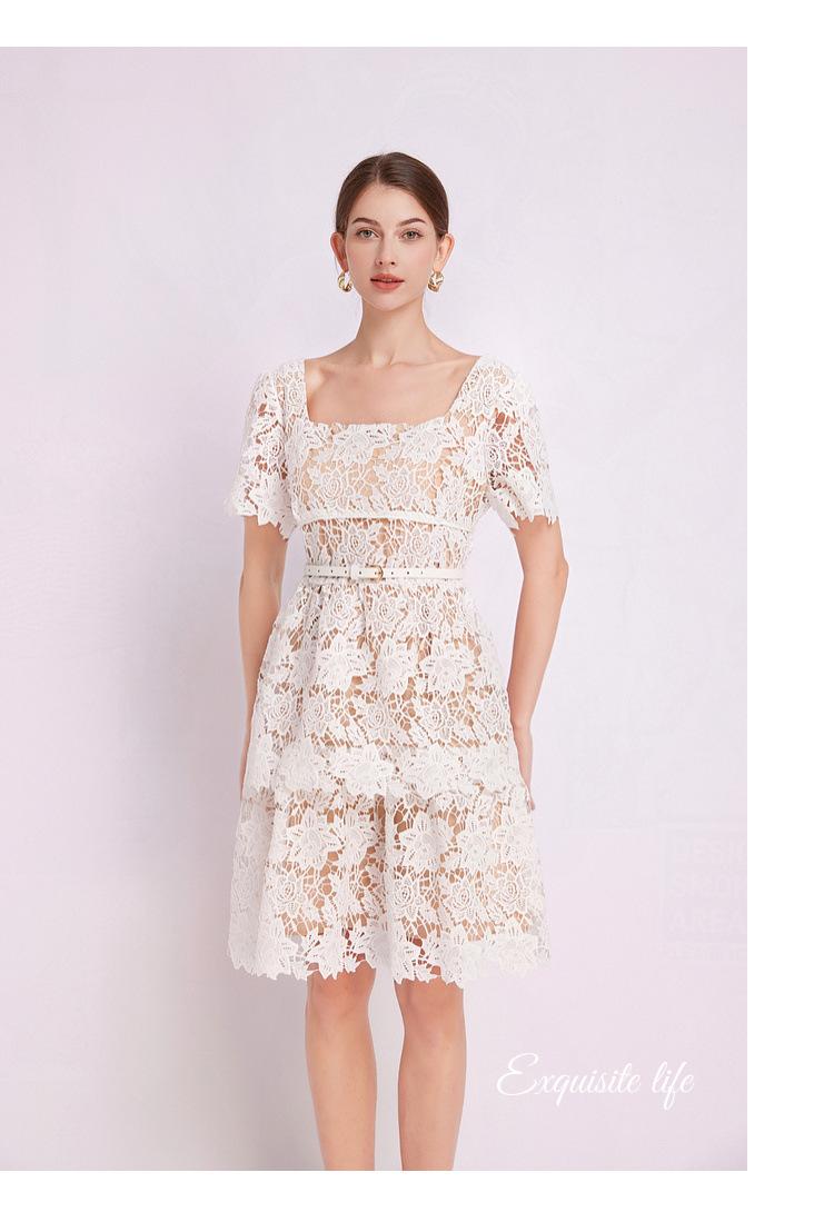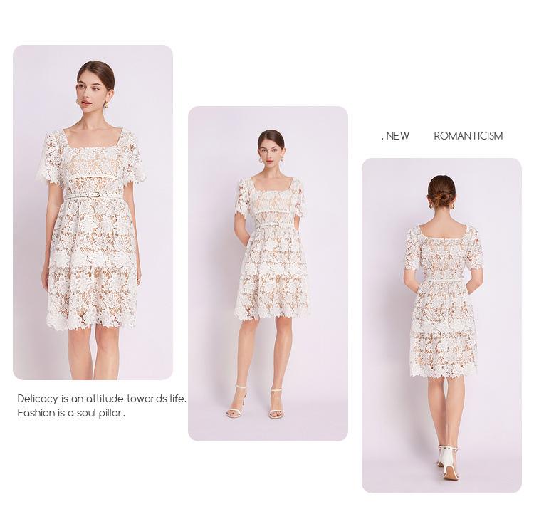 Vestido de Diosa de la Estación Europea 2024 Otoño y Verano Nuevo Color Sólido Encaje Soluble en Agua Cuello Cuadrado Manga Corta Vestido de Pastel