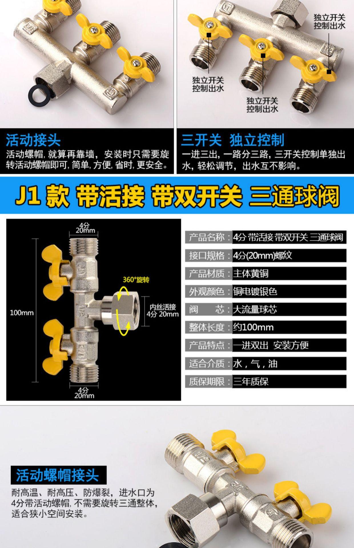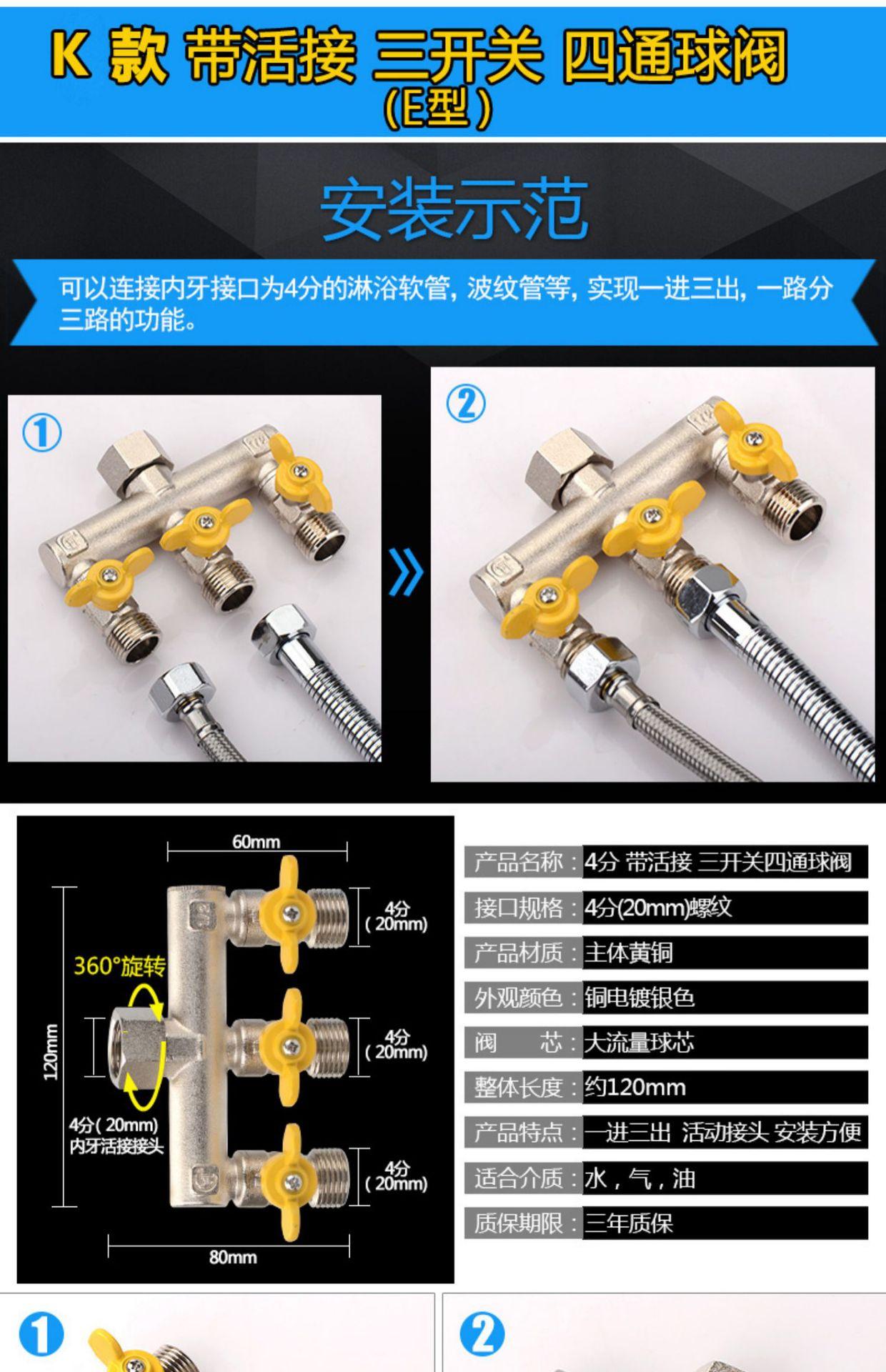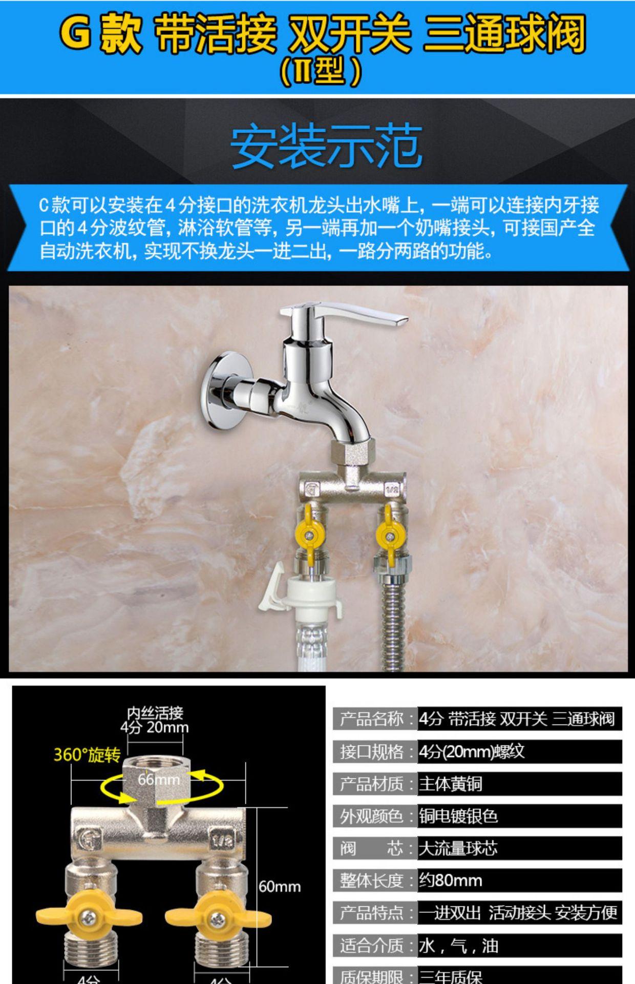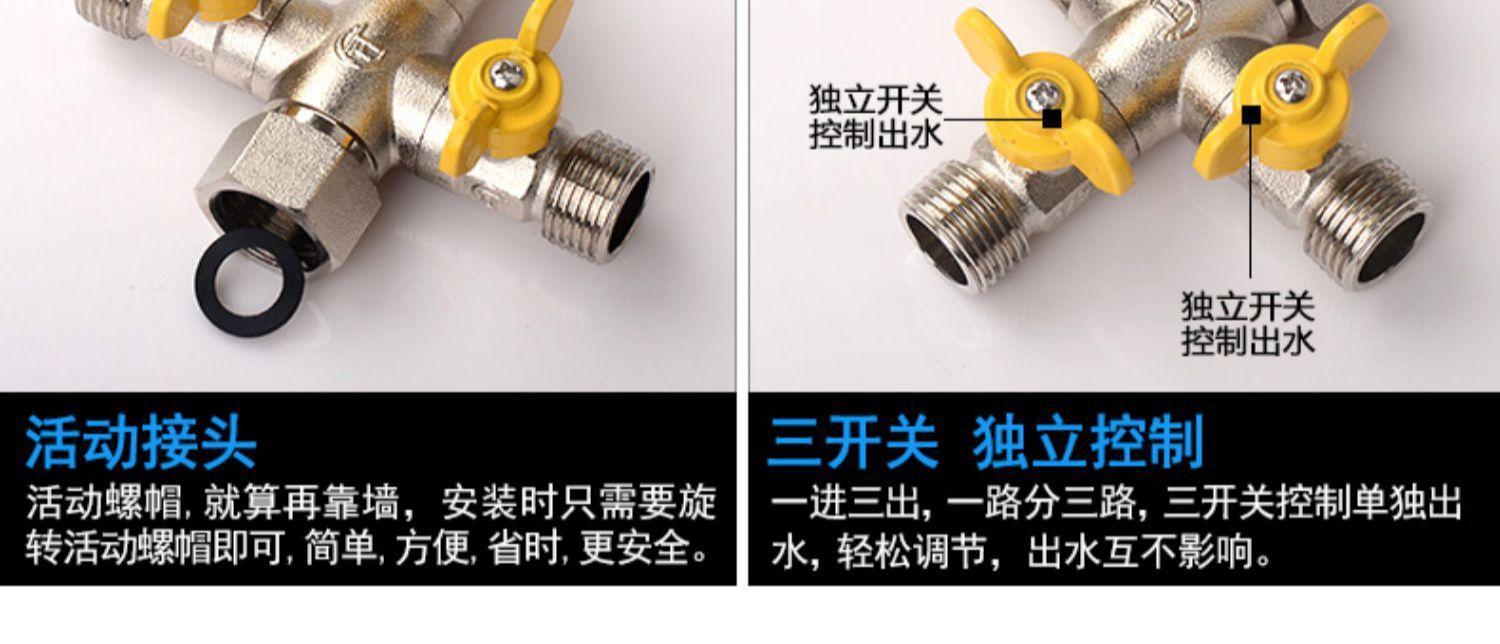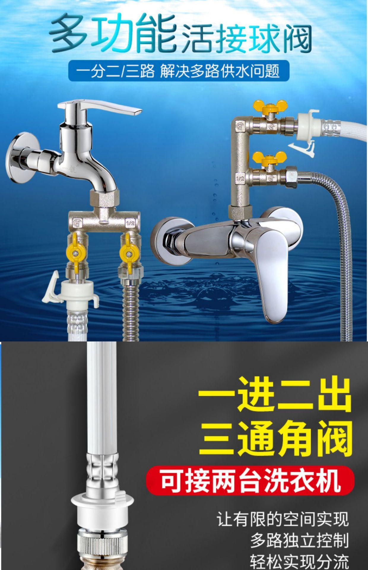 Separador de agua con válvula de bola de tres vías y 4 puntos de cobre, accesorios de interruptor de unión de tubería de agua, interior y exterior, para lavadoras, una de entrada, dos de salida y cuatro