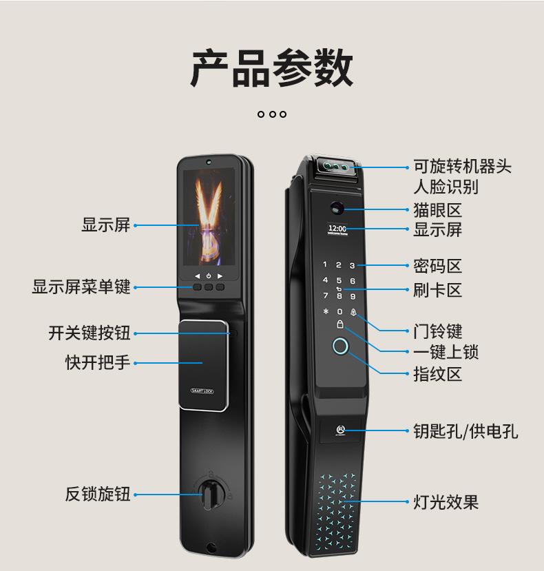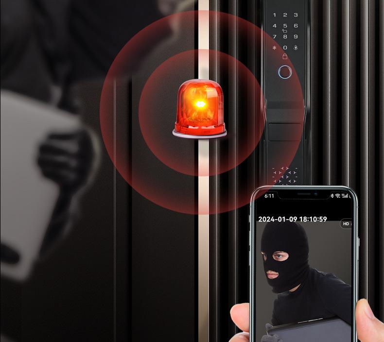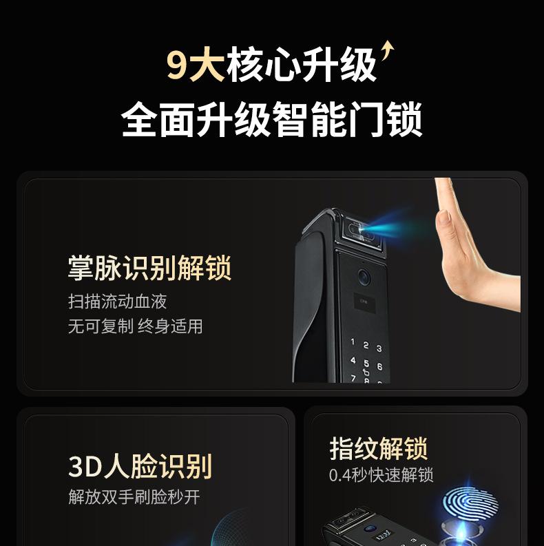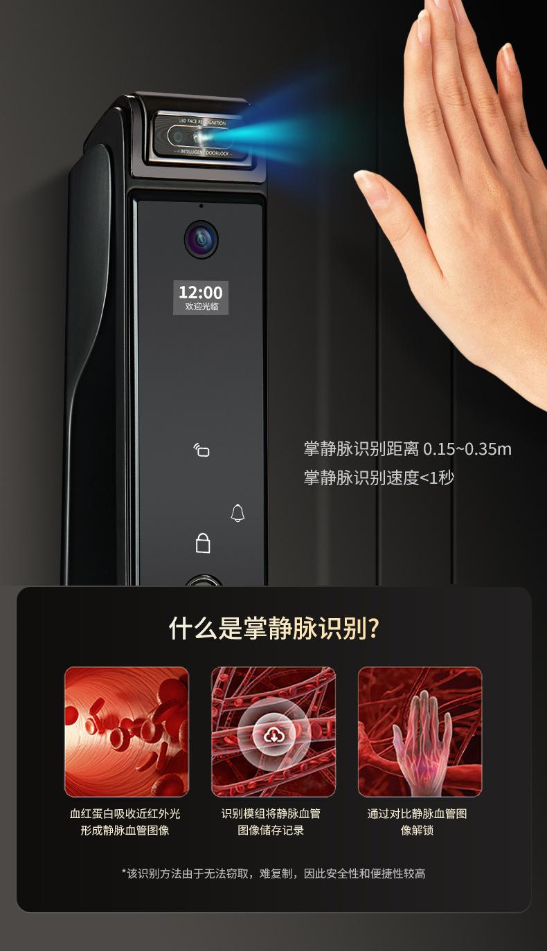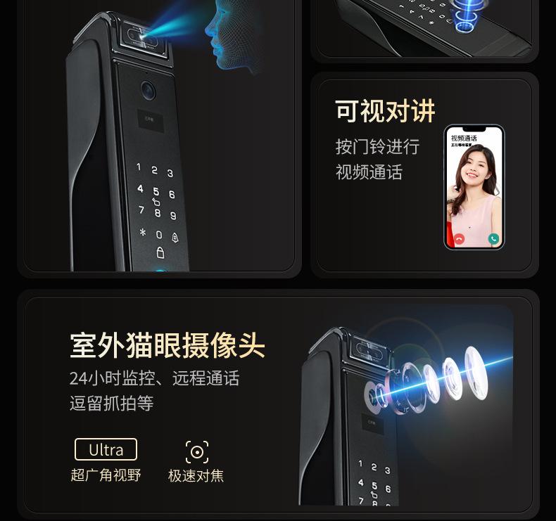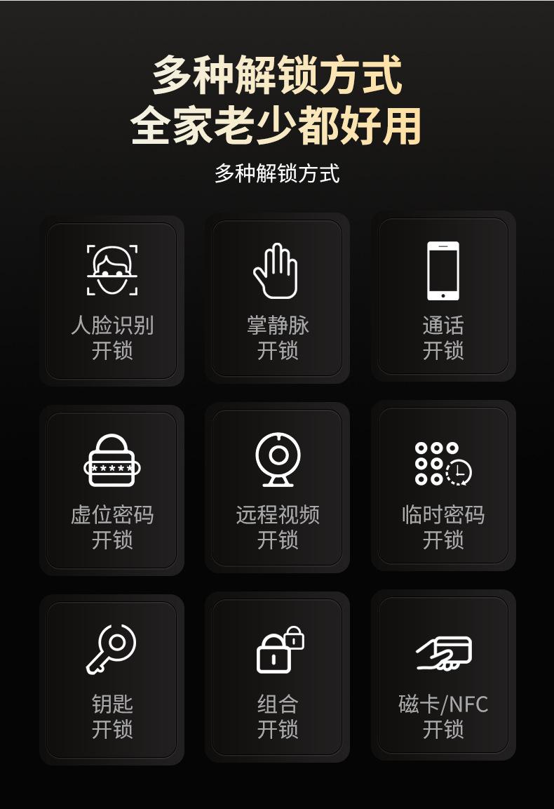 Fingerprint, Password, With key, Palm print, Visible cat eye, Face recognition, Remote unlocking