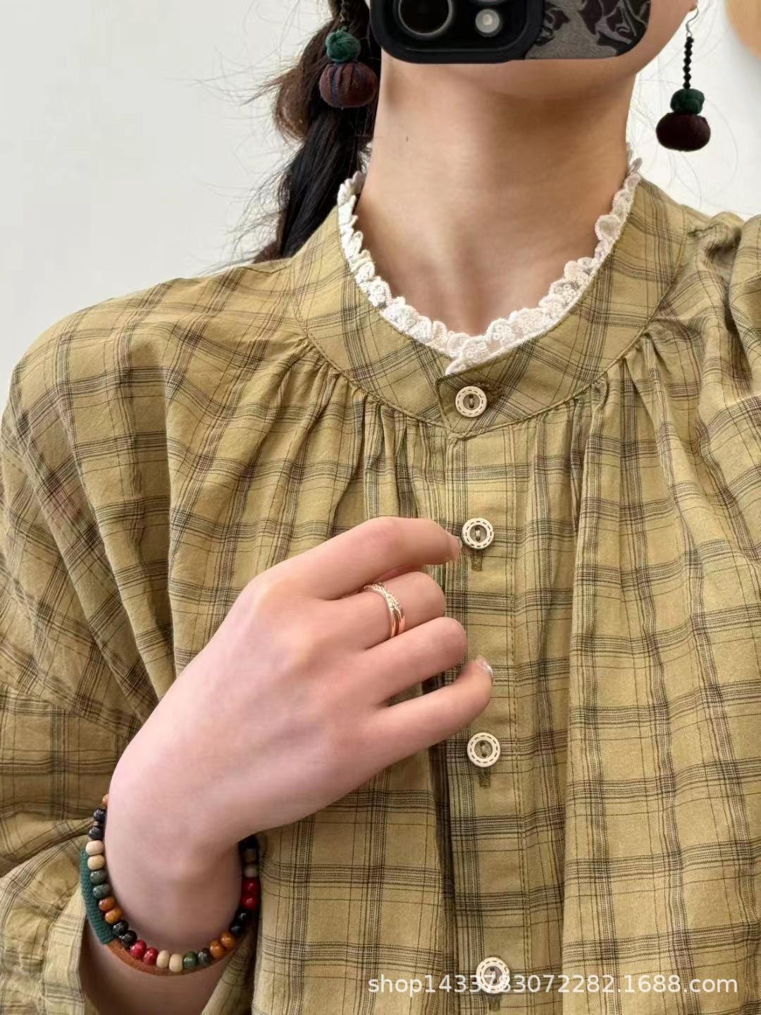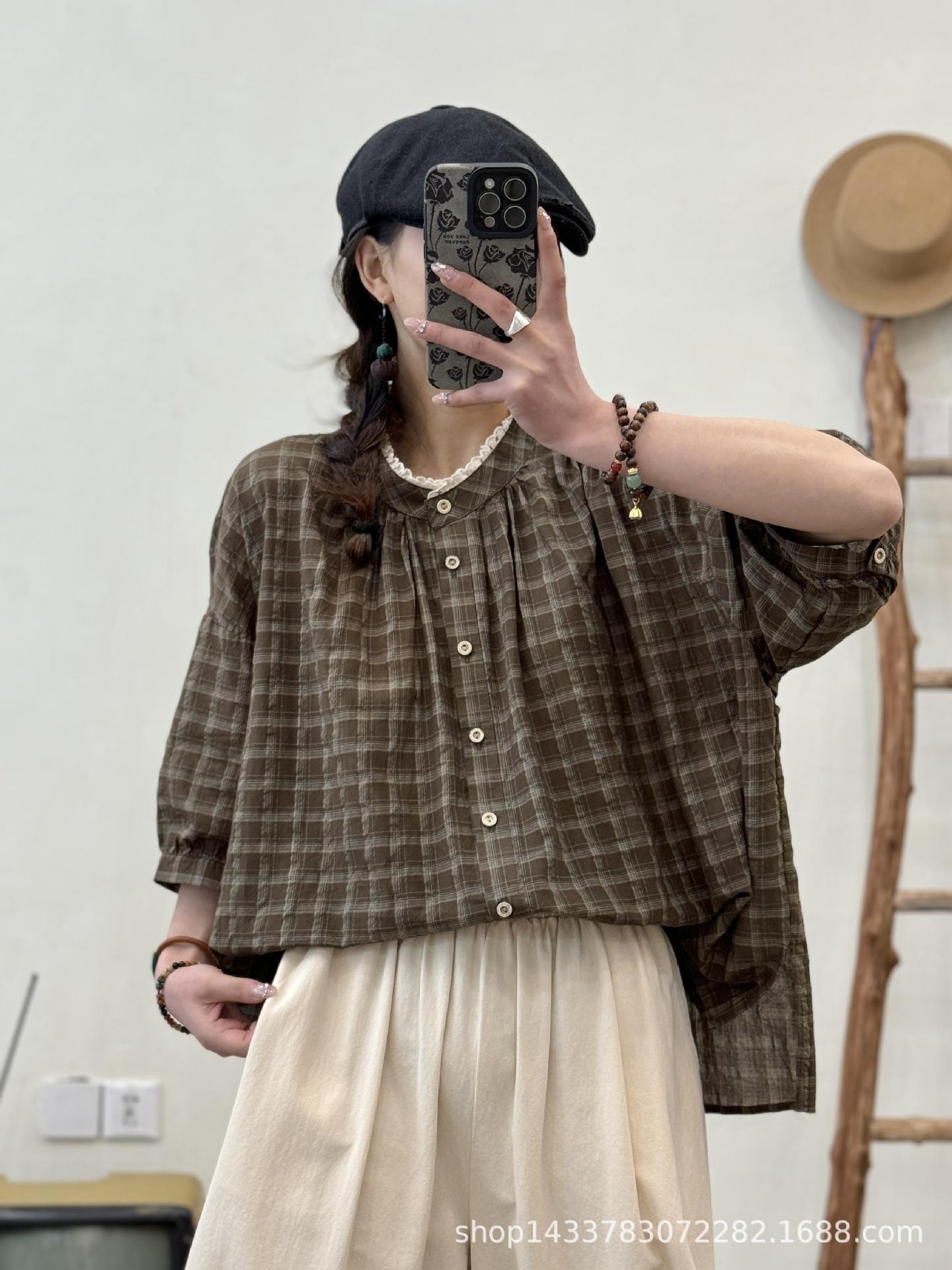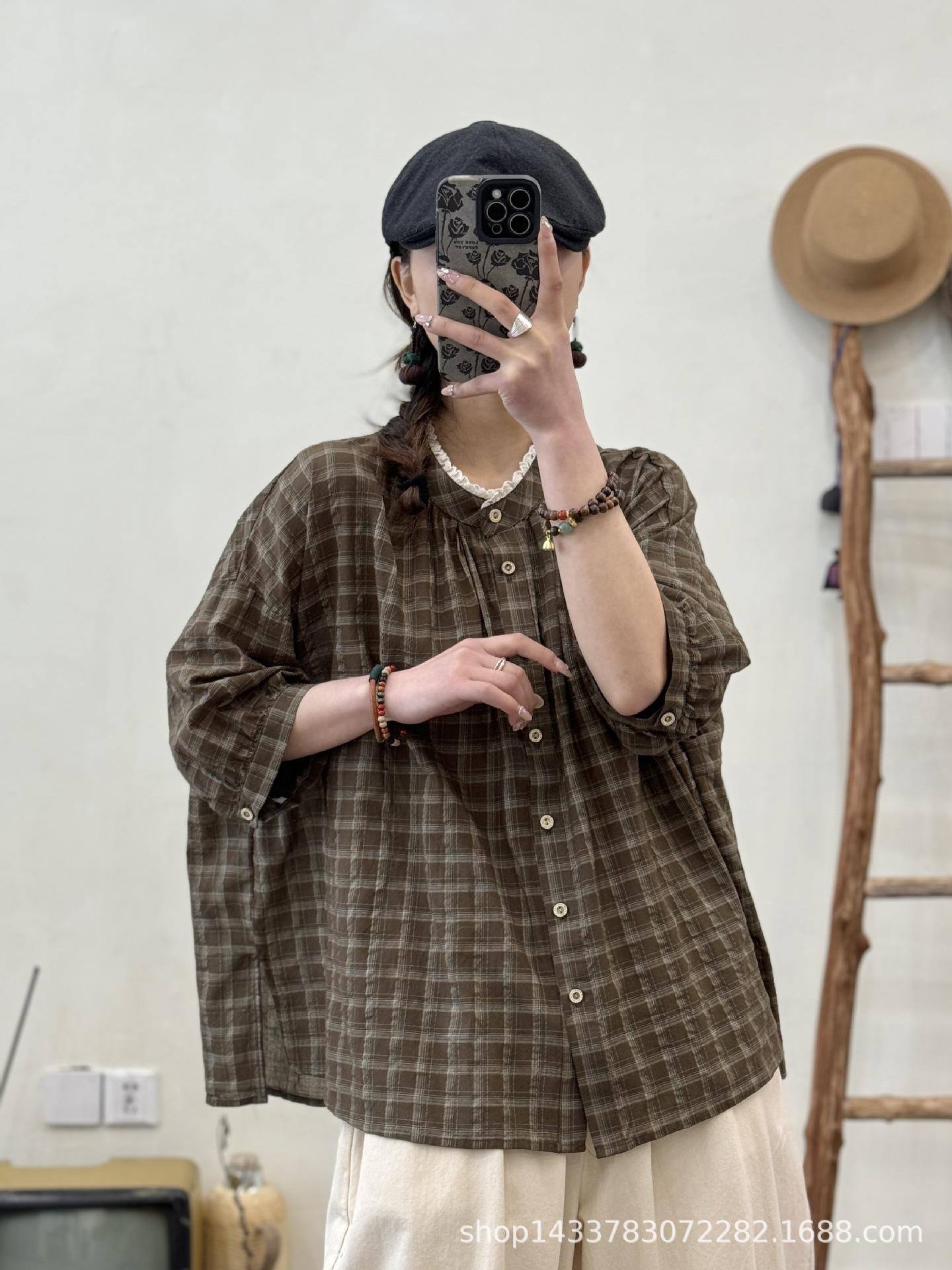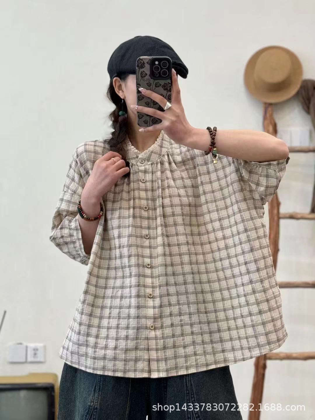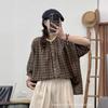 Camisa a cuadros elegante vintage de verano para mujer, corte entallado, cuello de encaje, botonadura sencilla, informal, antiedad, combinable con todo.
