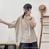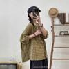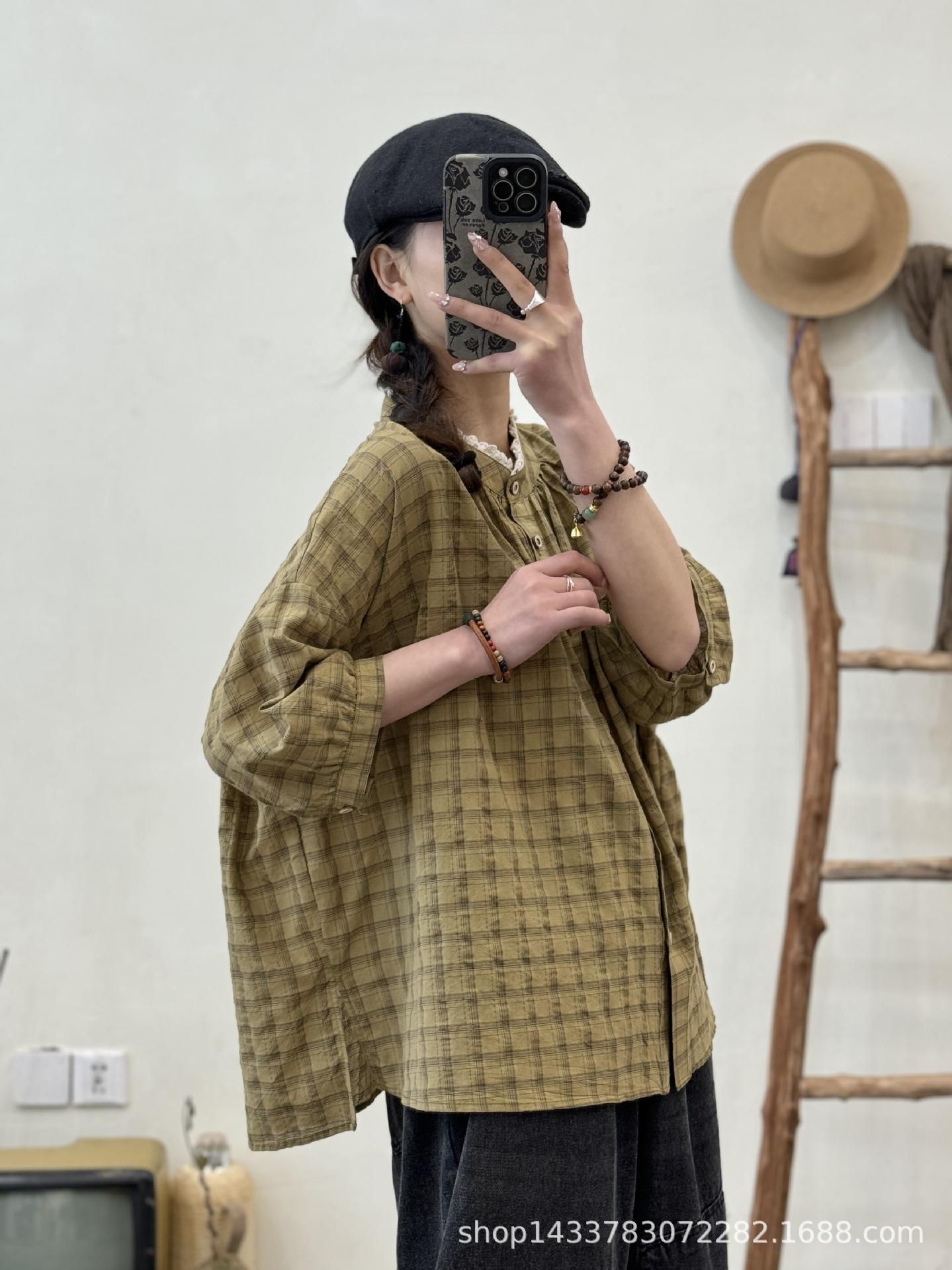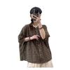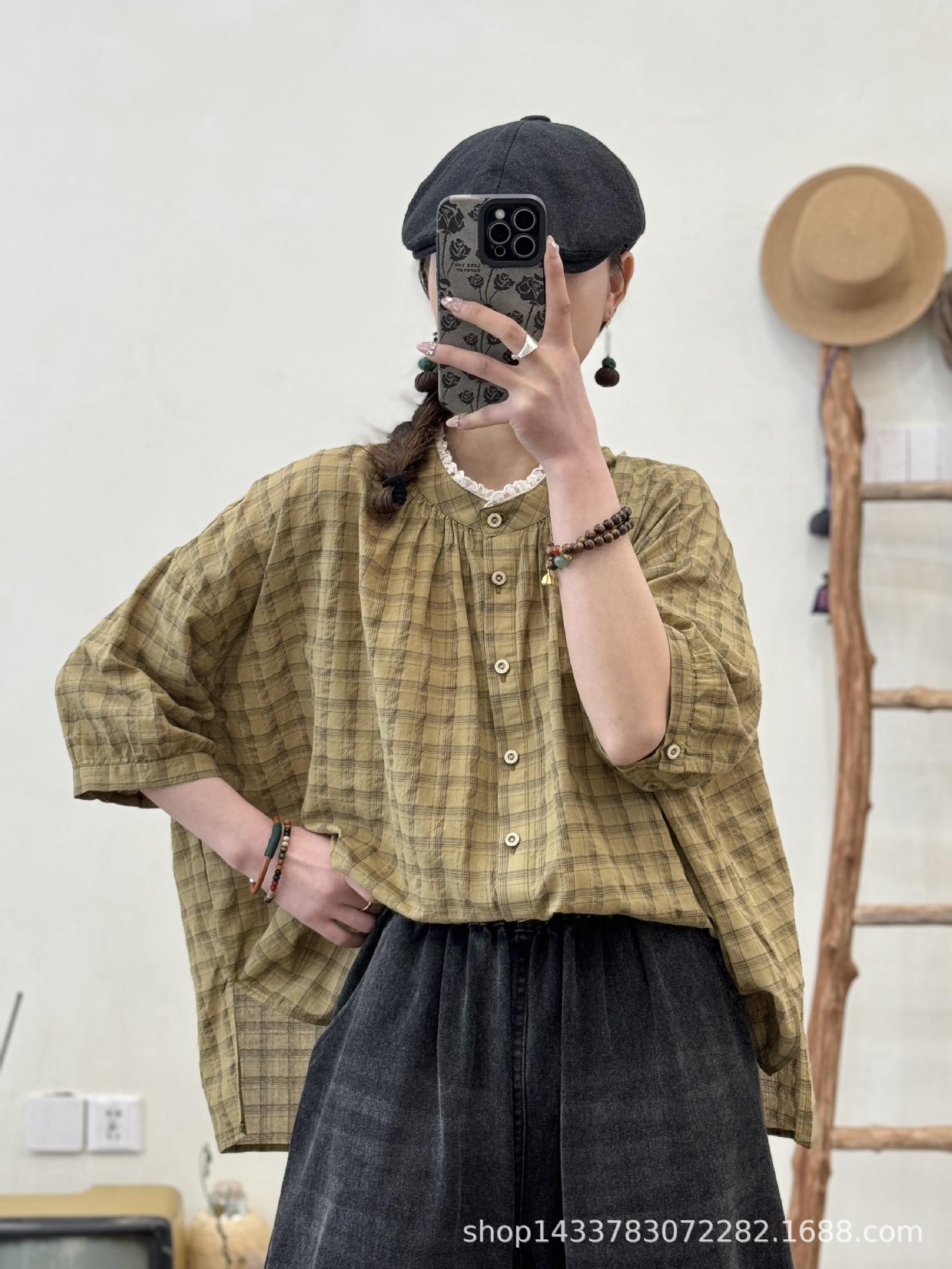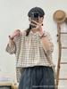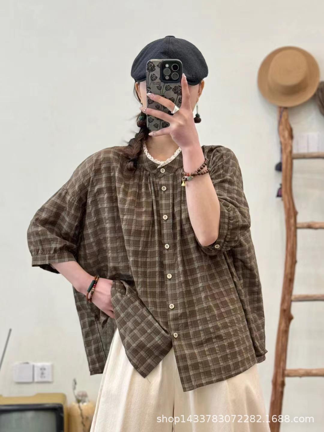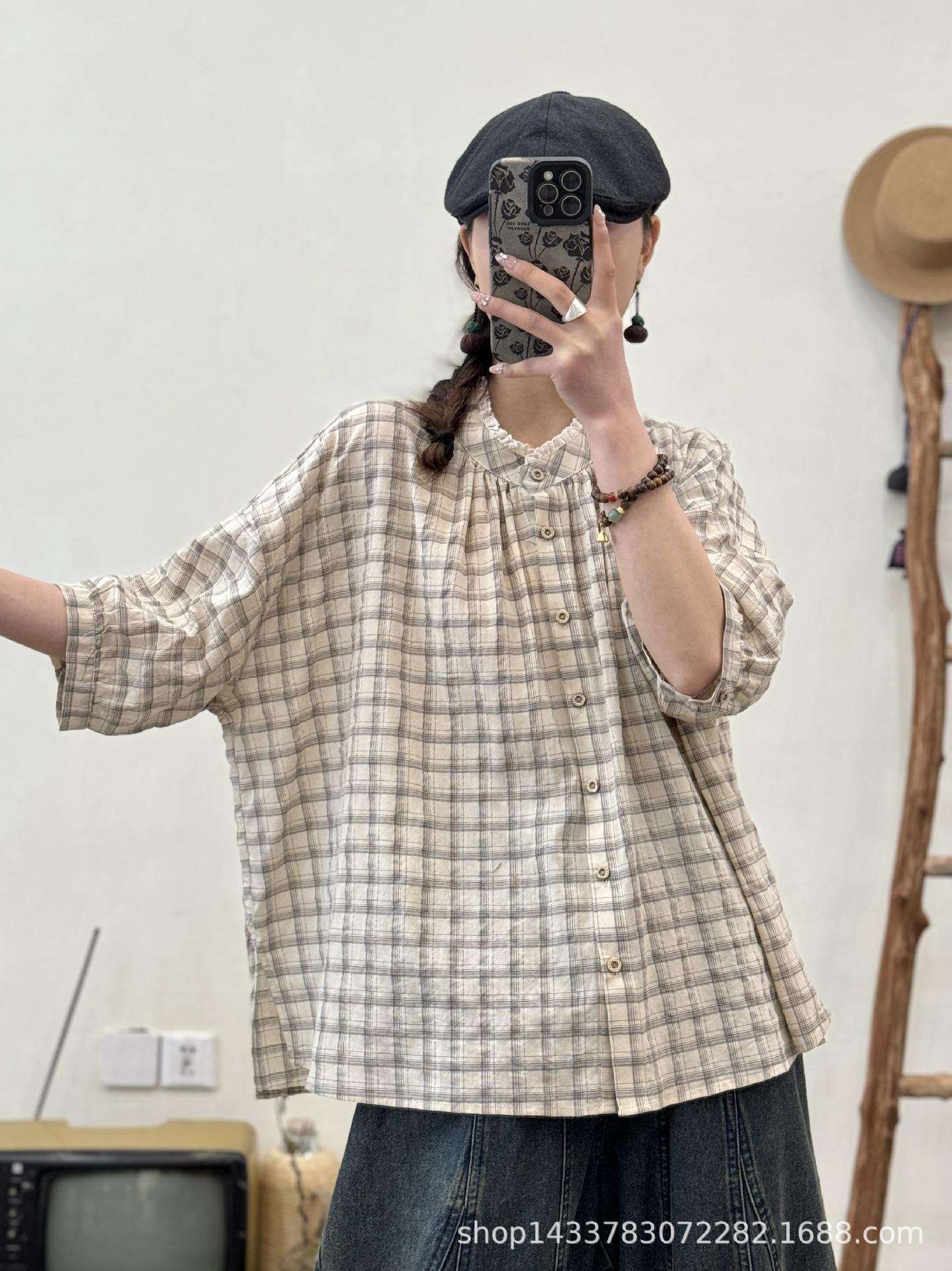 Camisa a cuadros elegante vintage de verano para mujer, corte entallado, cuello de encaje, botonadura sencilla, informal, antiedad, combinable con todo.