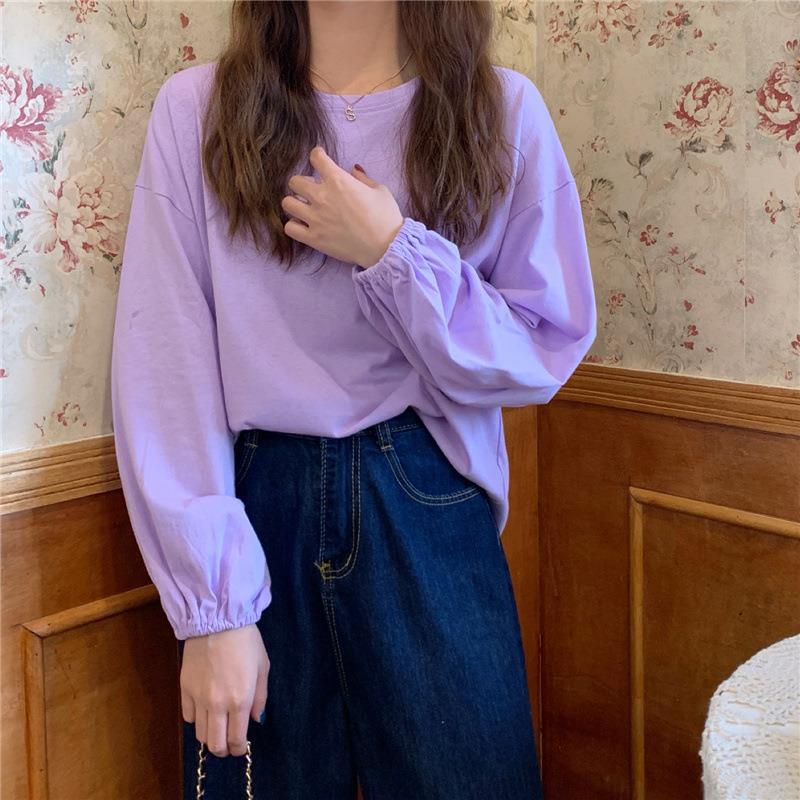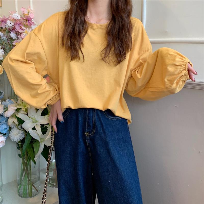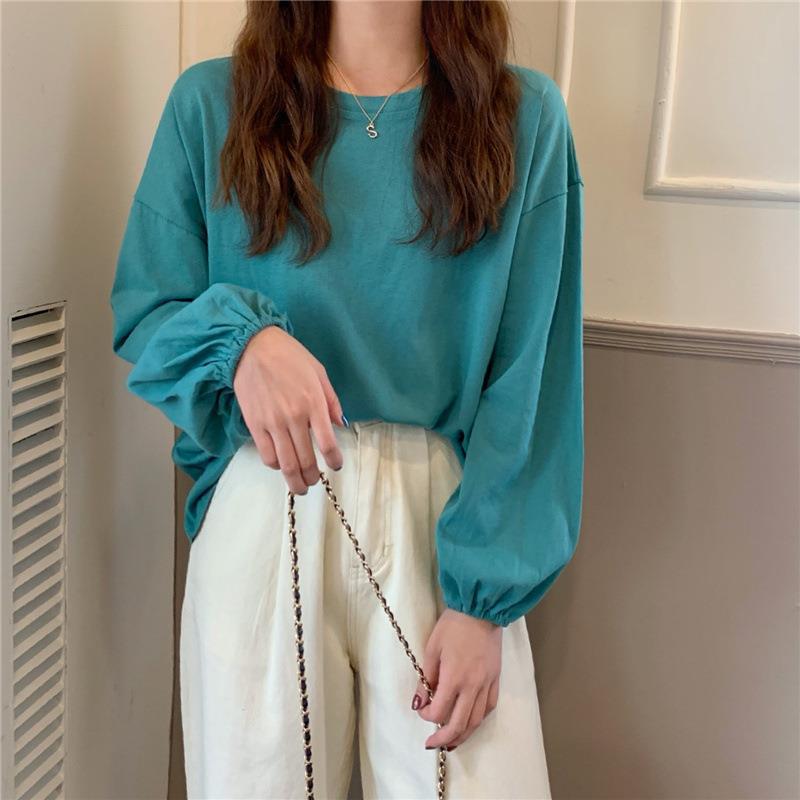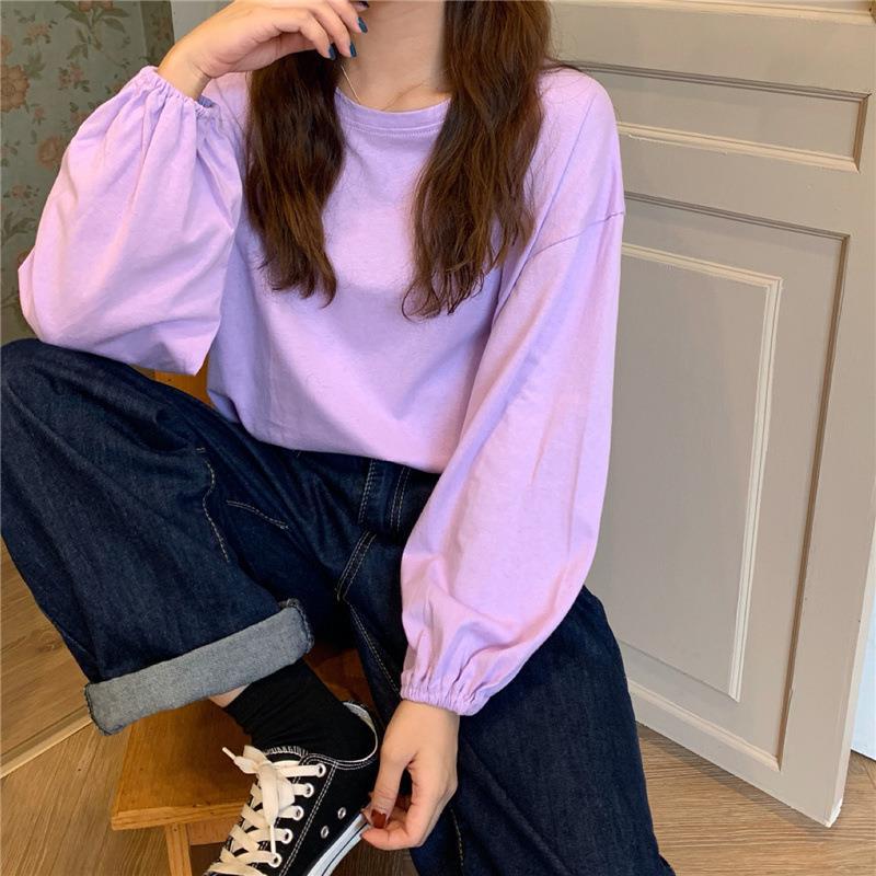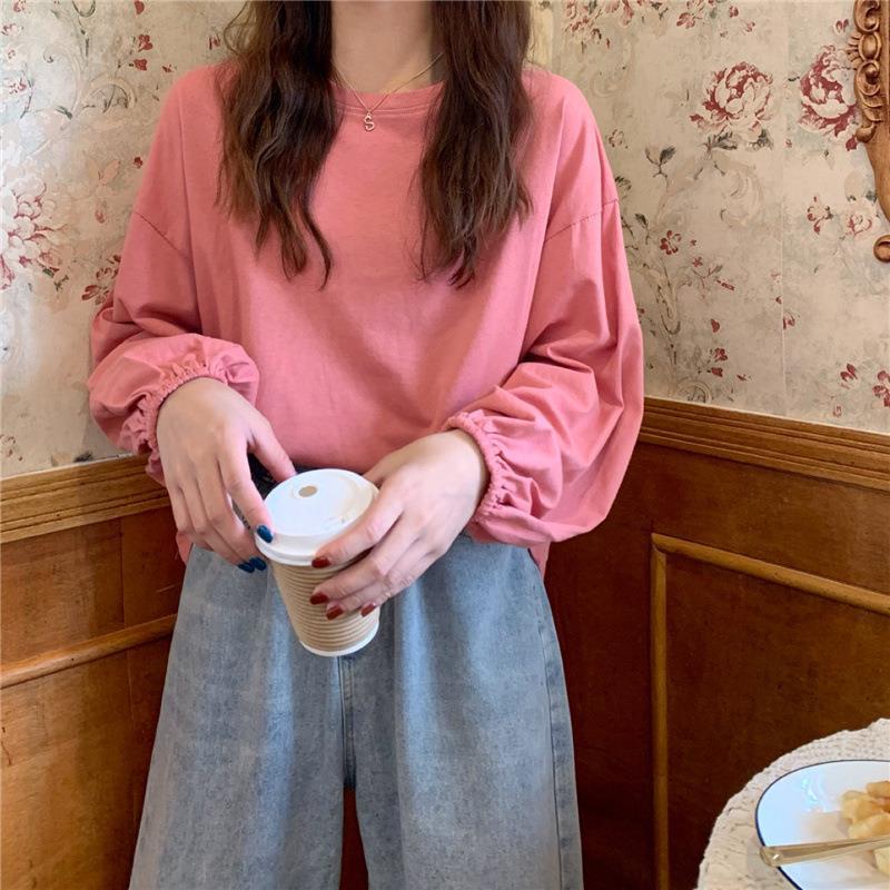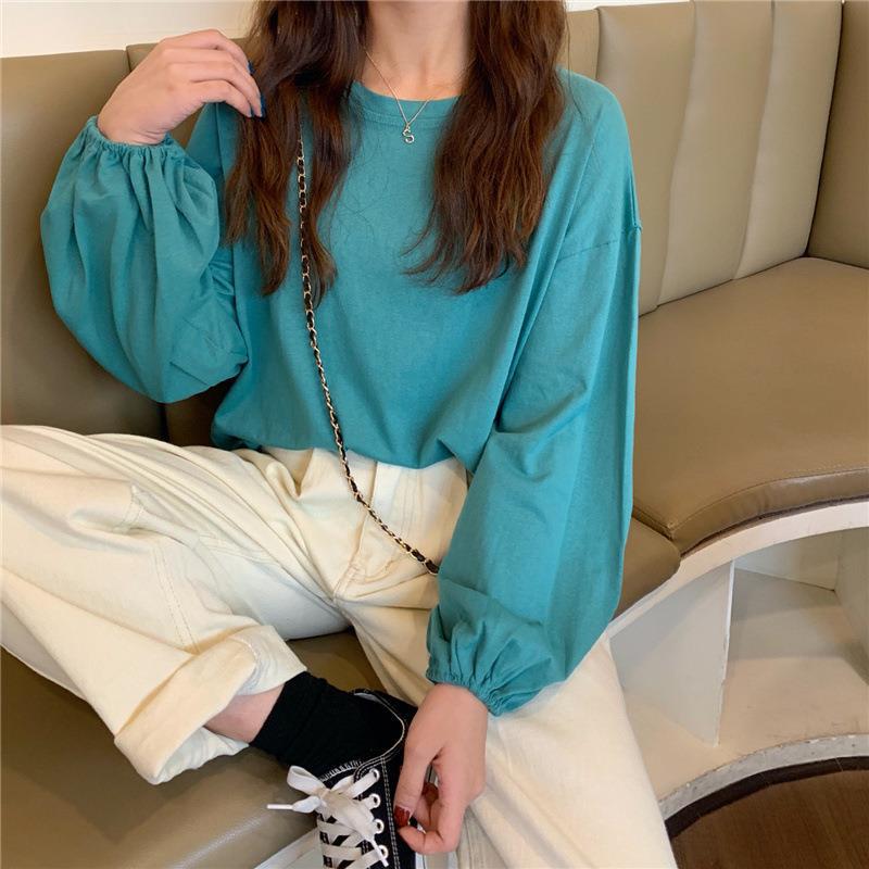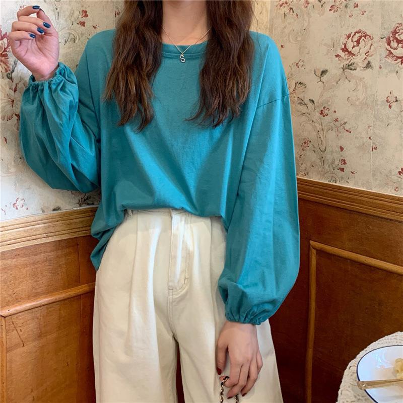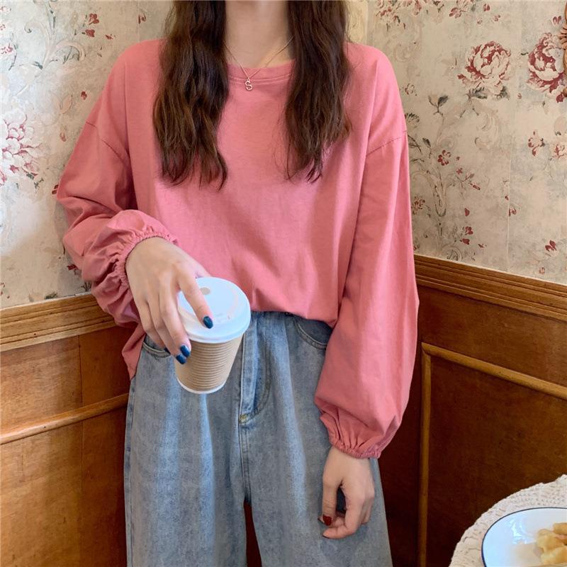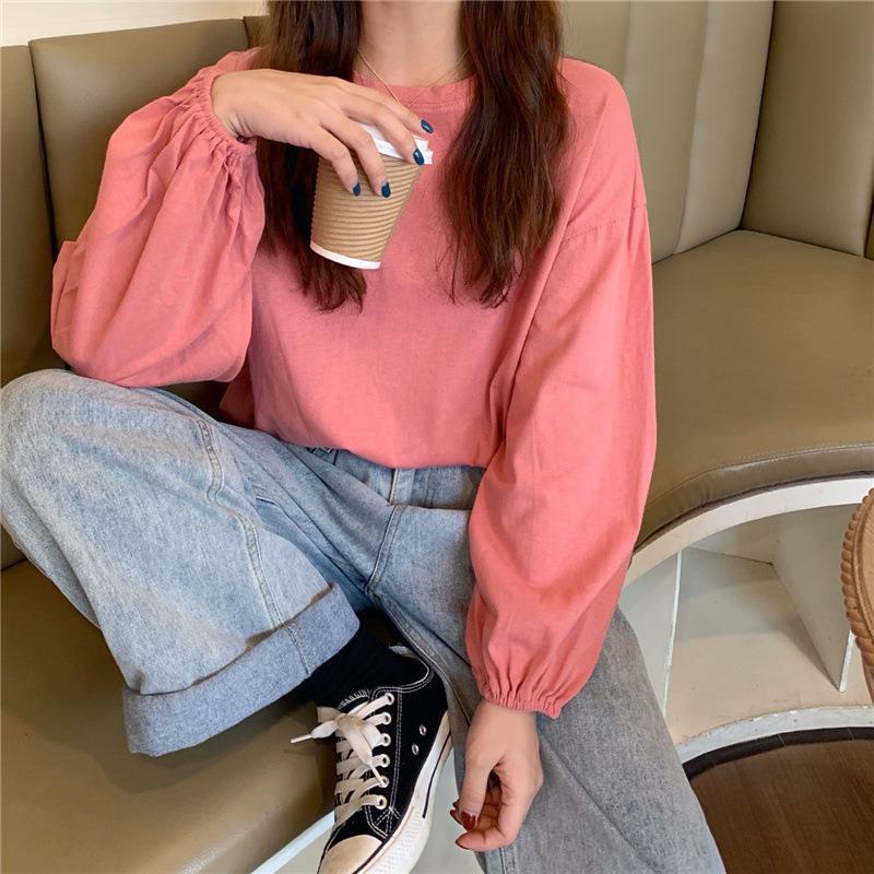 2025 Primavera Nueva Camiseta de Manga Larga para Mujer Básica Holgada Dulce Color Puro Manga Linterna Top Ins Camiseta para Fondo