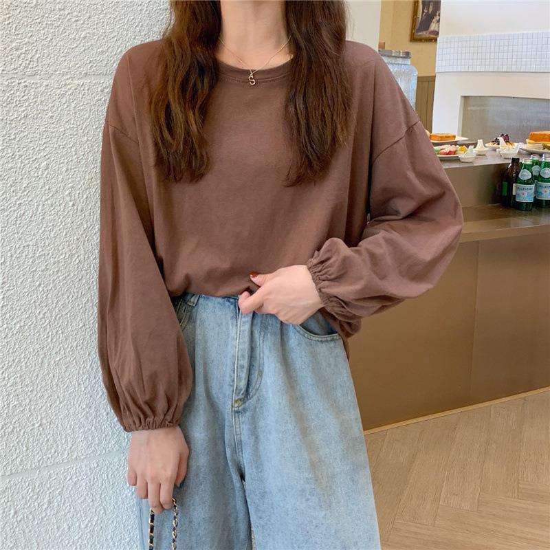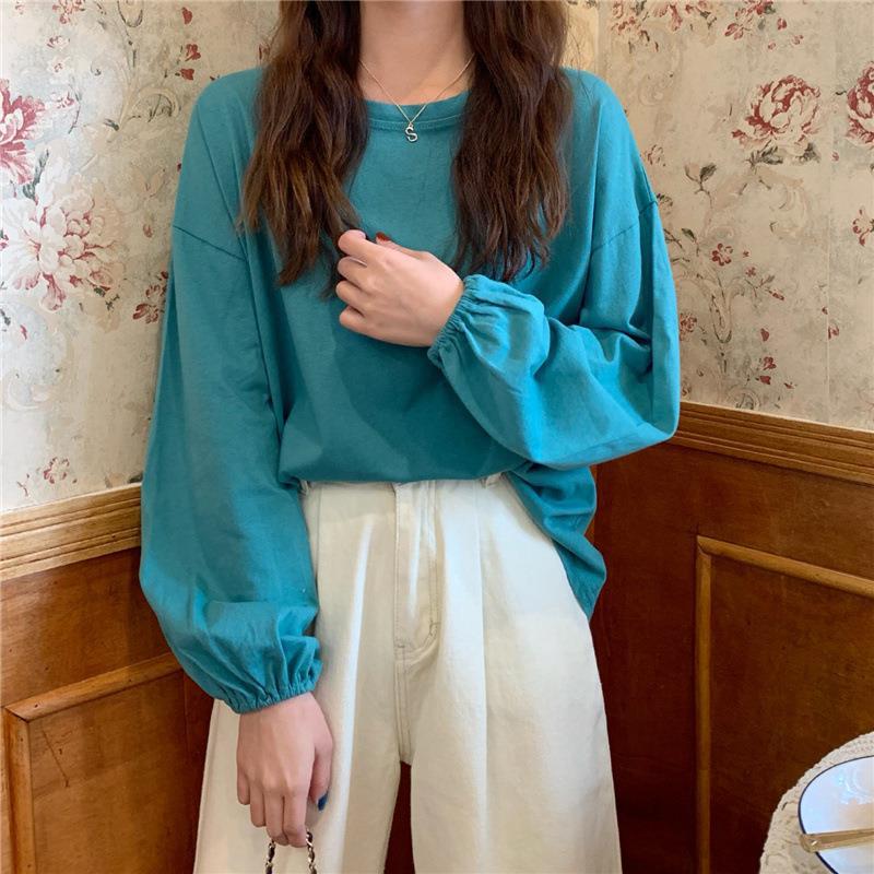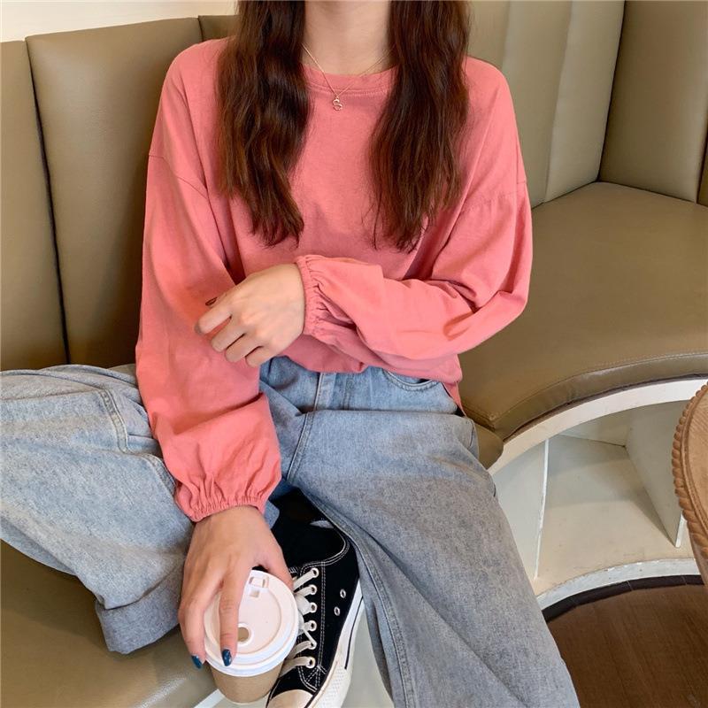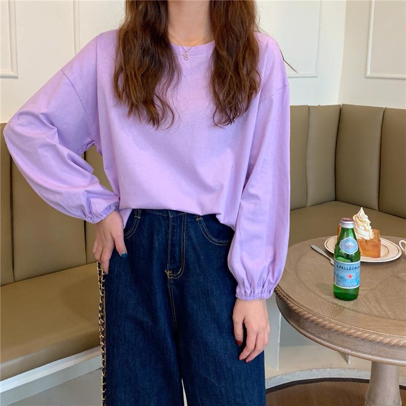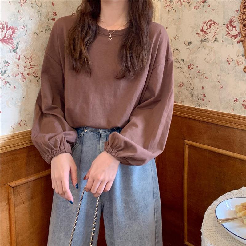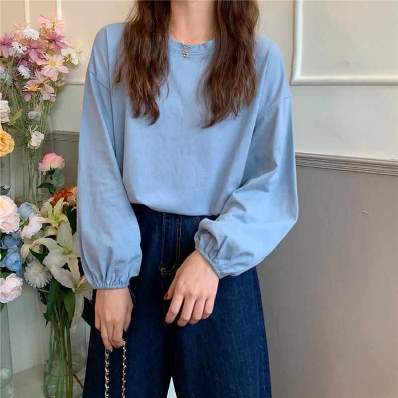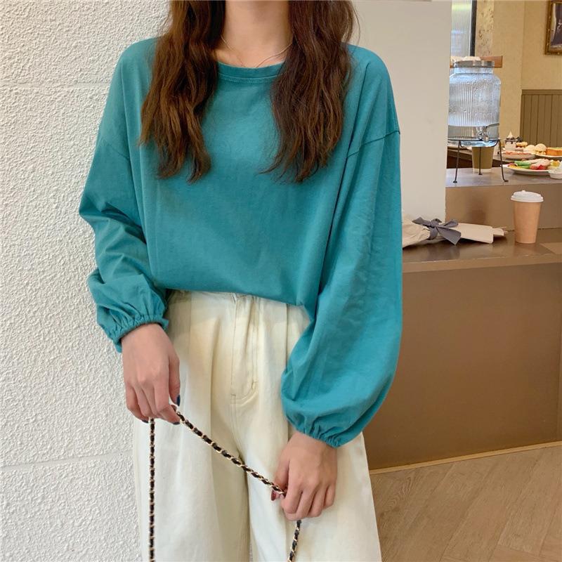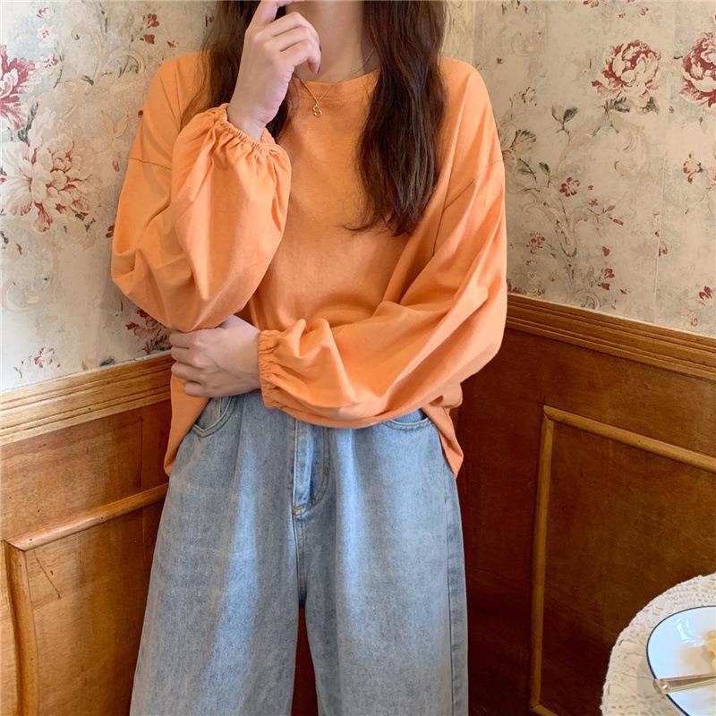2025 Primavera Nueva Camiseta de Manga Larga para Mujer Básica Holgada Dulce Color Puro Manga Linterna Top Ins Camiseta para Fondo