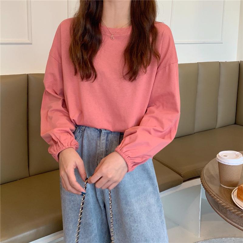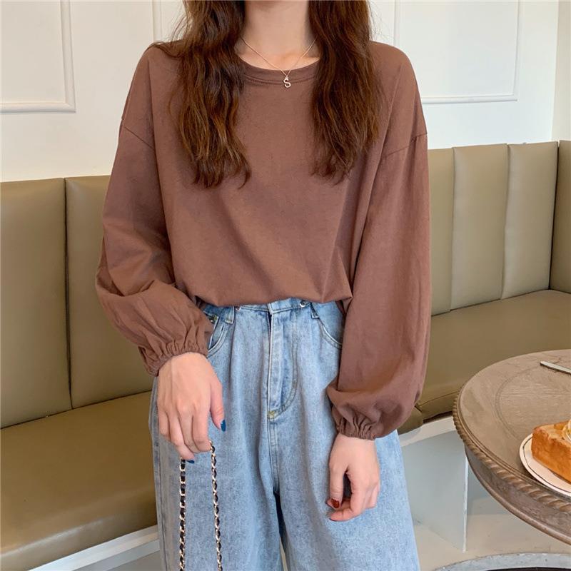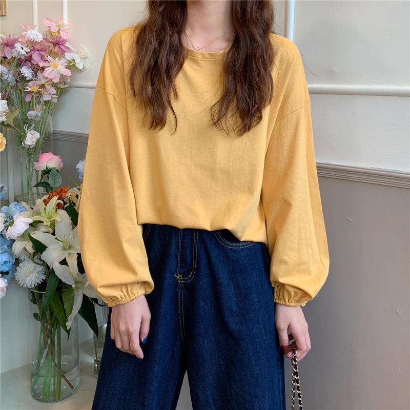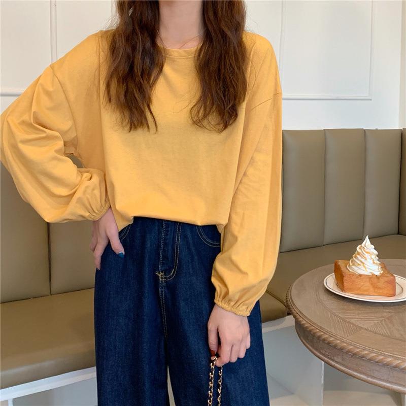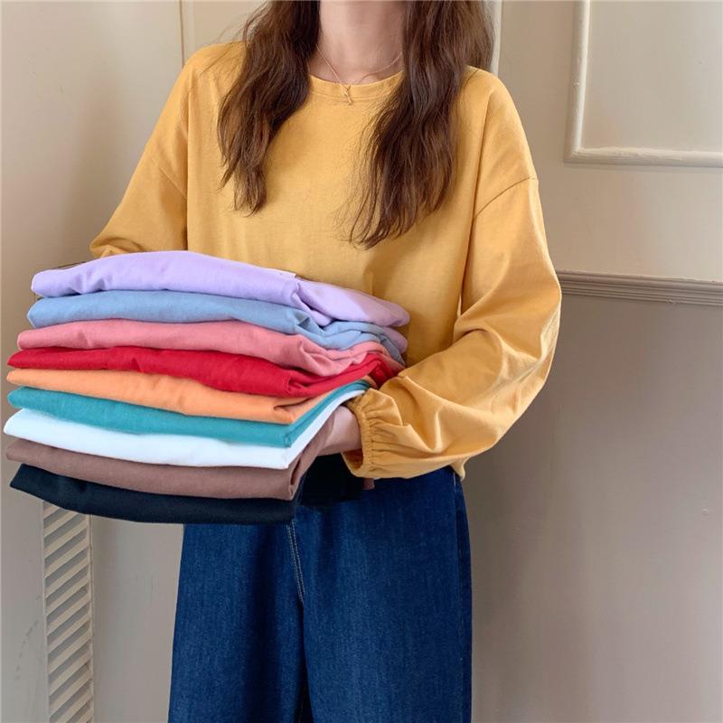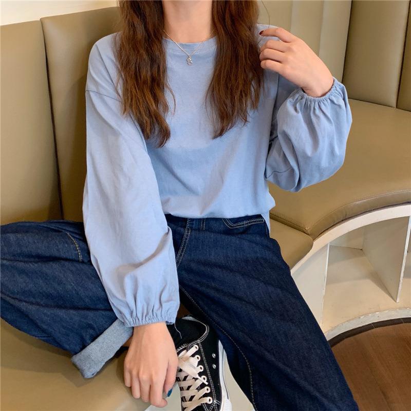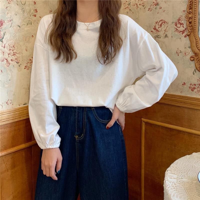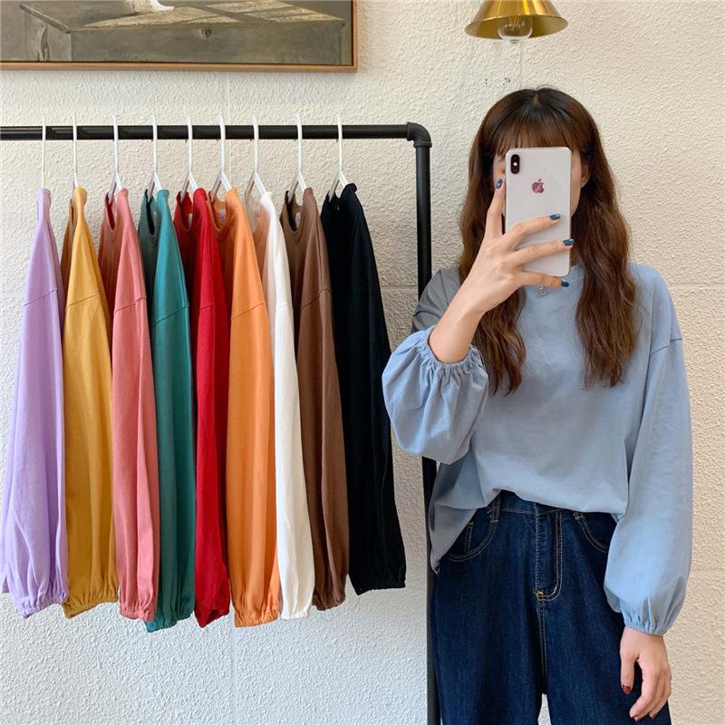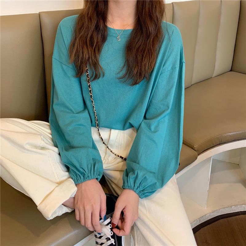 2025 Primavera Nueva Camiseta de Manga Larga para Mujer Básica Holgada Dulce Color Puro Manga Linterna Top Ins Camiseta para Fondo