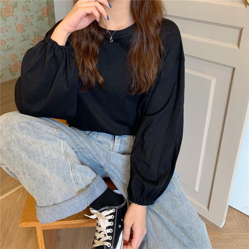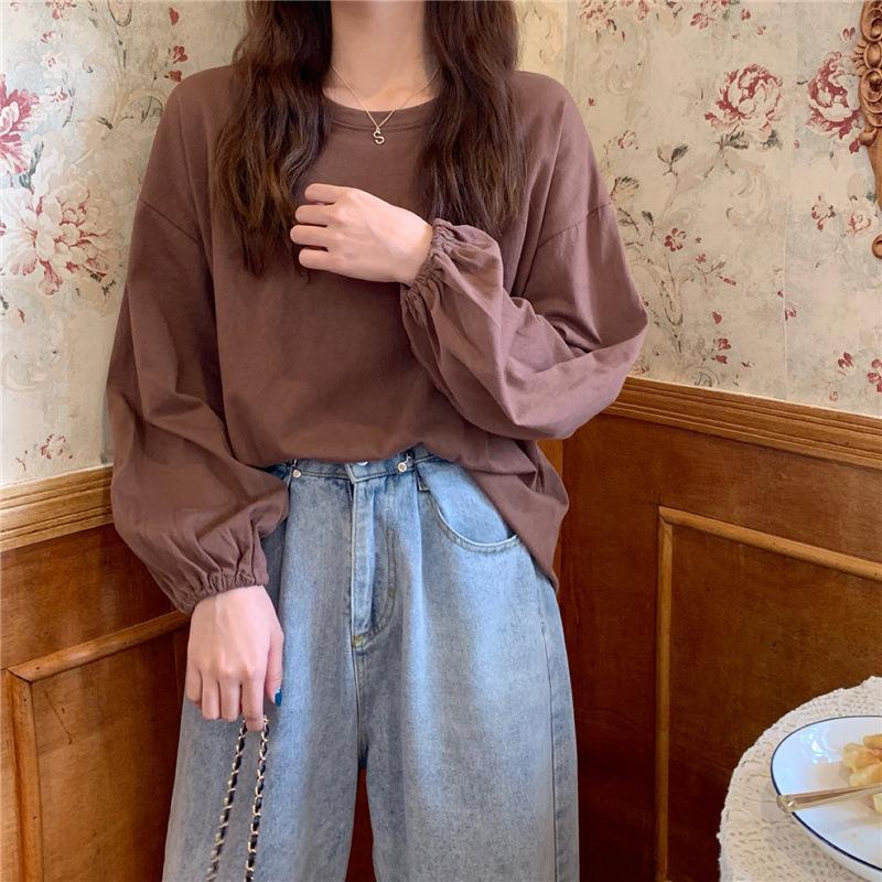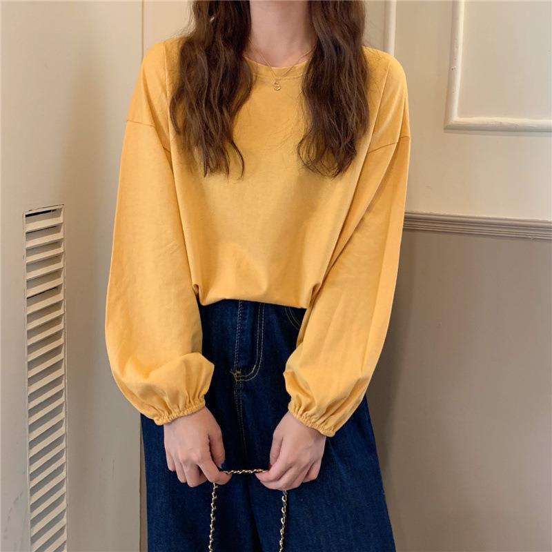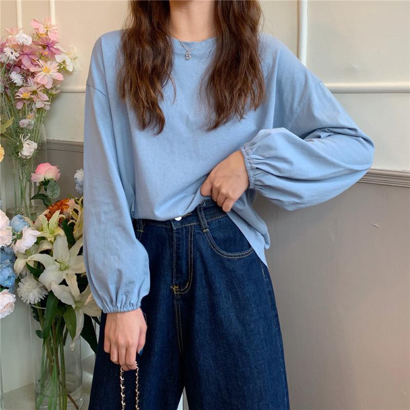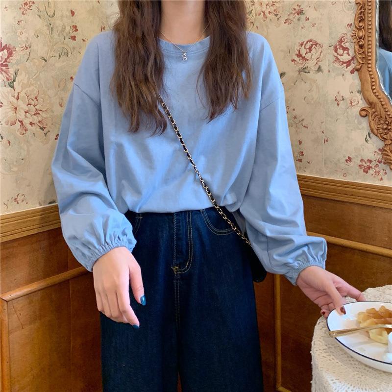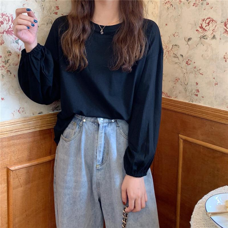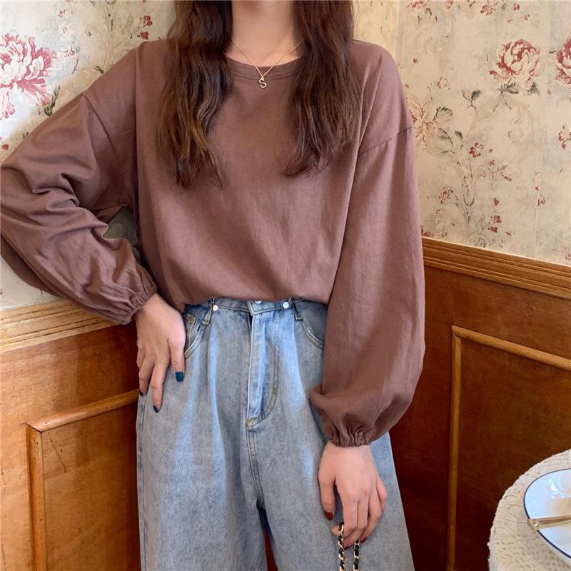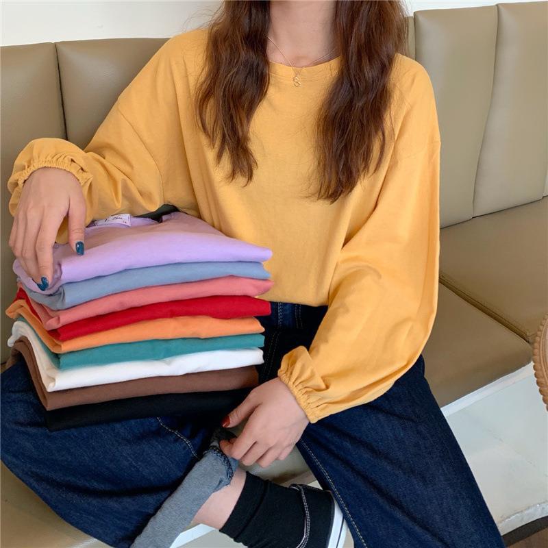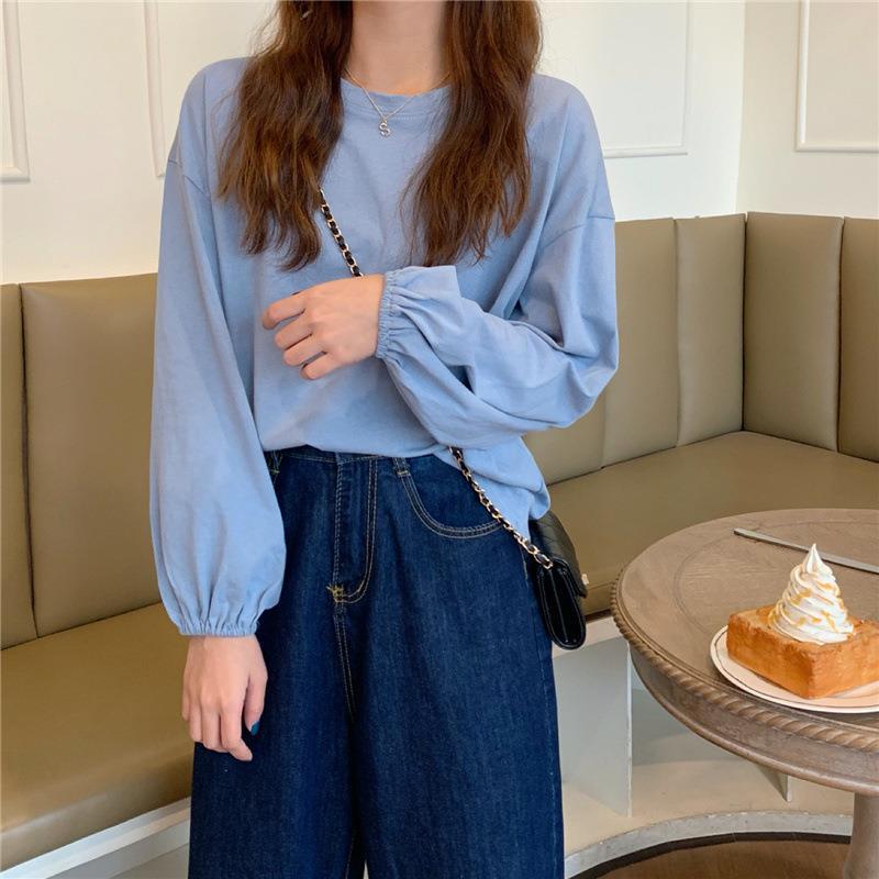 2025 Primavera Nueva Camiseta de Manga Larga para Mujer Básica Holgada Dulce Color Puro Manga Linterna Top Ins Camiseta para Fondo