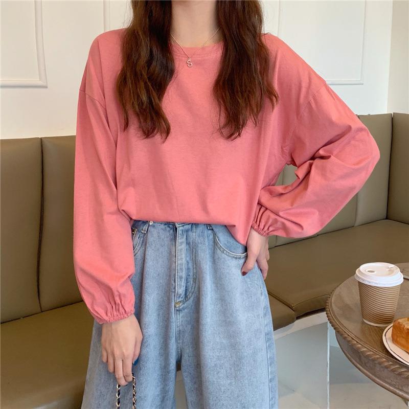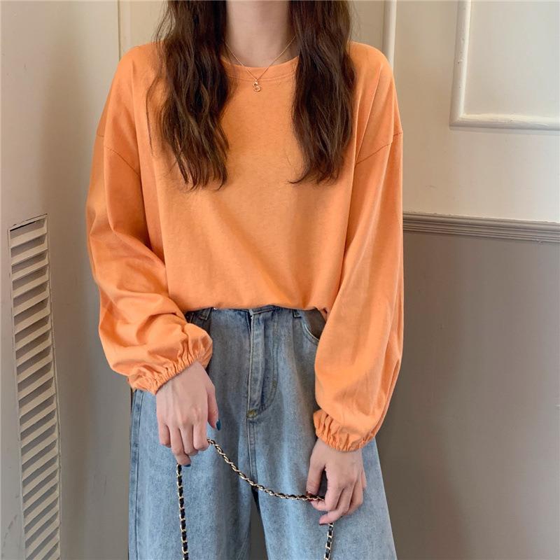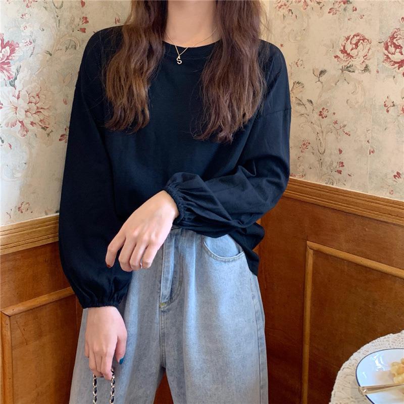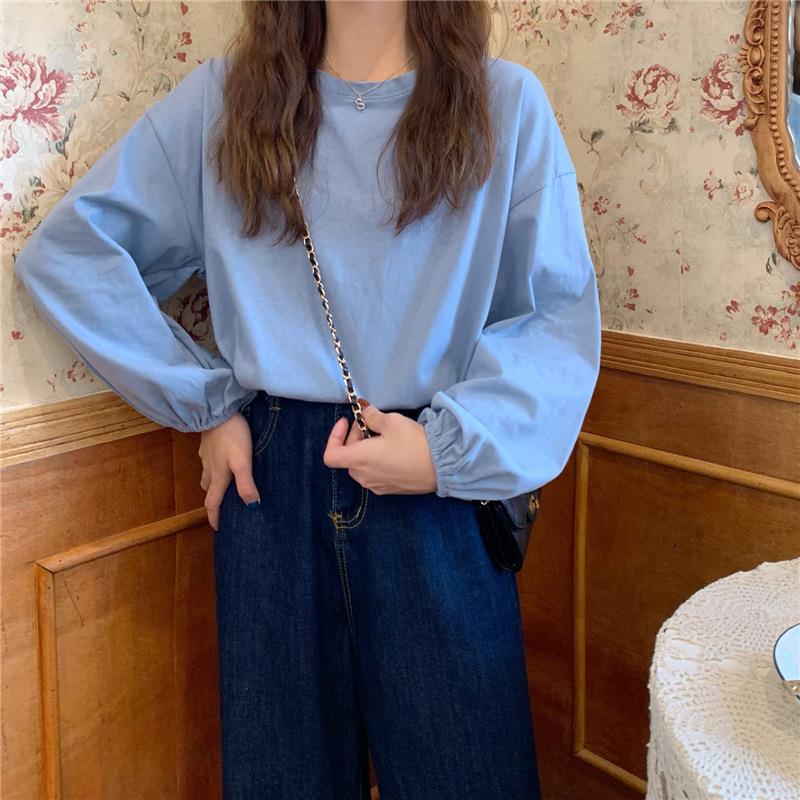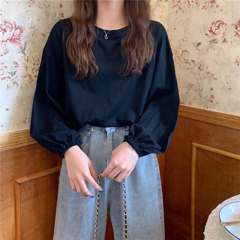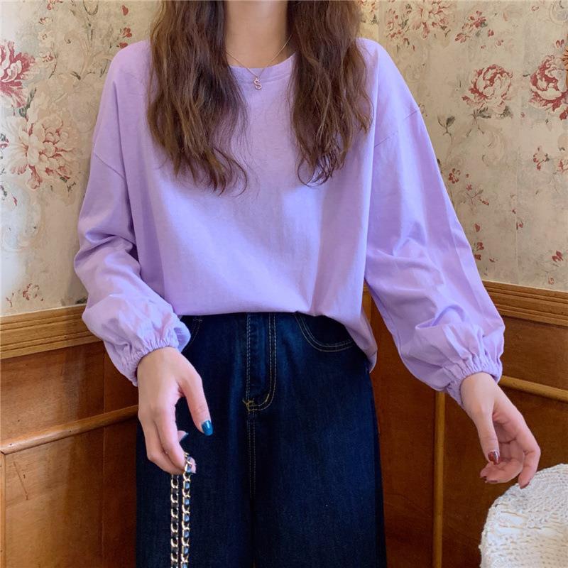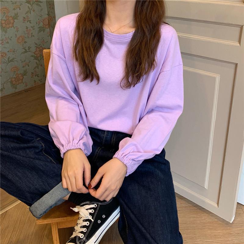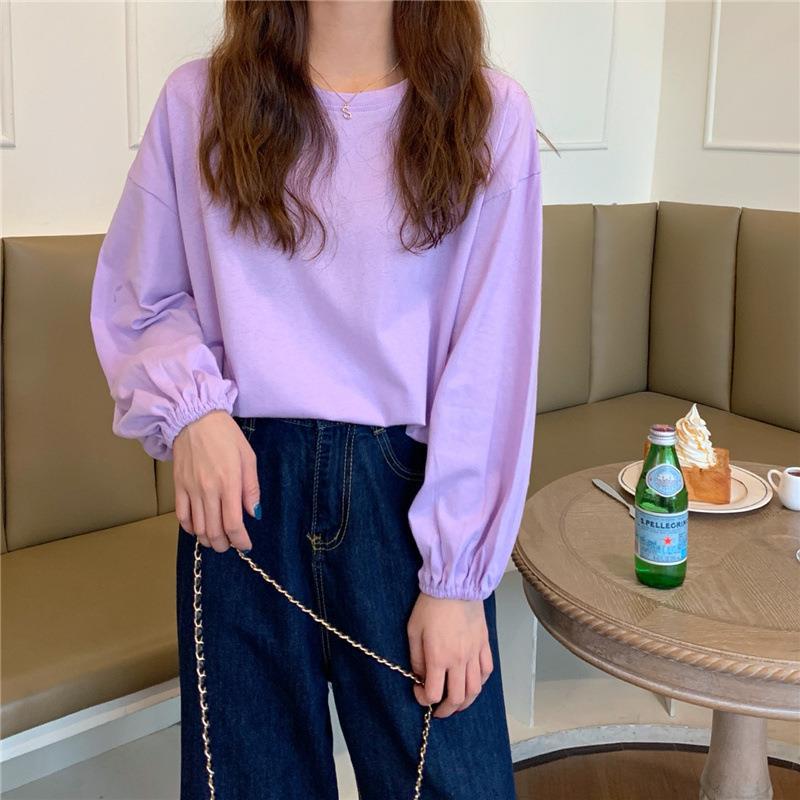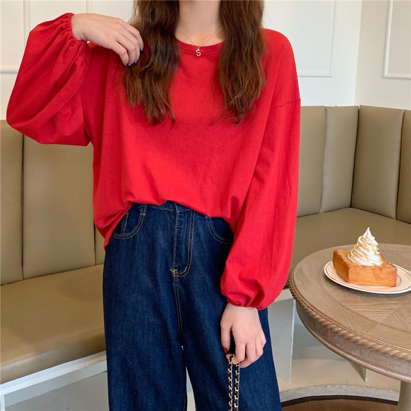 2025 Primavera Nueva Camiseta de Manga Larga para Mujer Básica Holgada Dulce Color Puro Manga Linterna Top Ins Camiseta para Fondo
