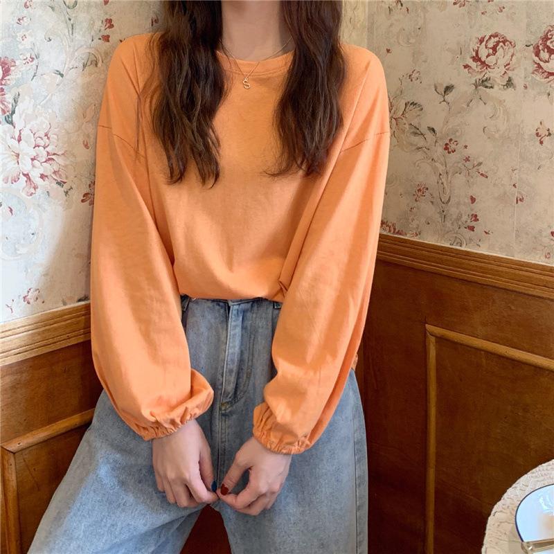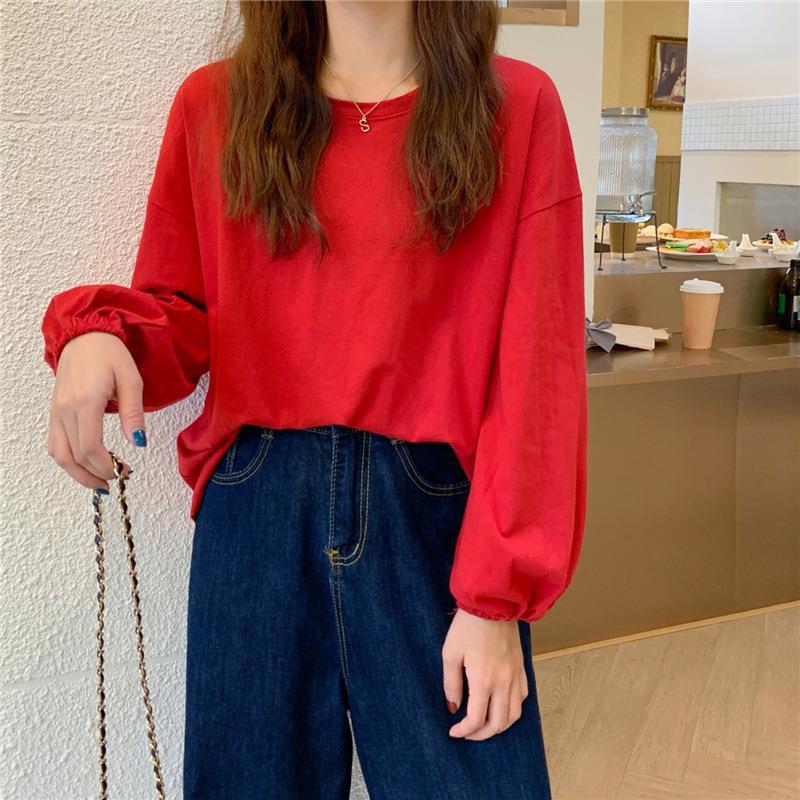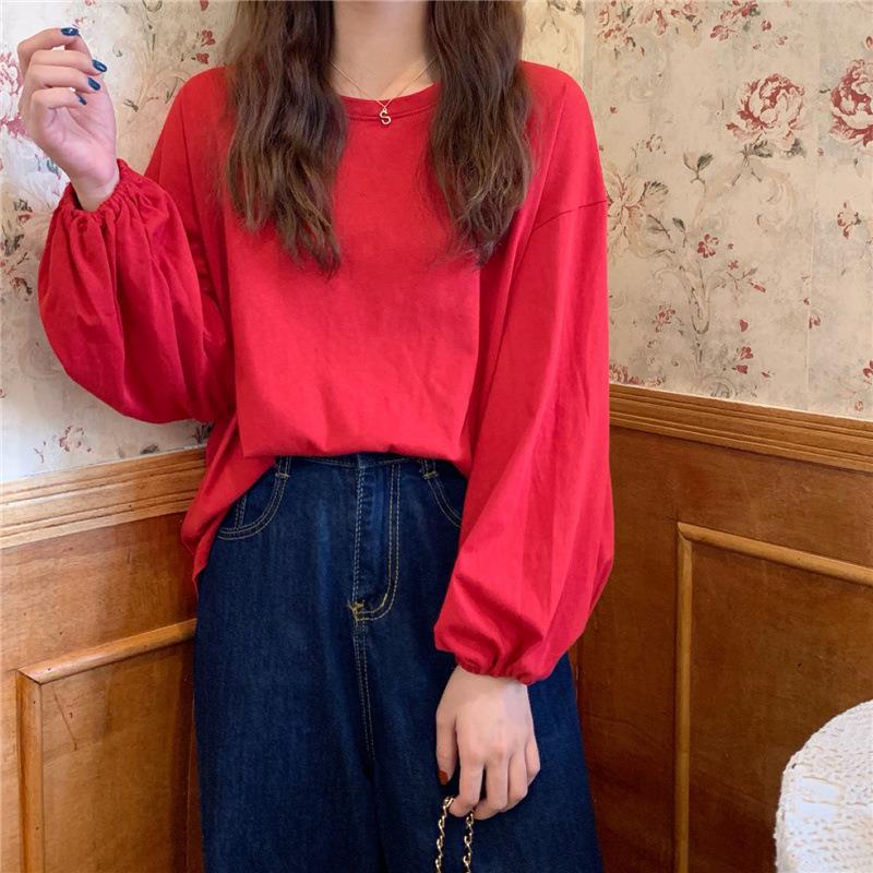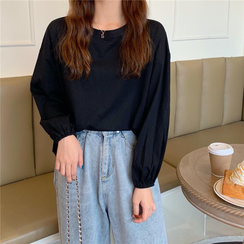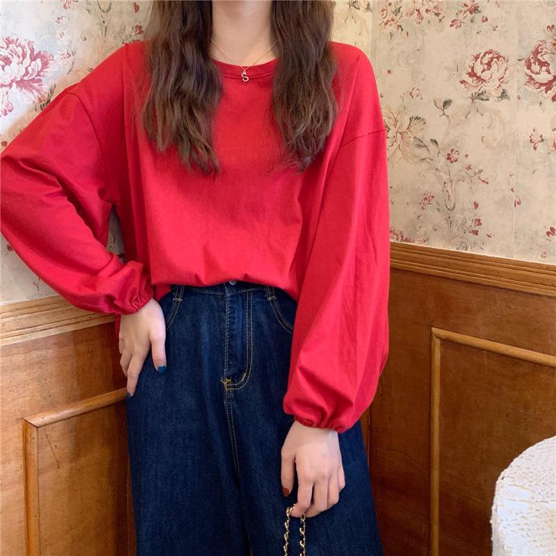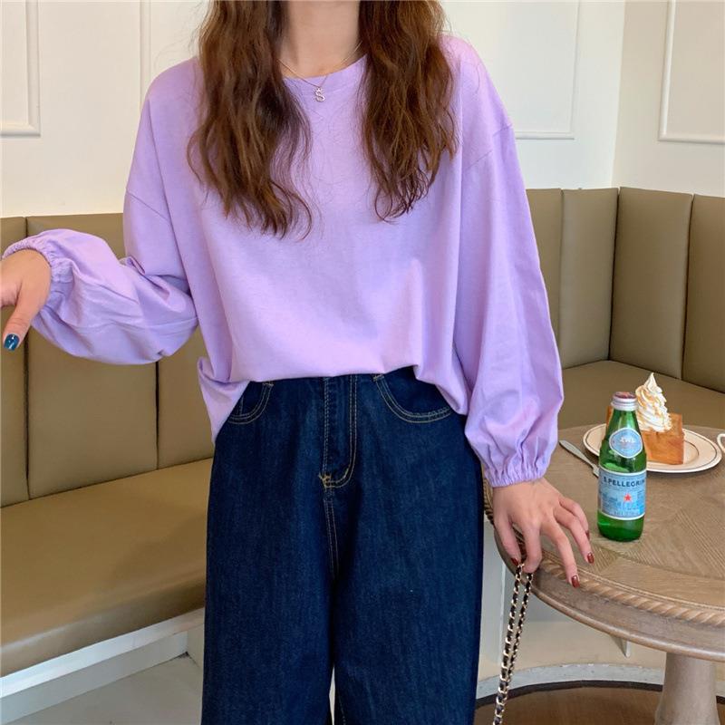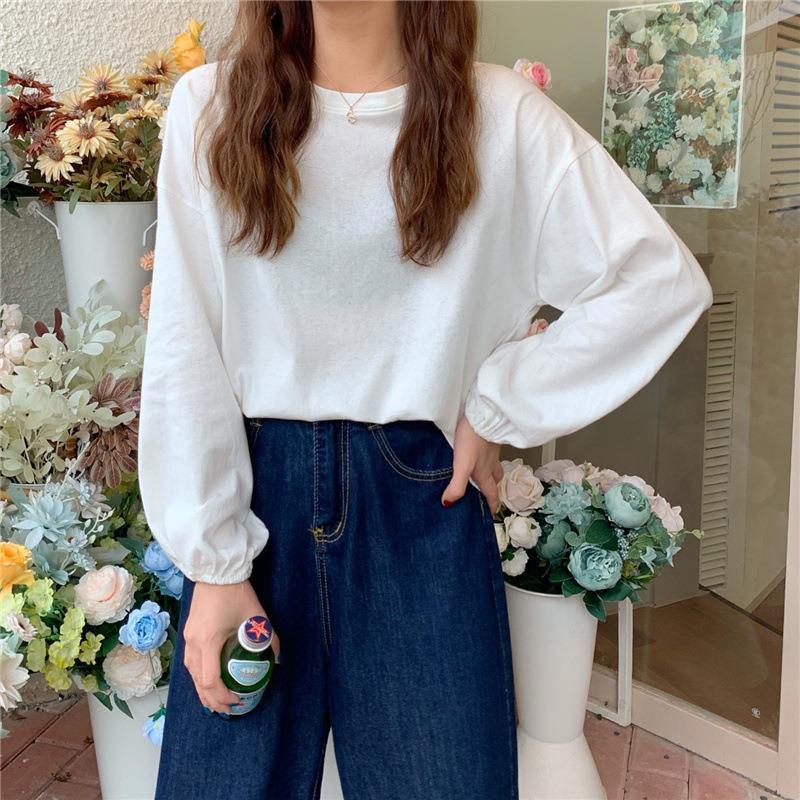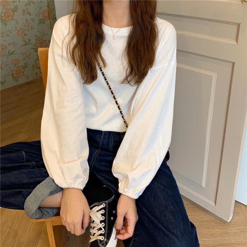 2025 Primavera Nueva Camiseta de Manga Larga para Mujer Básica Holgada Dulce Color Puro Manga Linterna Top Ins Camiseta para Fondo