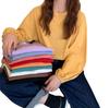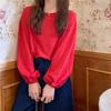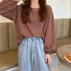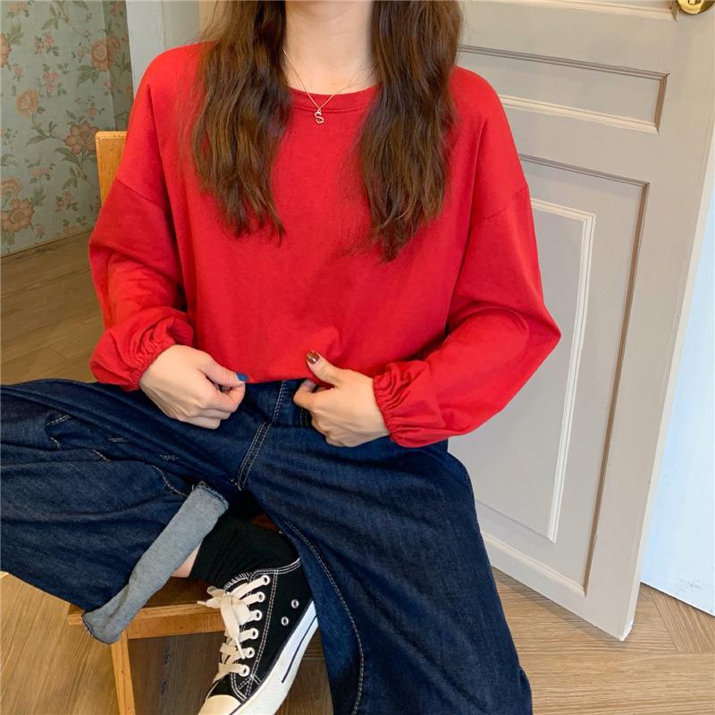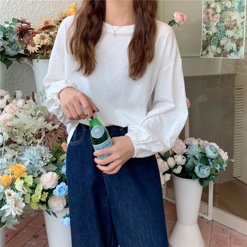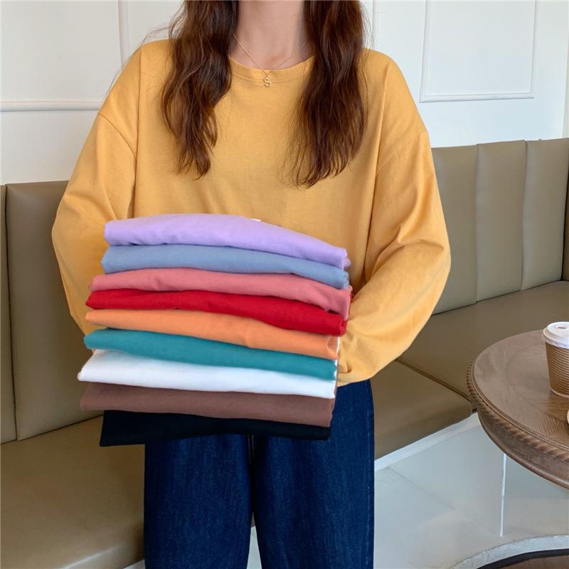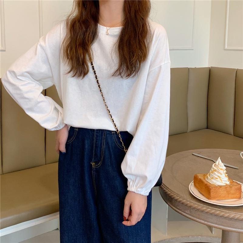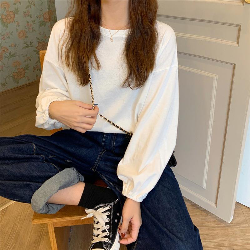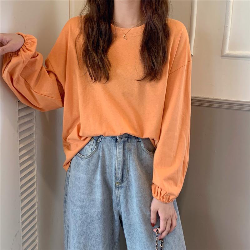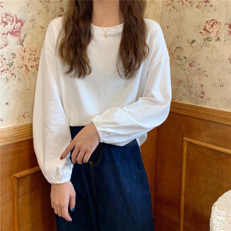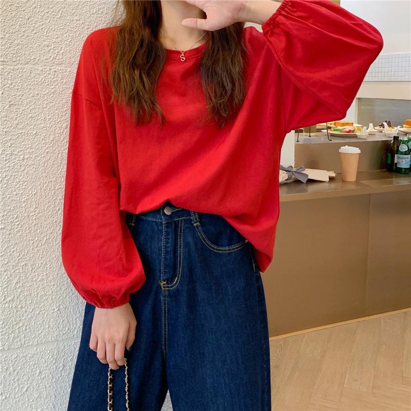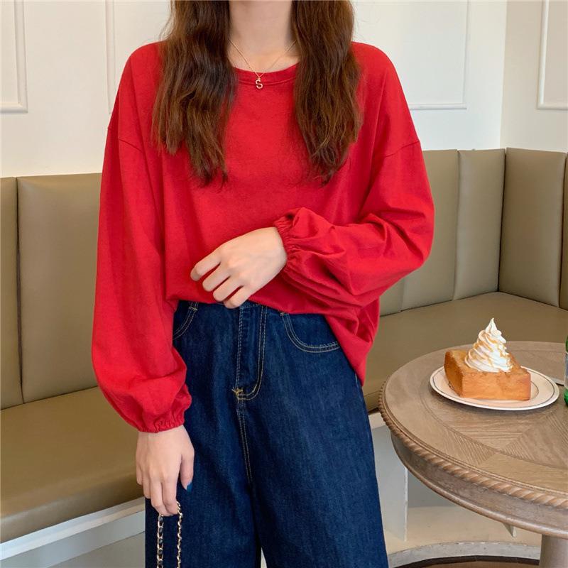 2025 Primavera Nueva Camiseta de Manga Larga para Mujer Básica Holgada Dulce Color Puro Manga Linterna Top Ins Camiseta para Fondo