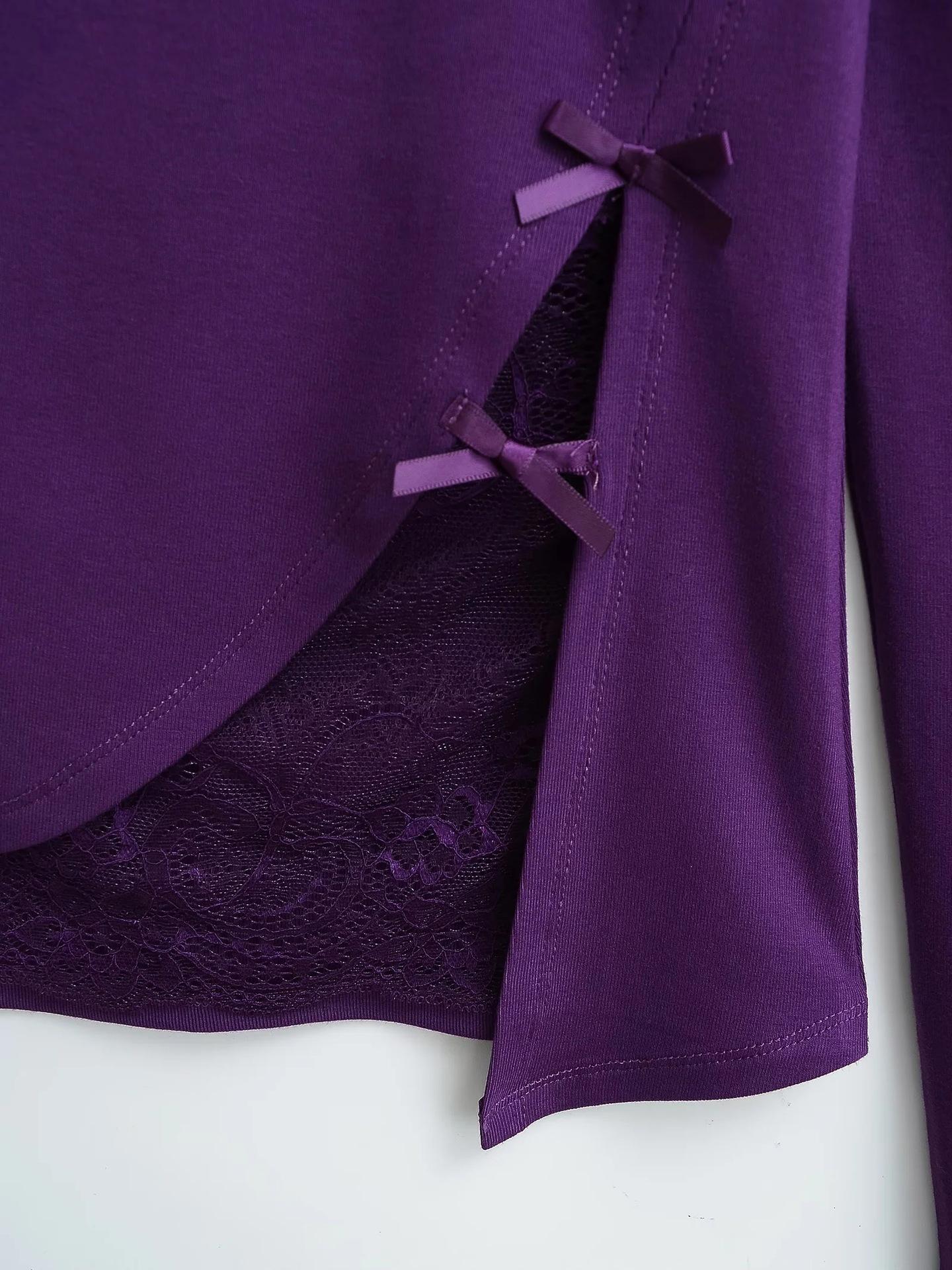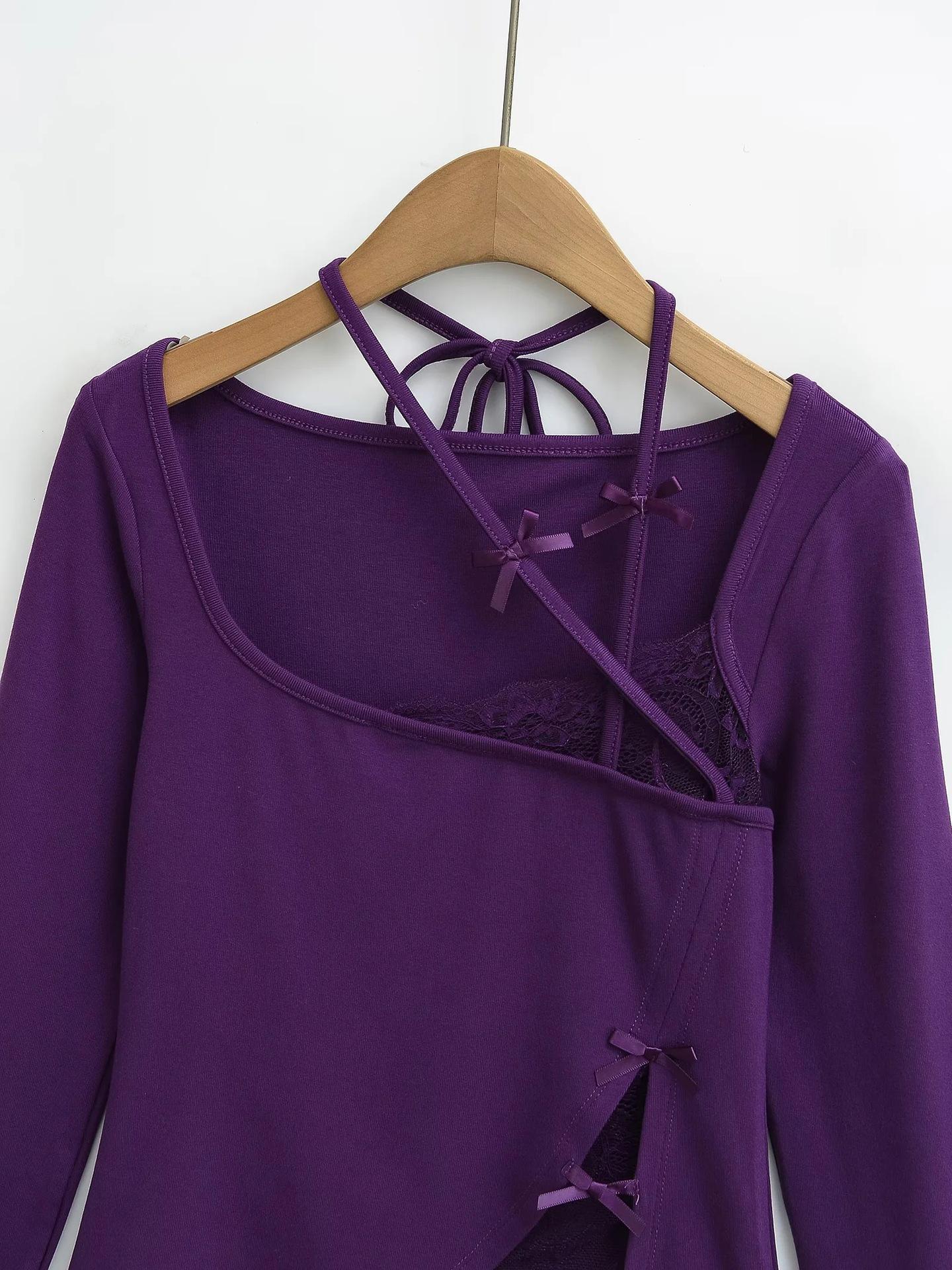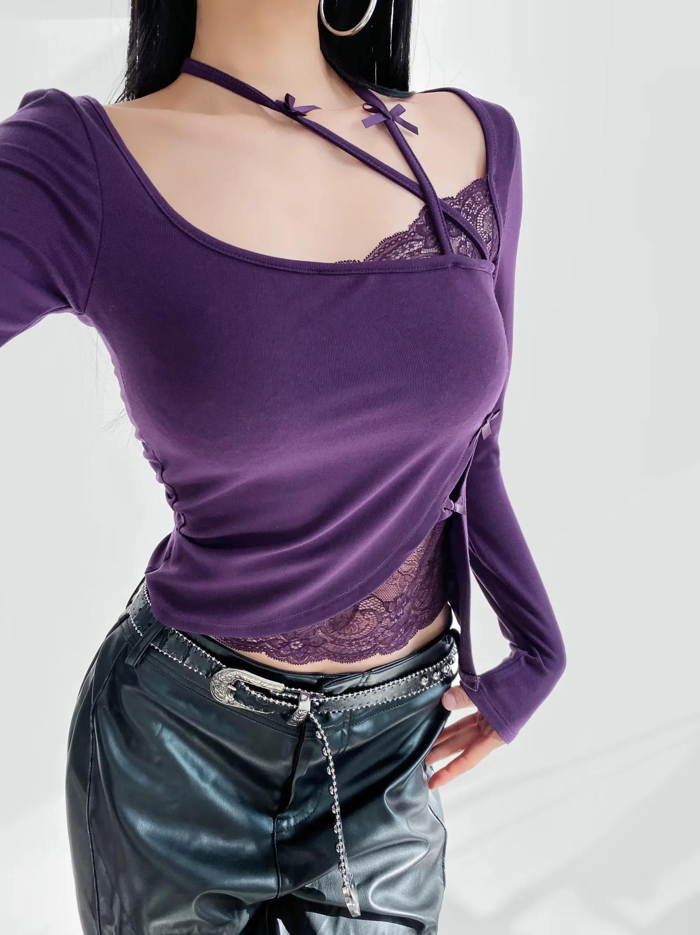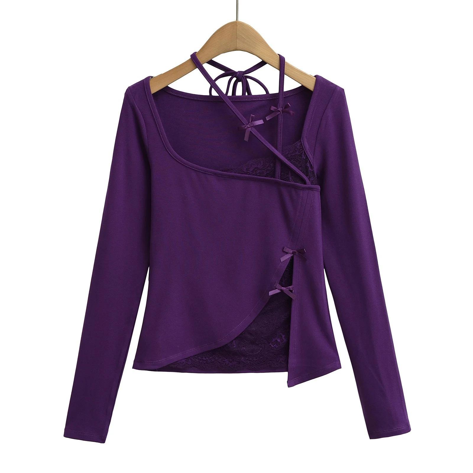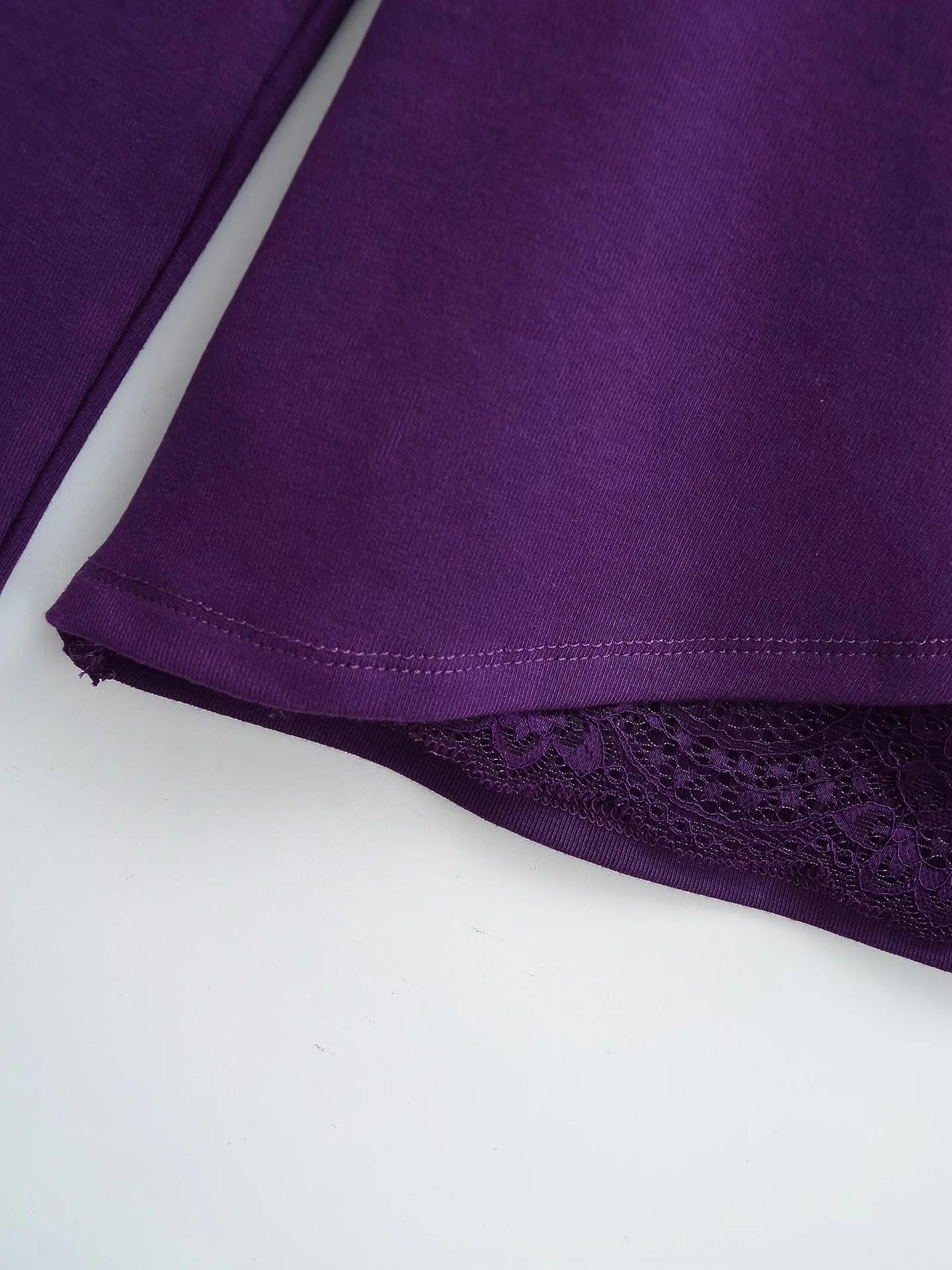 Camiseta morada de manga larga, ajustada y sexy con cuello colgante para mujer, de encaje de primavera, con cintura entallada y base interior.