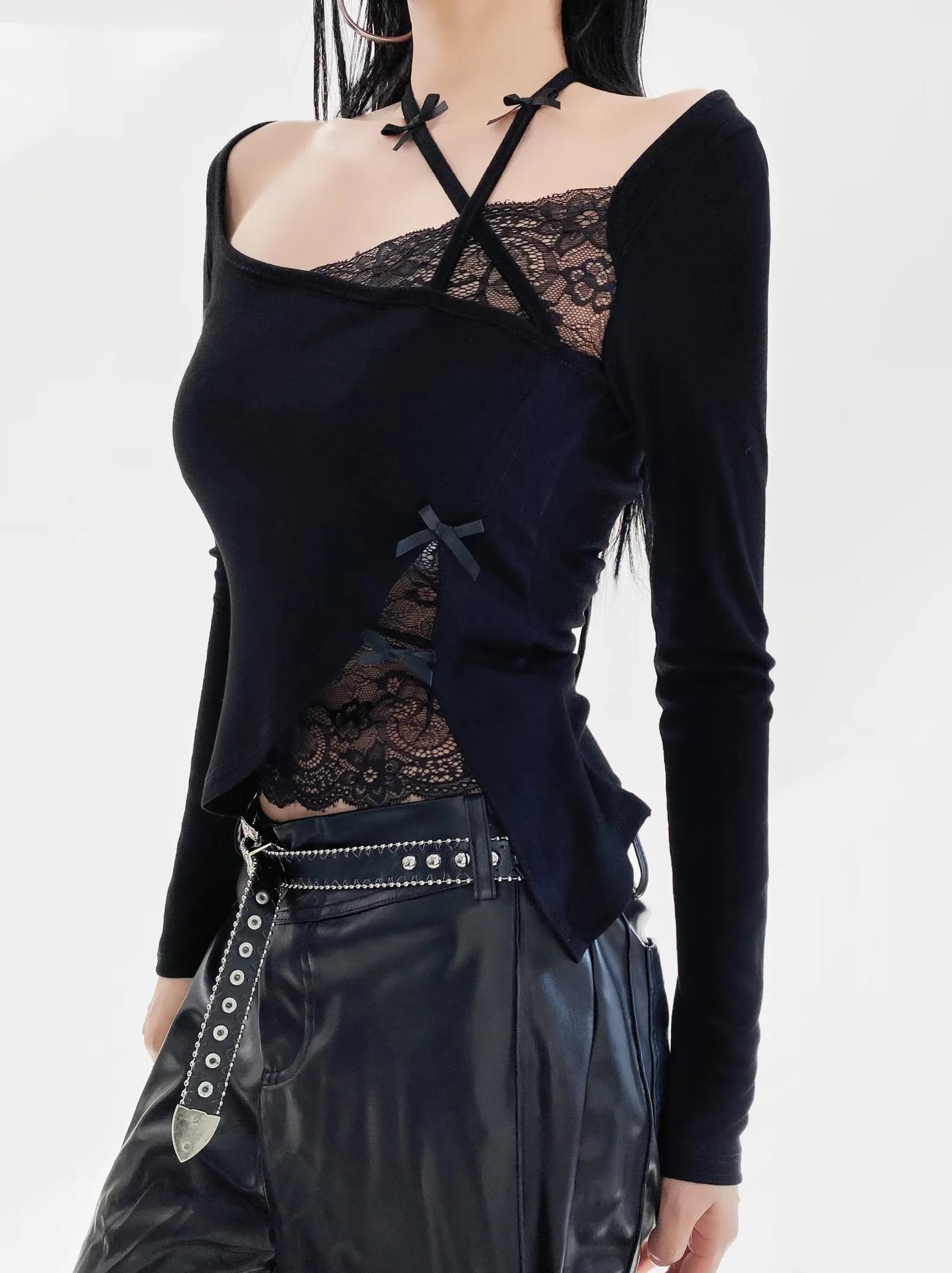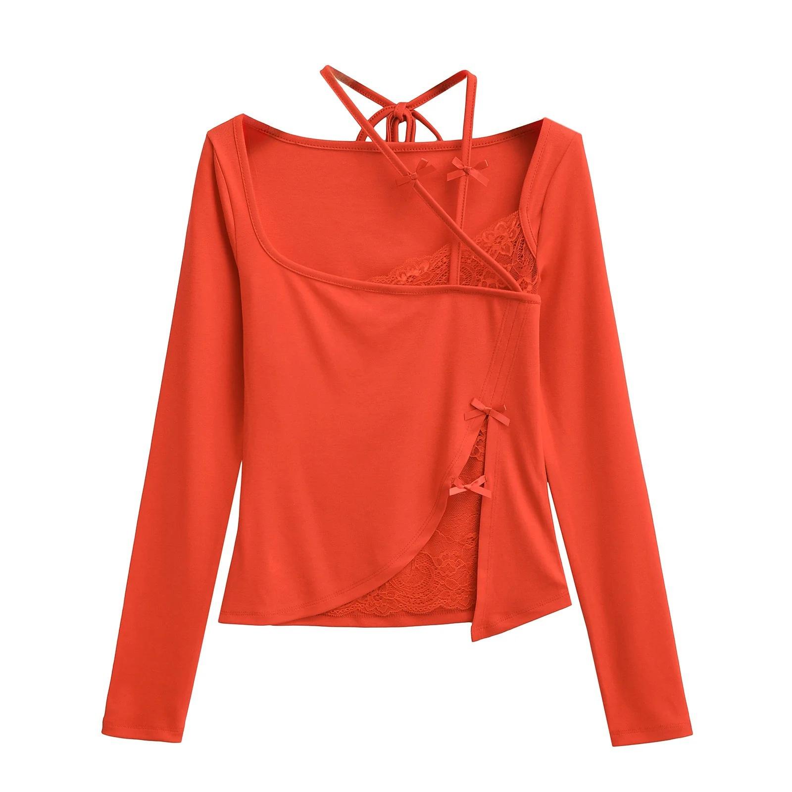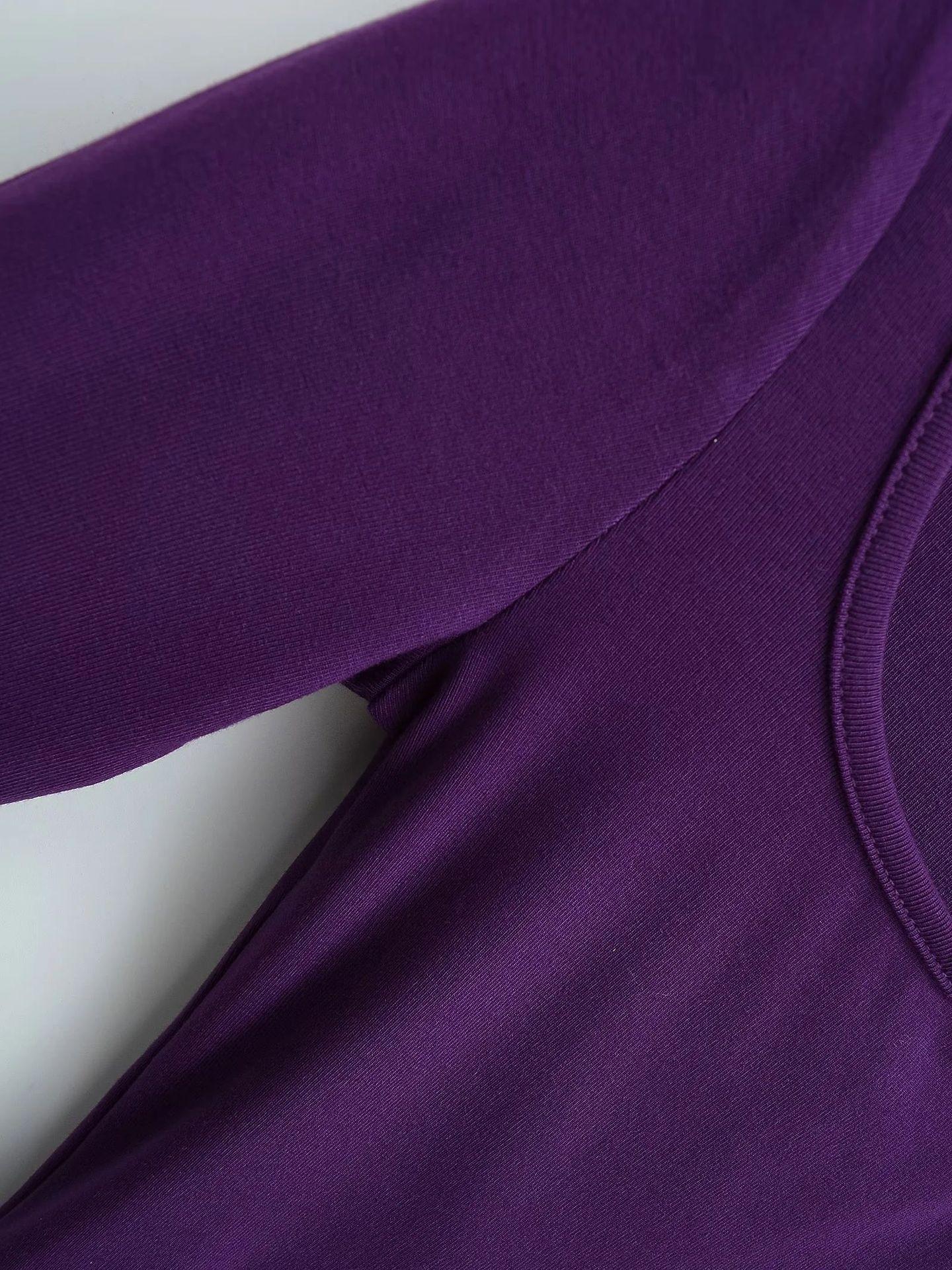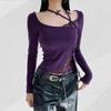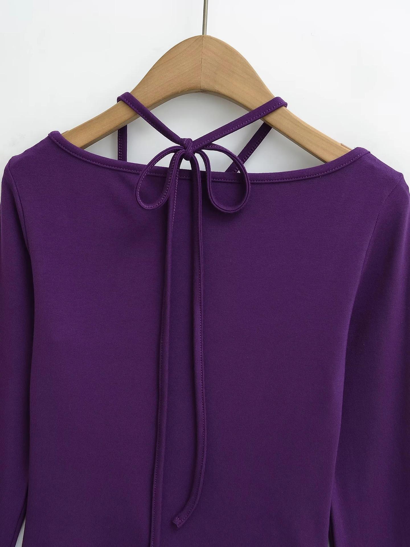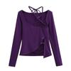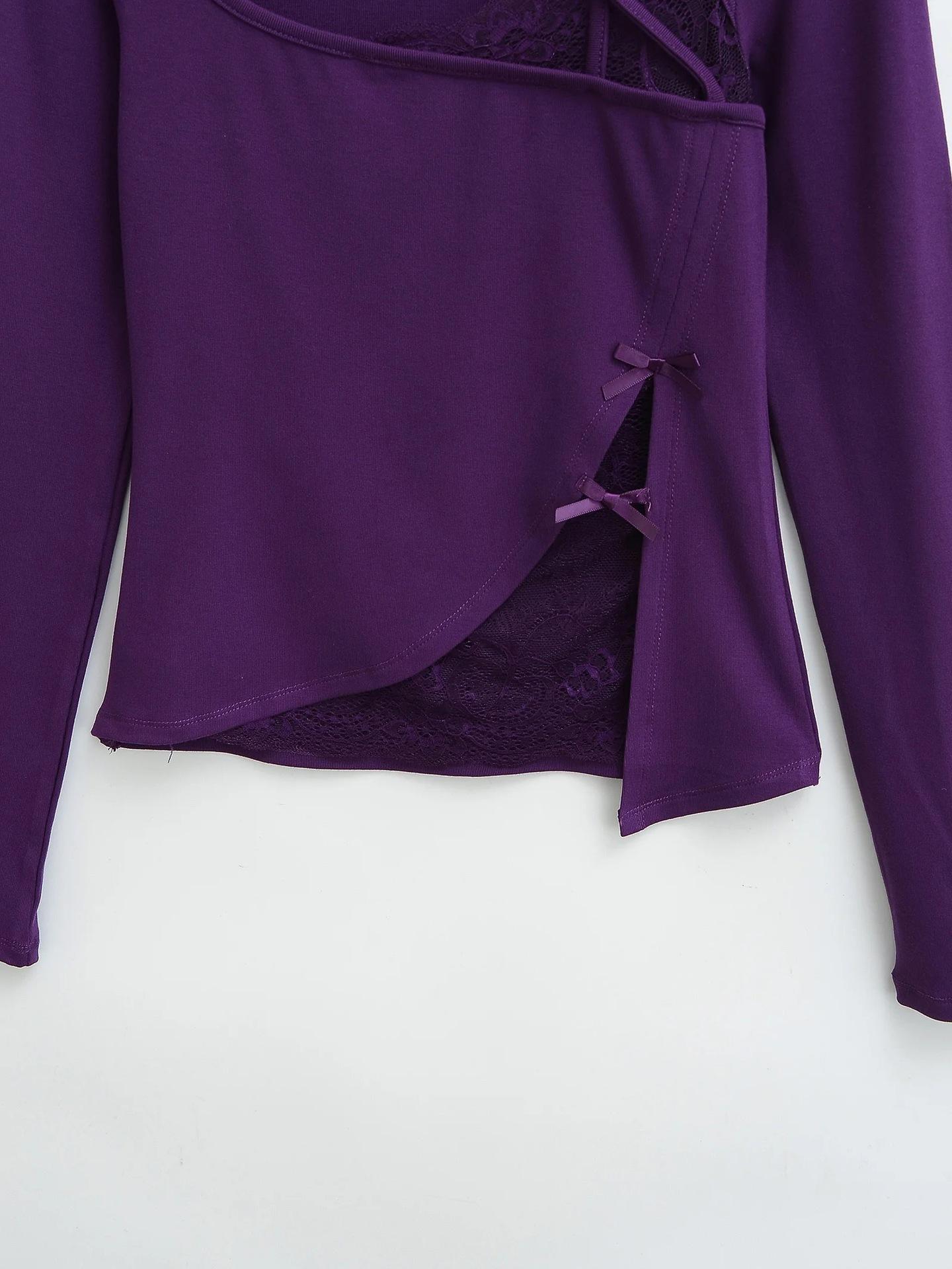 Camiseta morada de manga larga, ajustada y sexy con cuello colgante para mujer, de encaje de primavera, con cintura entallada y base interior.