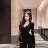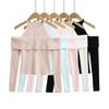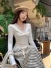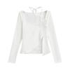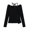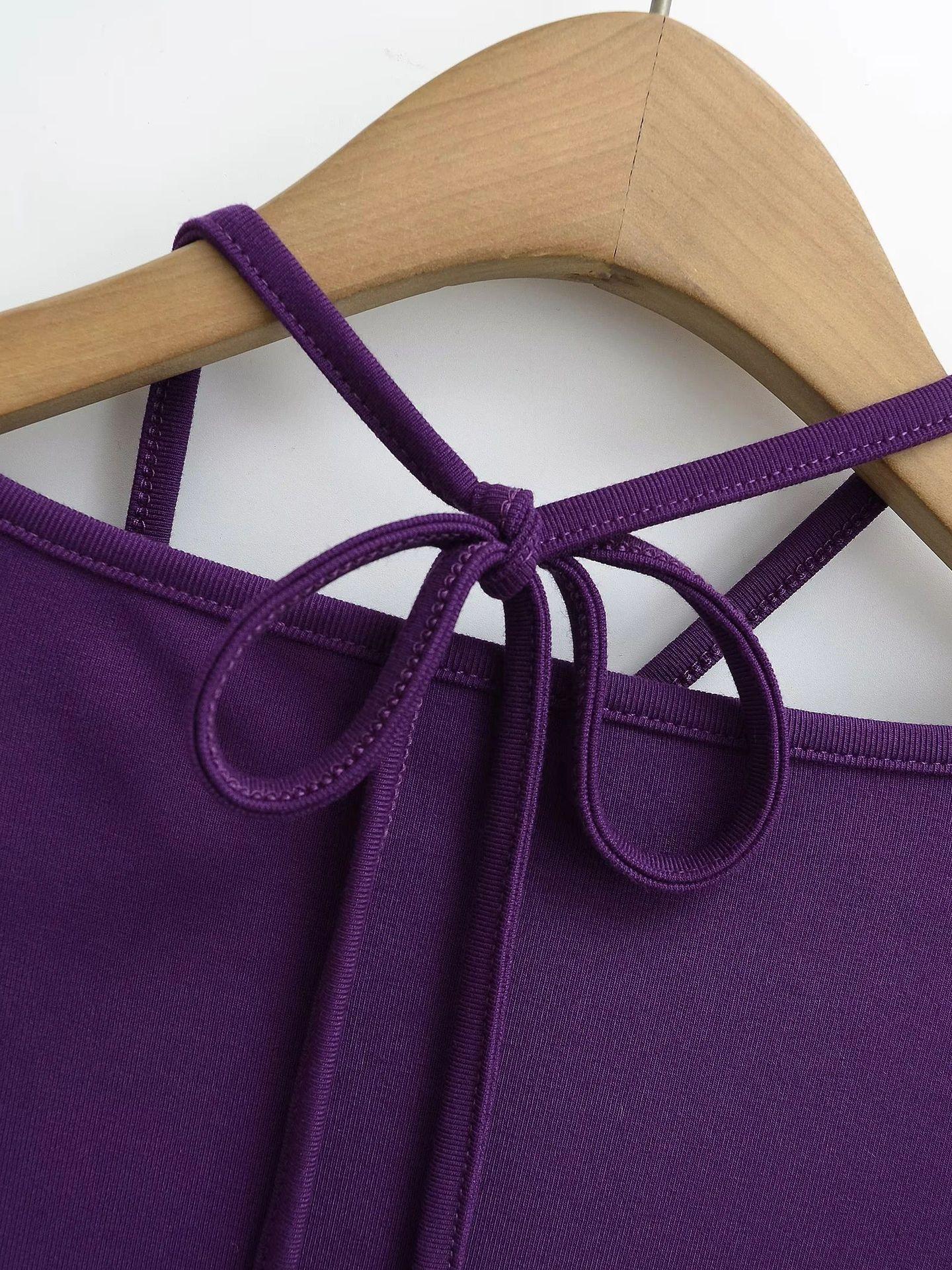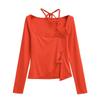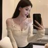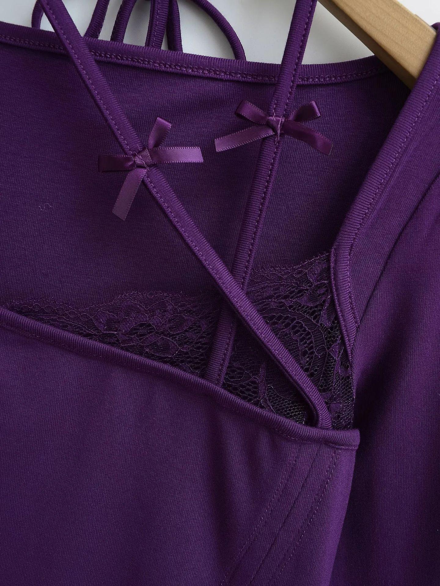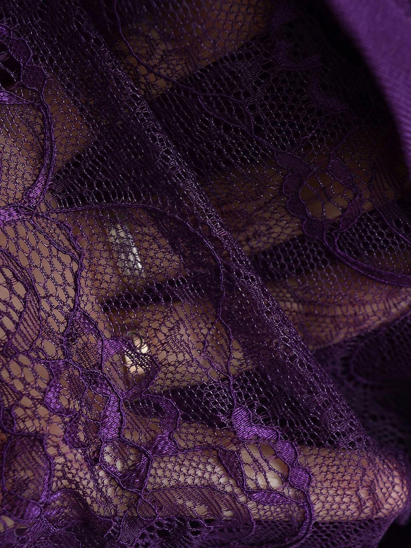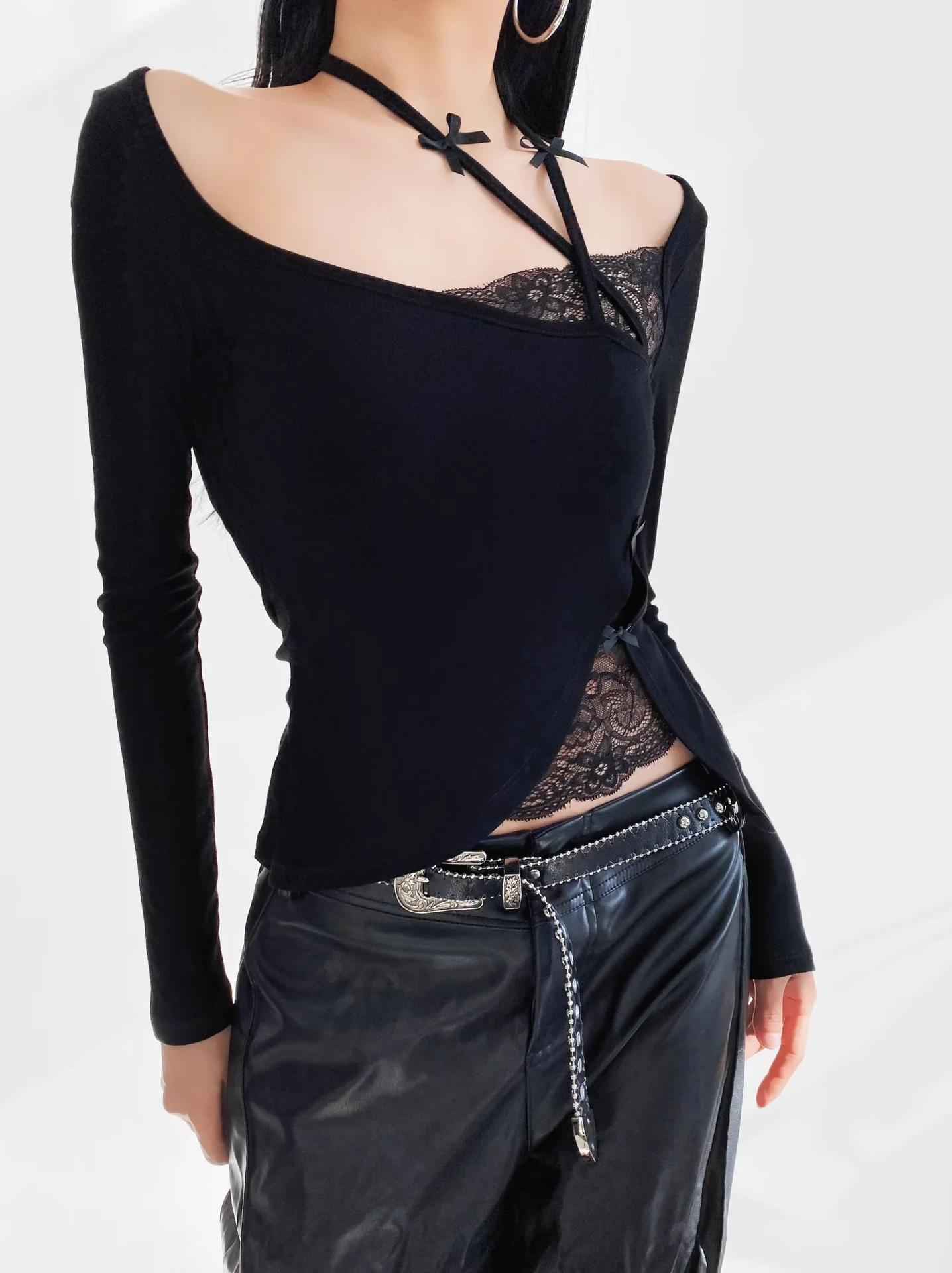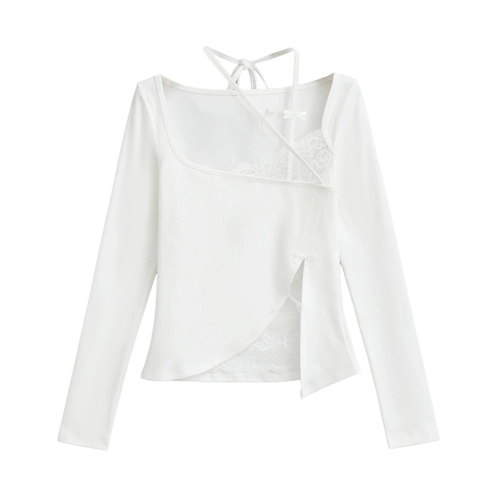 Camiseta morada de manga larga, ajustada y sexy con cuello colgante para mujer, de encaje de primavera, con cintura entallada y base interior.