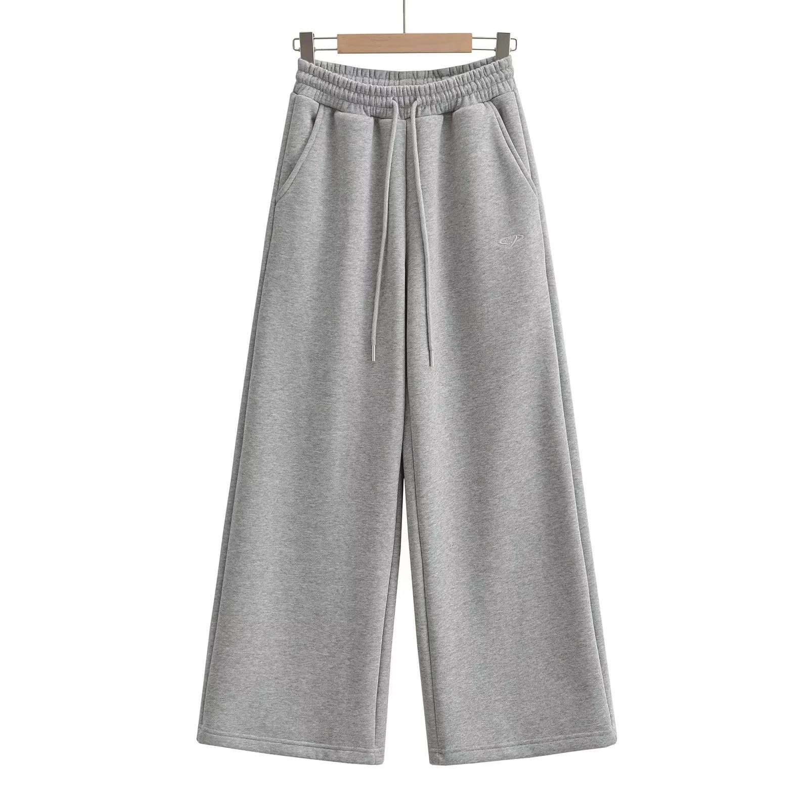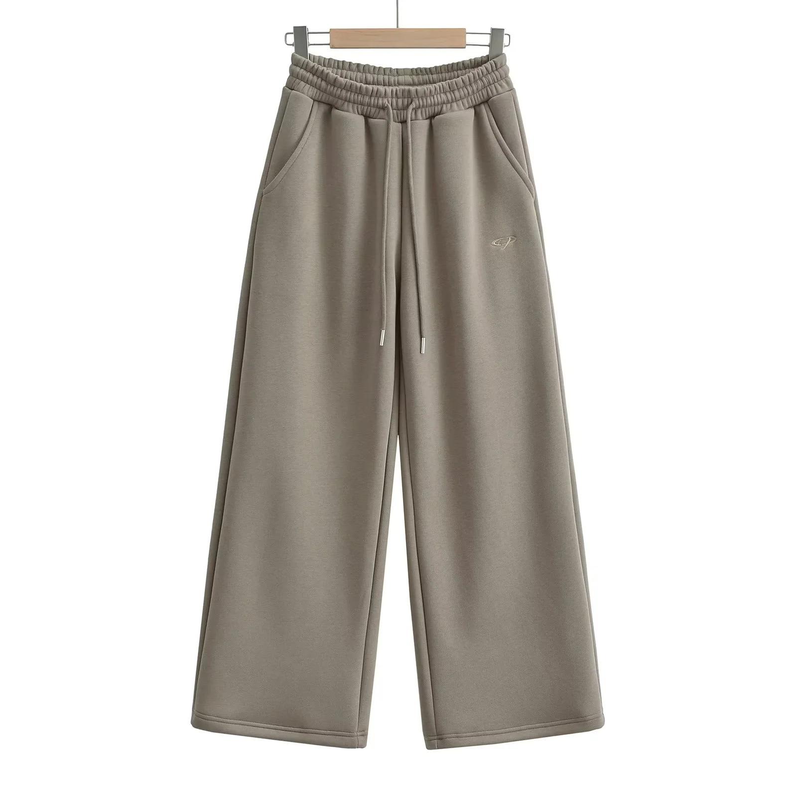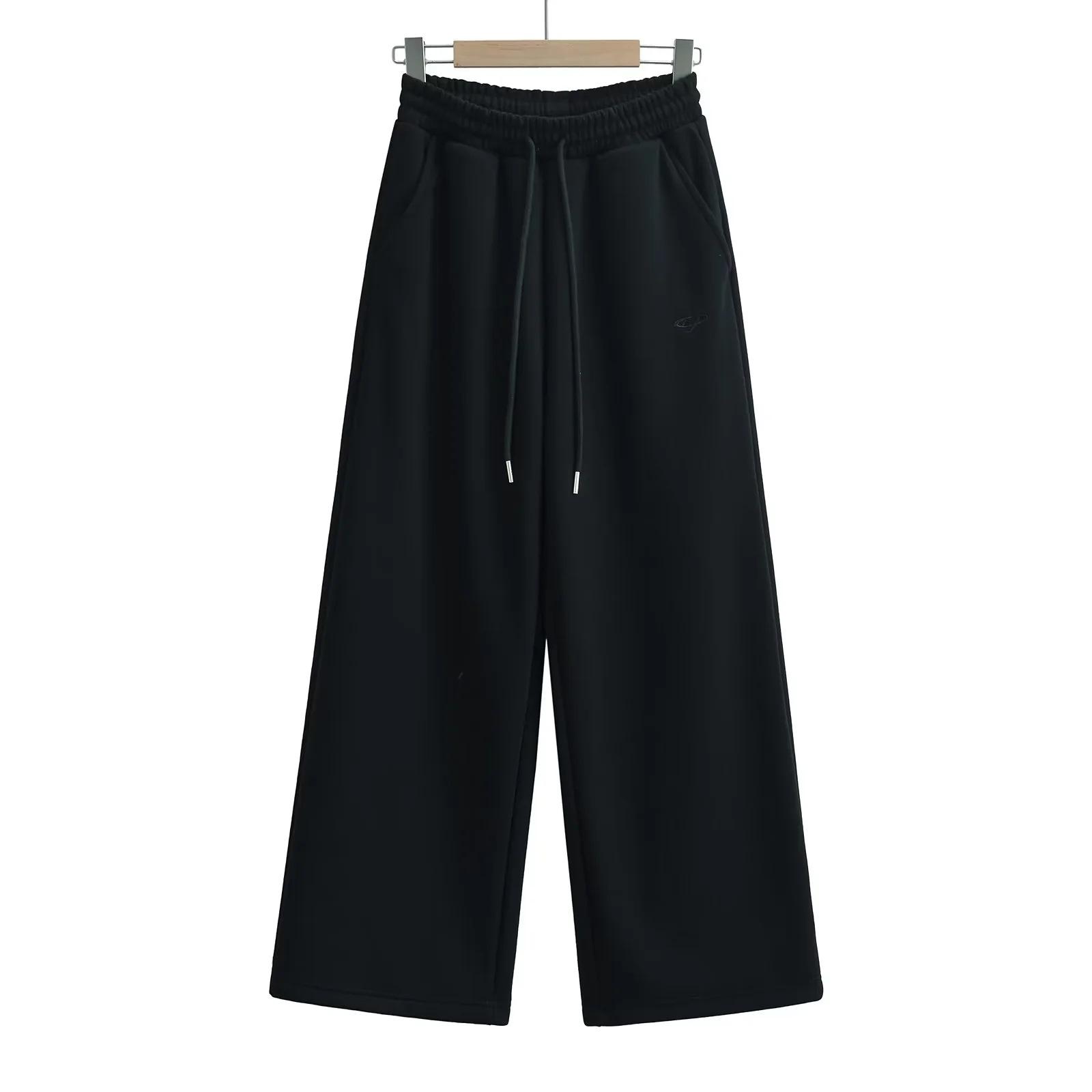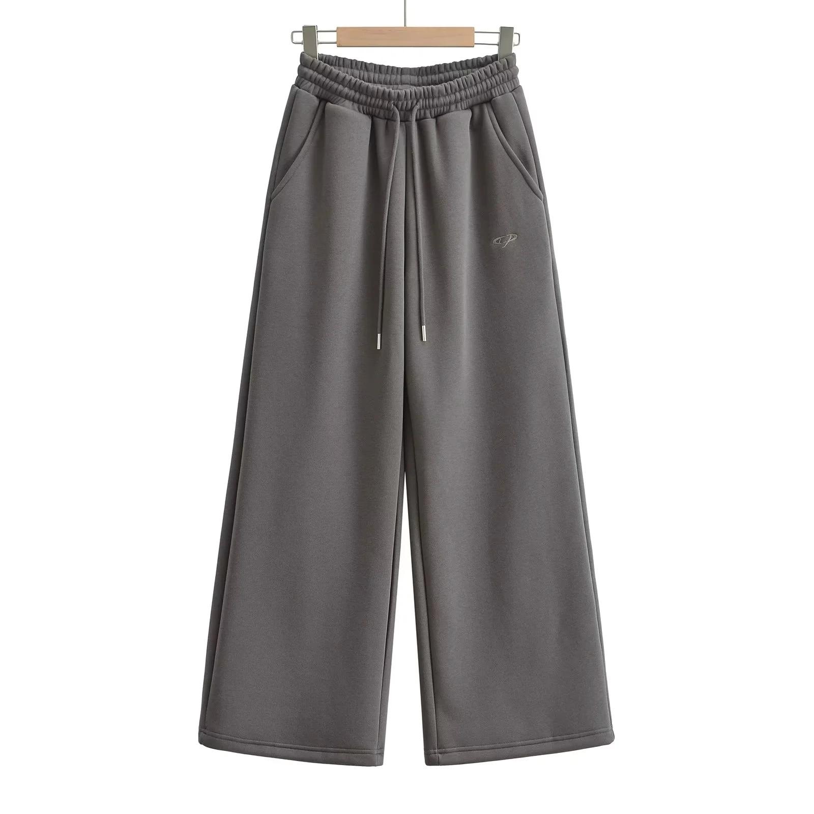 Pantalones casuales de chándal de otoño e invierno europeos y americanos gruesos con forro polar a la moda de cintura alta sueltos de pierna ancha para mujer con cordón bordado de letras