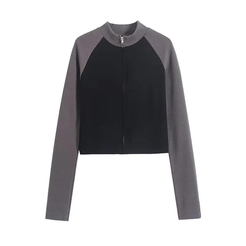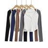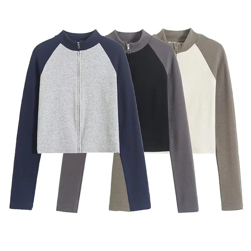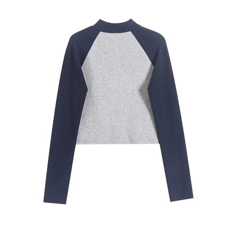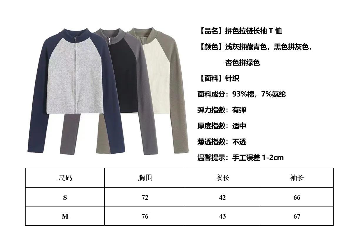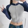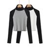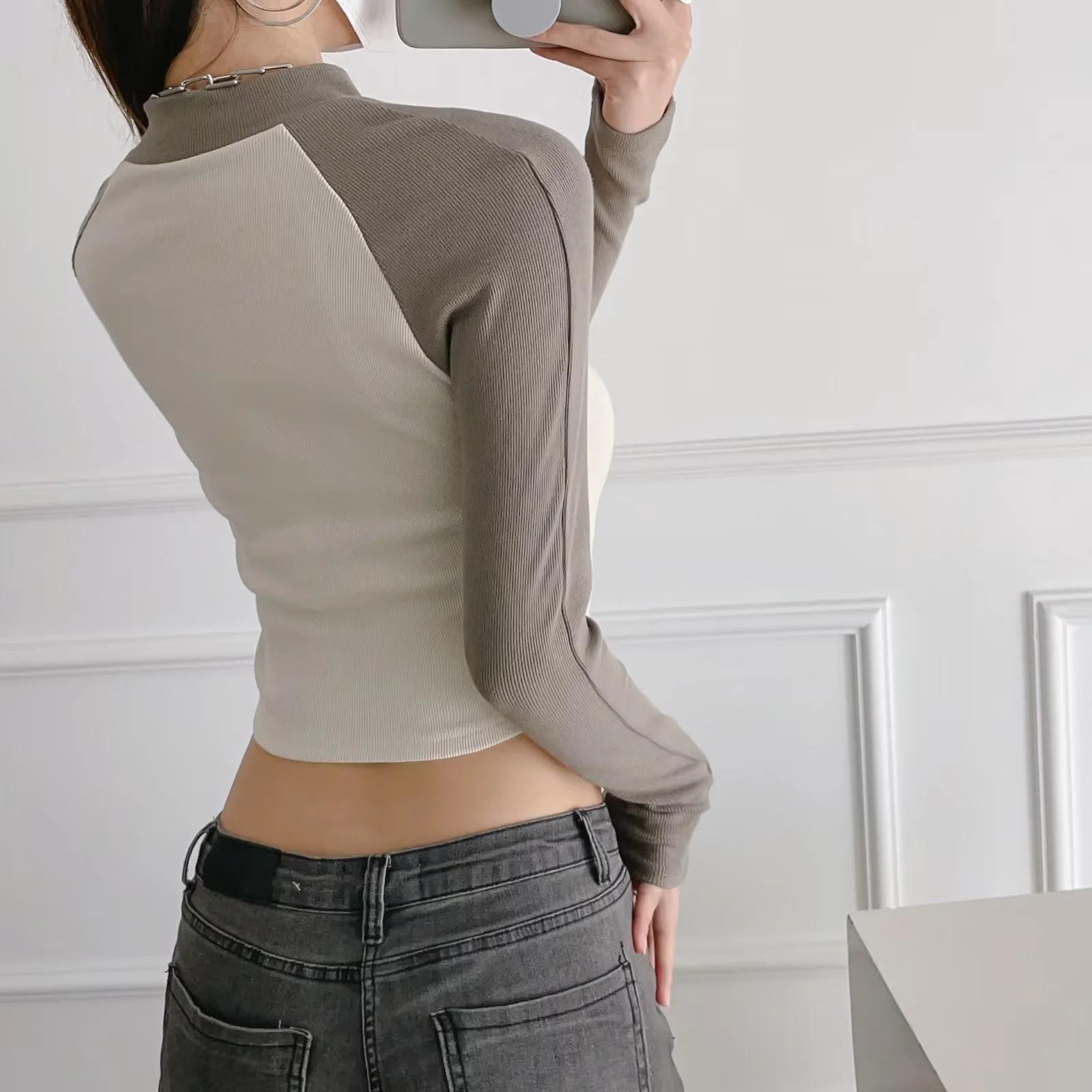 Ropa de mujer de estilo europeo y americano, nueva camiseta de 2022 con costuras de color en contraste y cremallera en la parte inferior, cuello alto medio, camiseta ajustada de celebridad de Internet